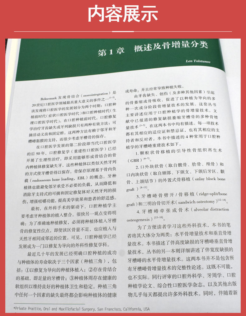 本书从颌骨的解剖学和影像学等口腔种植基础知识开篇,逐一介绍了临床上目前常用的引导骨组织再生(GBR)技术、上颌窦提升术,以及目前运用相对较少的牵张成骨术、自体块状骨移植、带蒂骨皮瓣骨劈开等对口腔临床医生临床技术要求较高的骨增量技术。很后,本书还介绍了种植位点的软组织移植技术和组织工程在牙槽嵴骨增量中应用和发展。