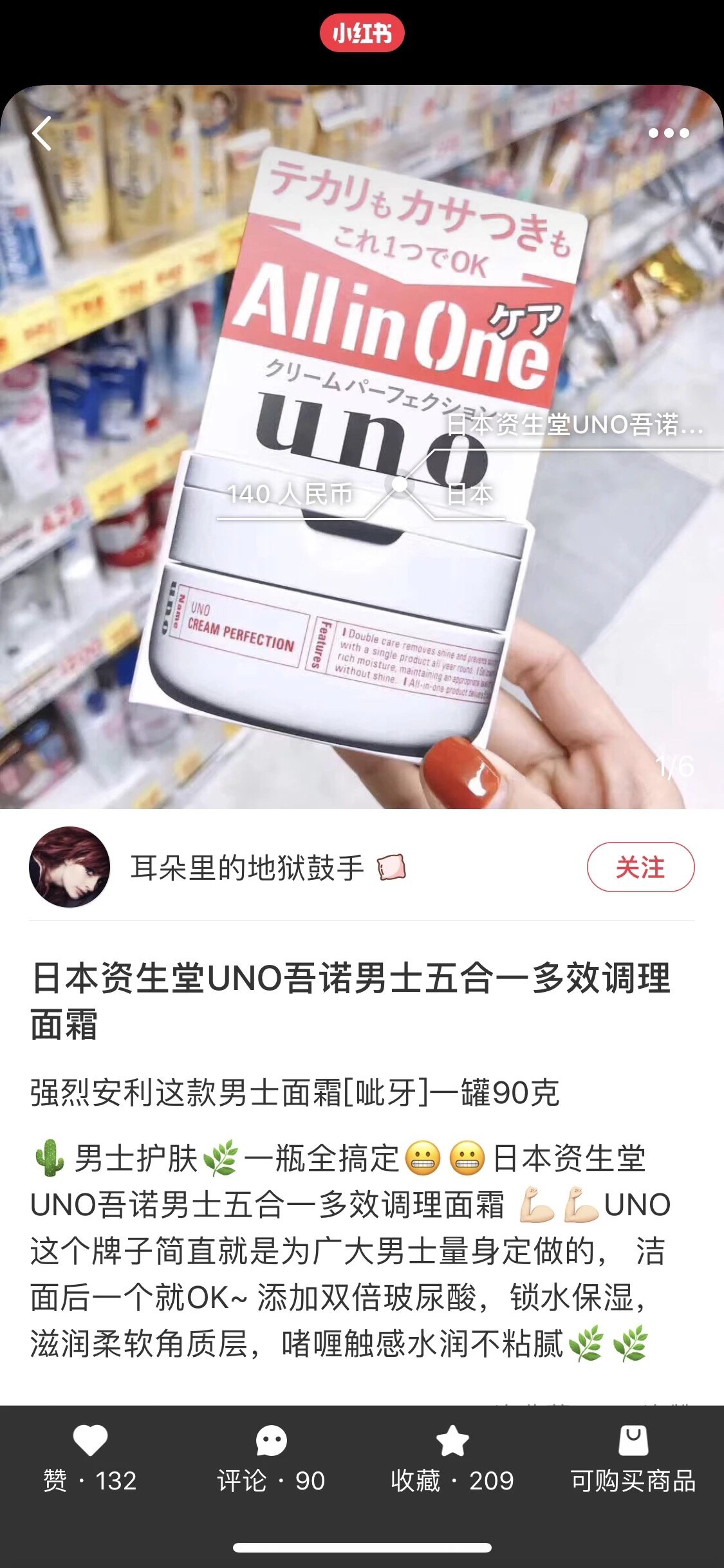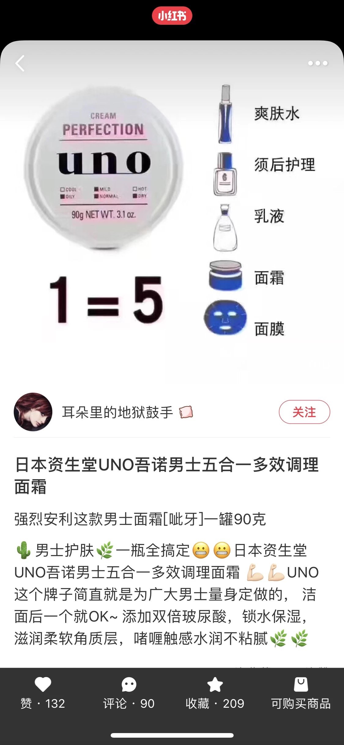 【xiaoy推荐】资生堂UNO吾诺男士保湿面霜清爽控油补水五合一护肤乳液霜90g