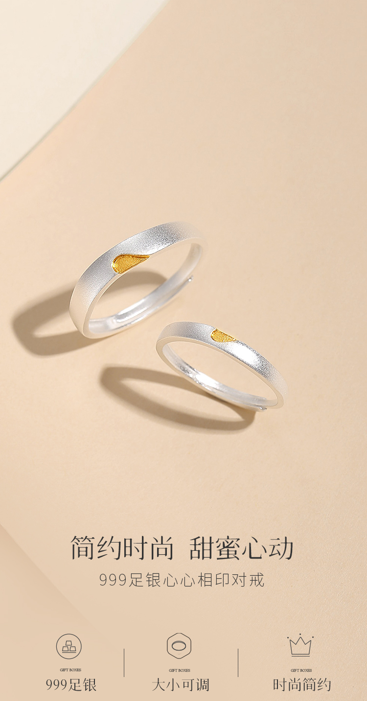 Winy 999足银心心相印对戒情侣款配证书浪漫表白节日礼物