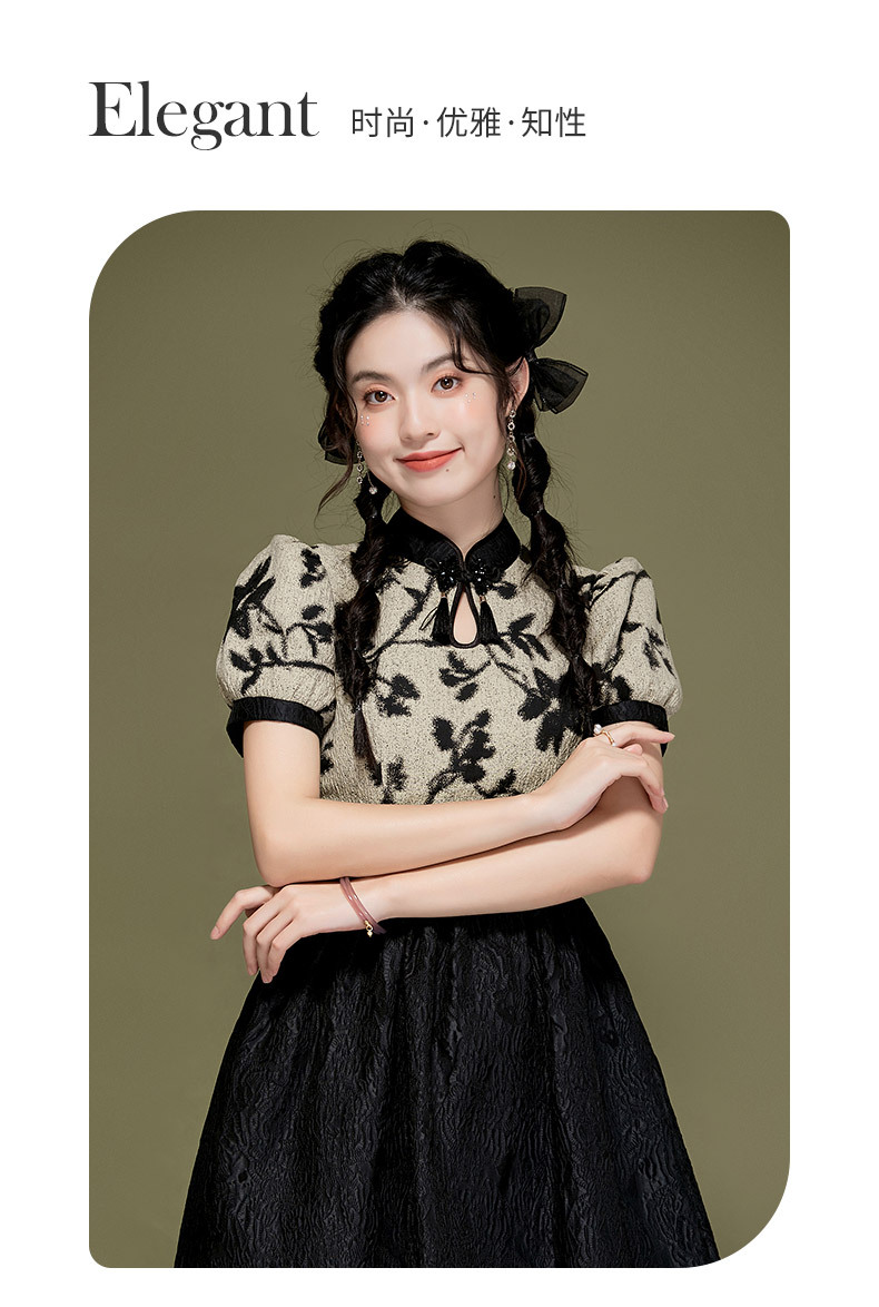新中式半高领短袖小衫,网纱提花T恤LA43907