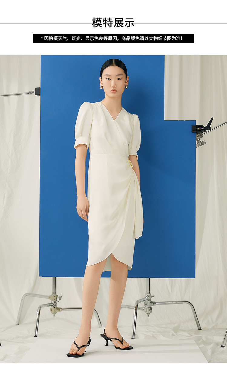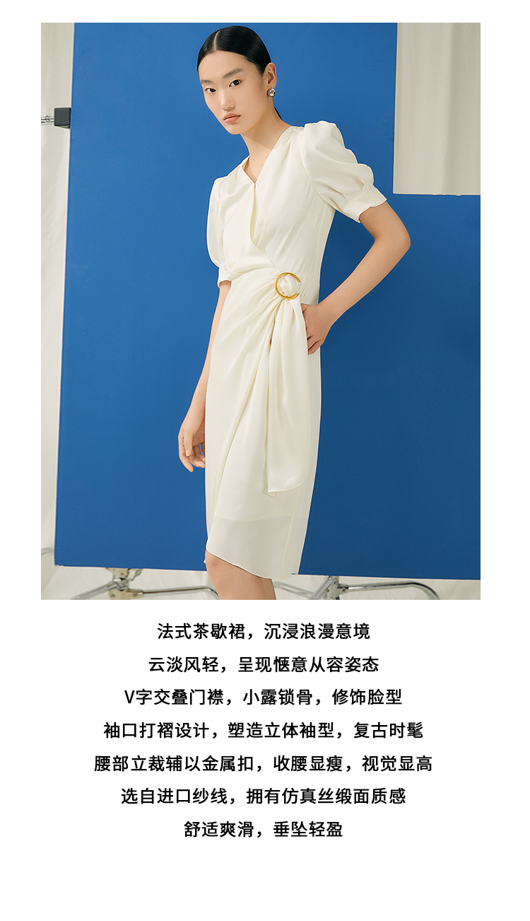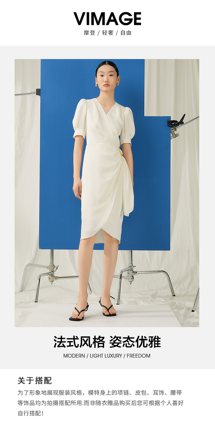 VIMAGE纬漫纪夏季新品纯色百搭洋气褶皱收腰连衣裙V1907527