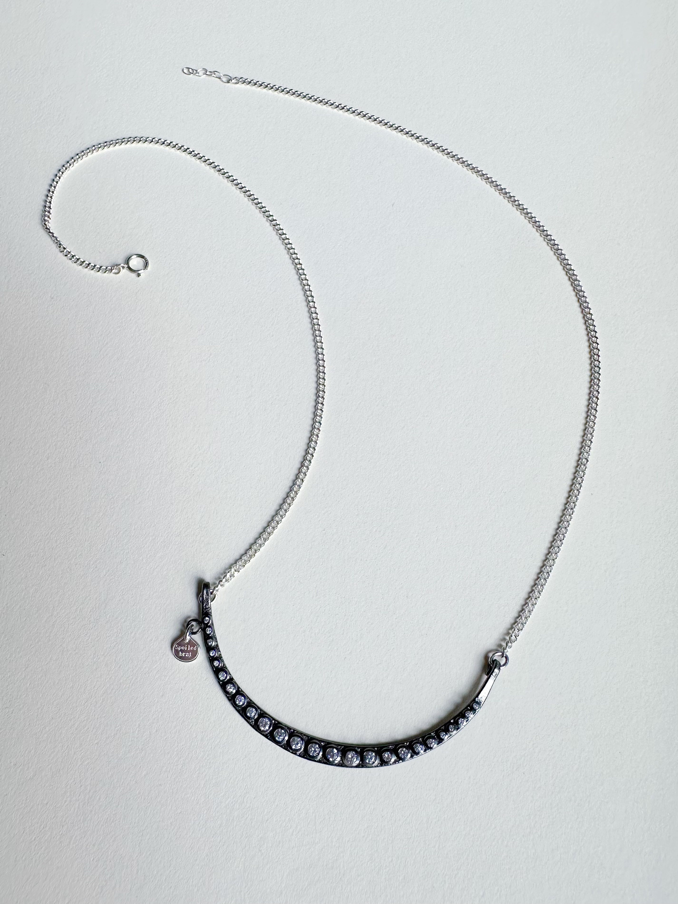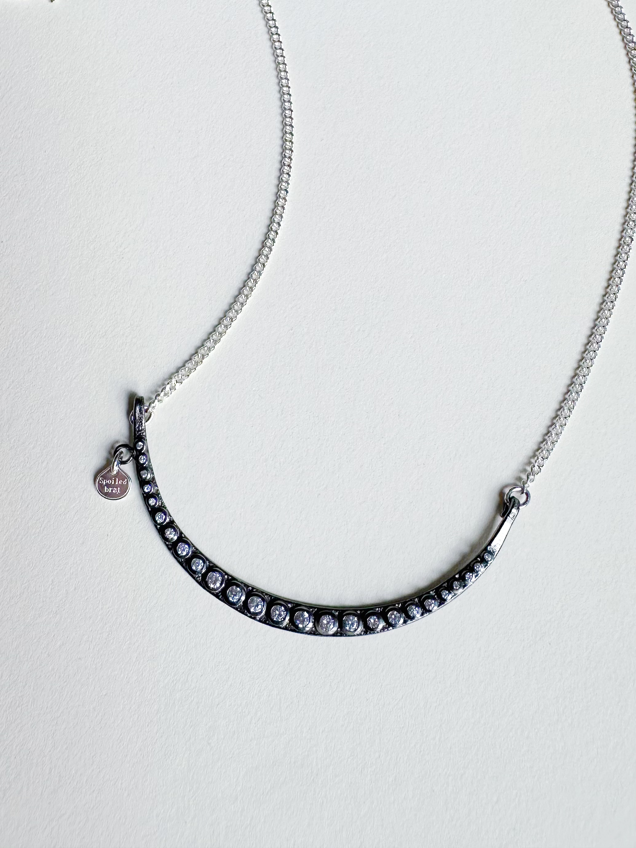 月亮在微笑系列纯银锆石项链。复古自然的做旧感搭配锆石的闪亮呈现出反差。像是月亮在夜空里有闪烁的星星陪伴。