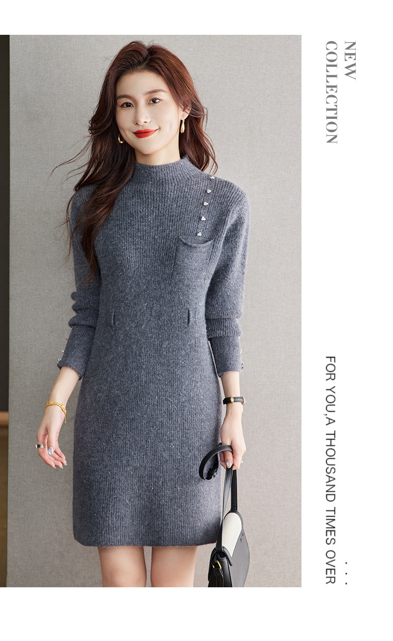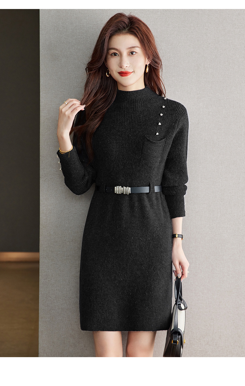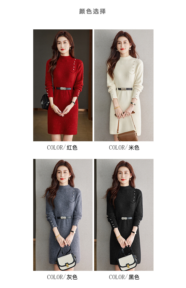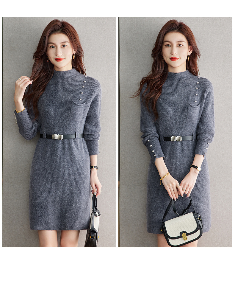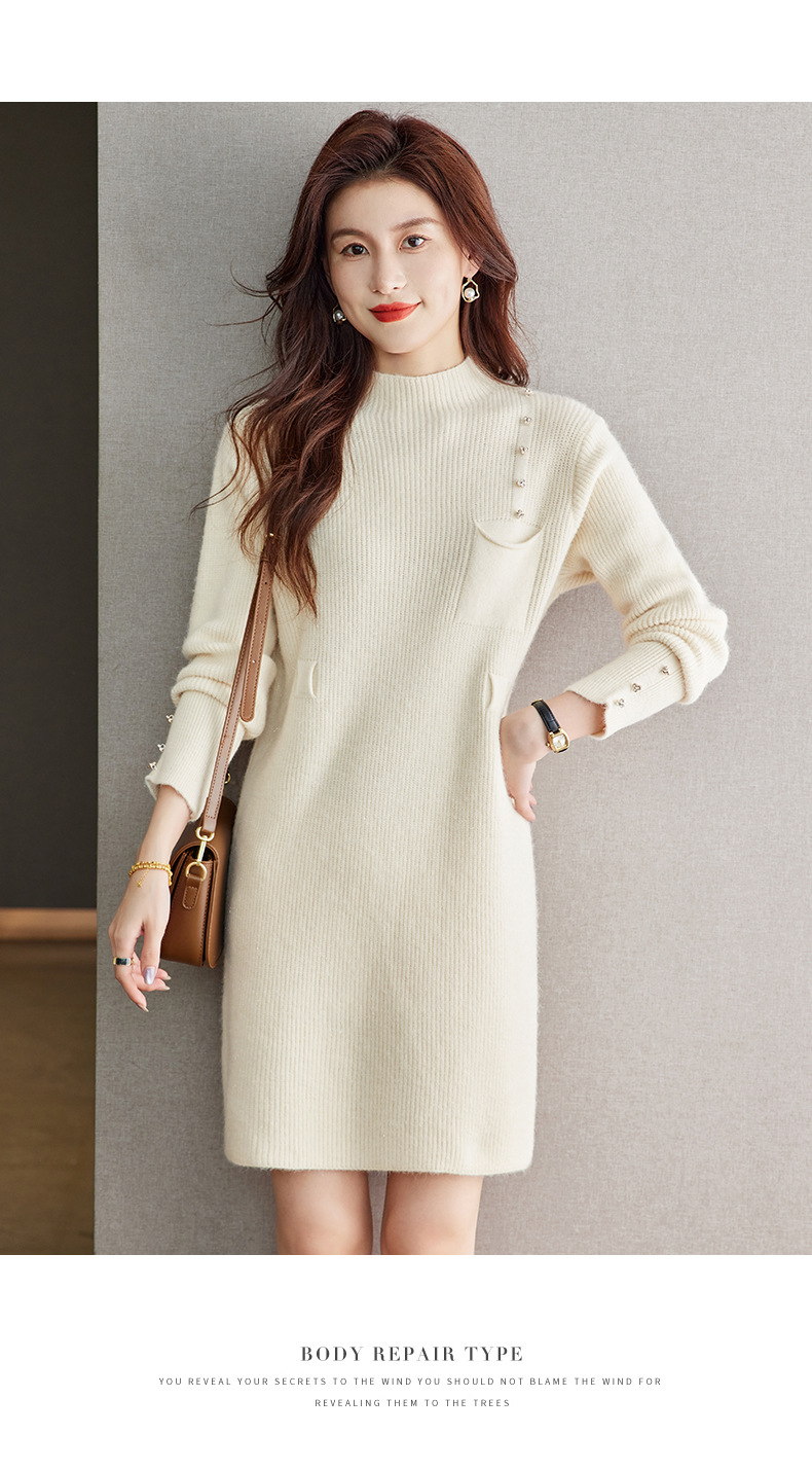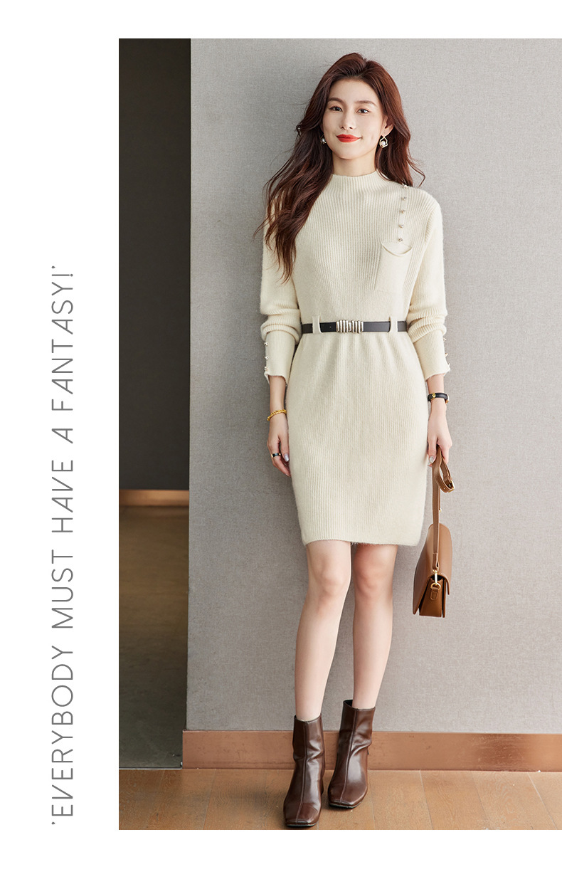 CC-22-205好看半高领毛衣裙女中长款2024秋冬新款遮屁股小个子针织打底裙女