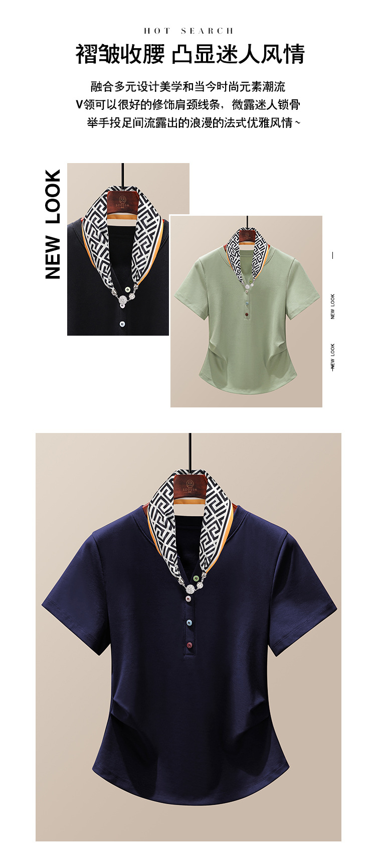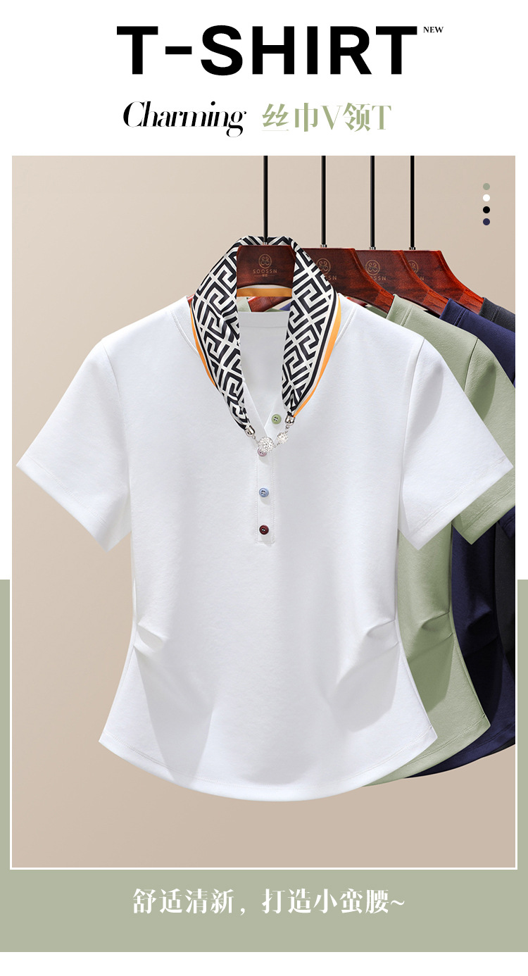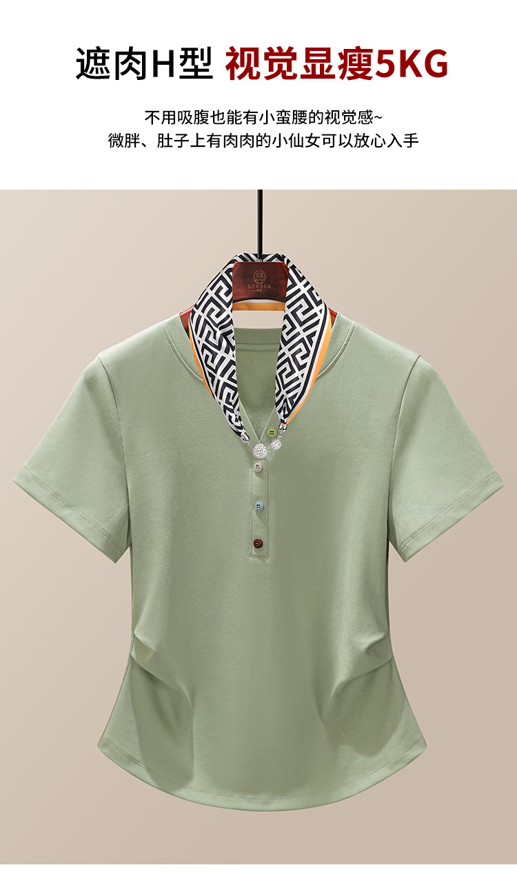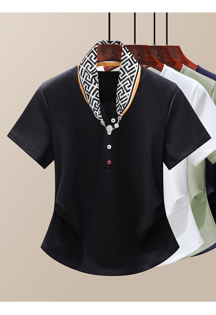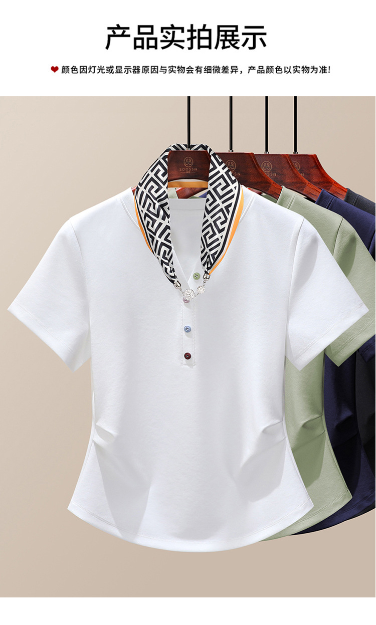 「自」全新升级【铂金会员109/天猫149/差价40】(52412)洛诗琳丝巾彩色纽扣t恤2025年夏季新款高级感修身显瘦上衣