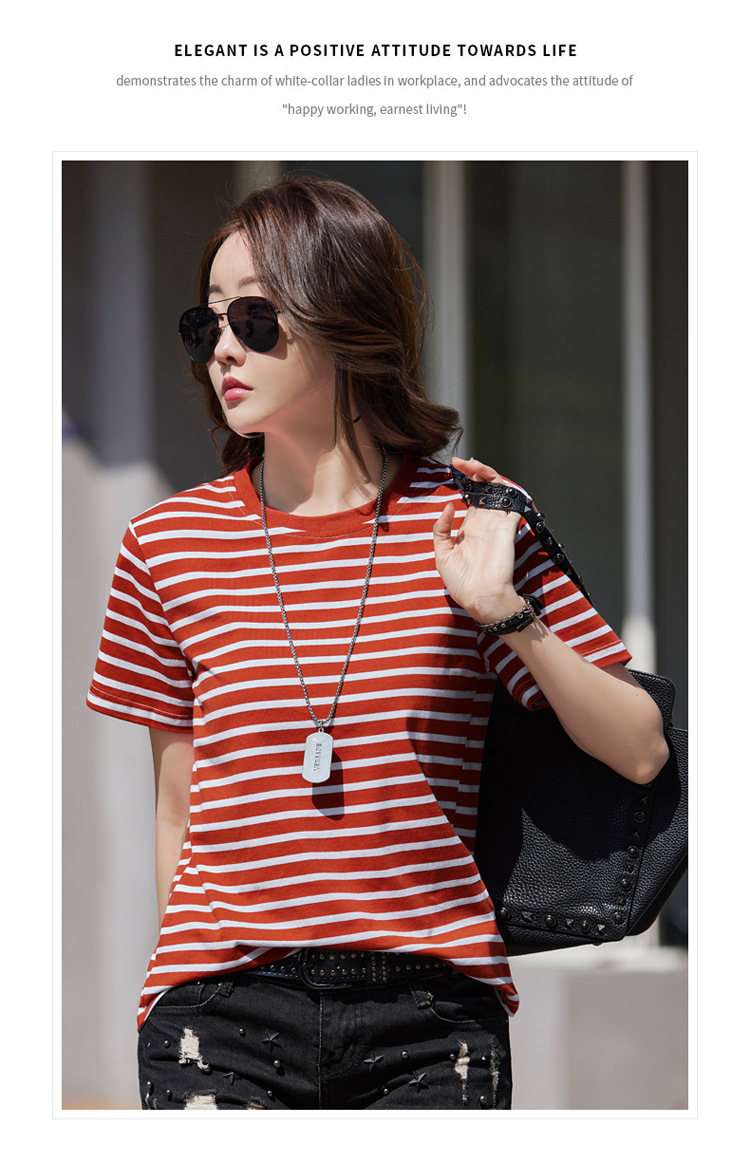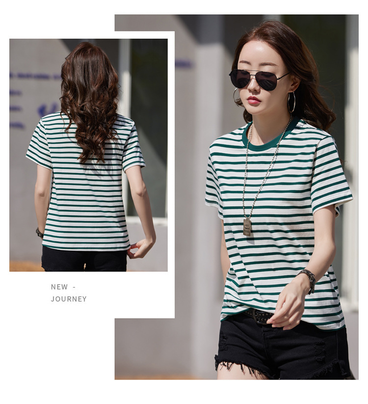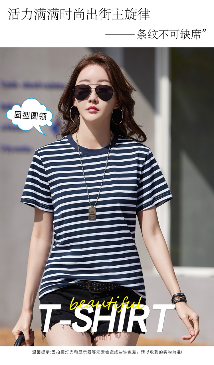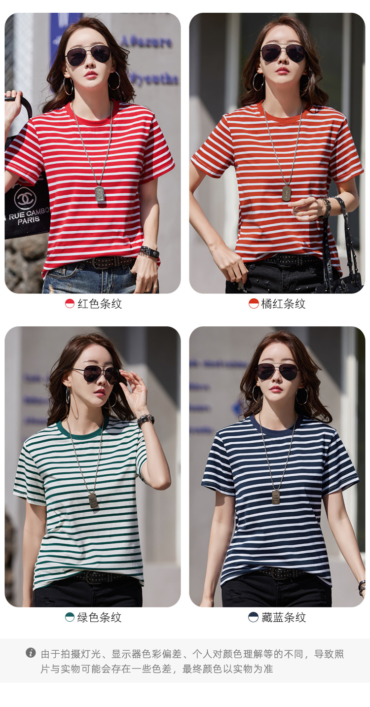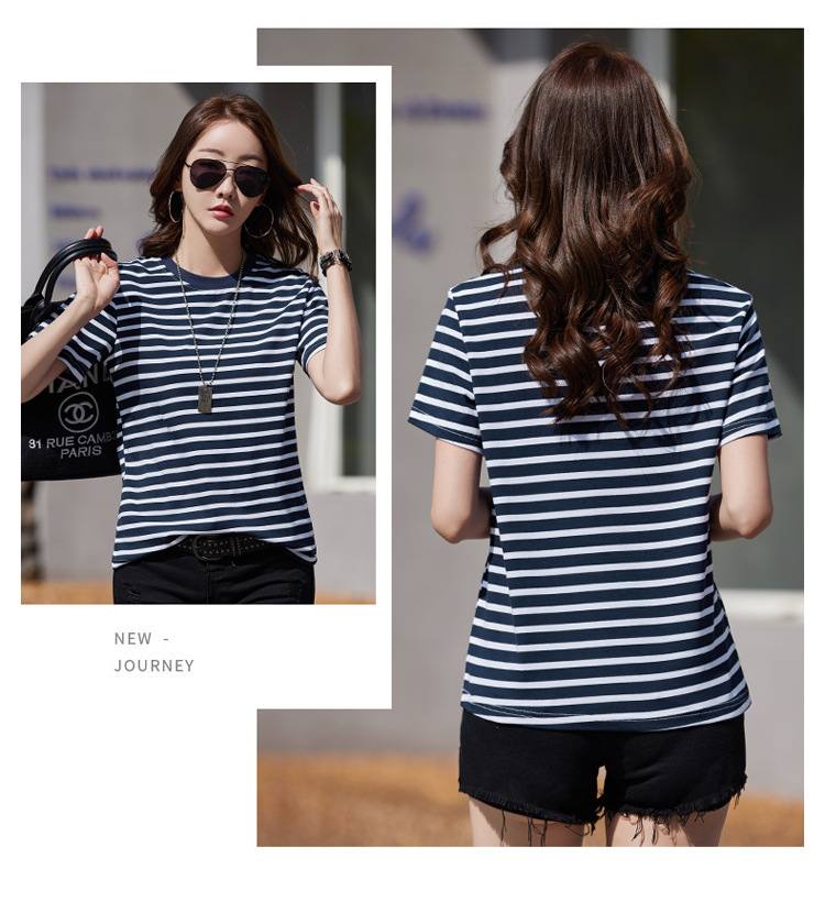 雀说短袖T恤女纯棉夏季韩版宽松大码条纹圆领上衣服AL9847