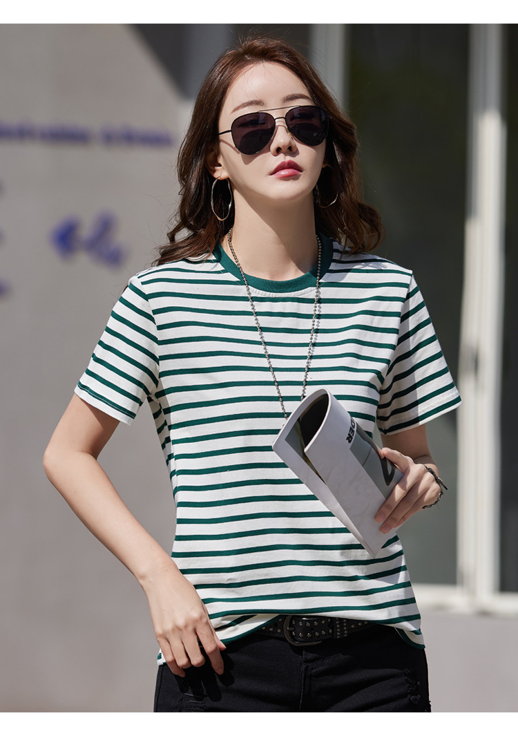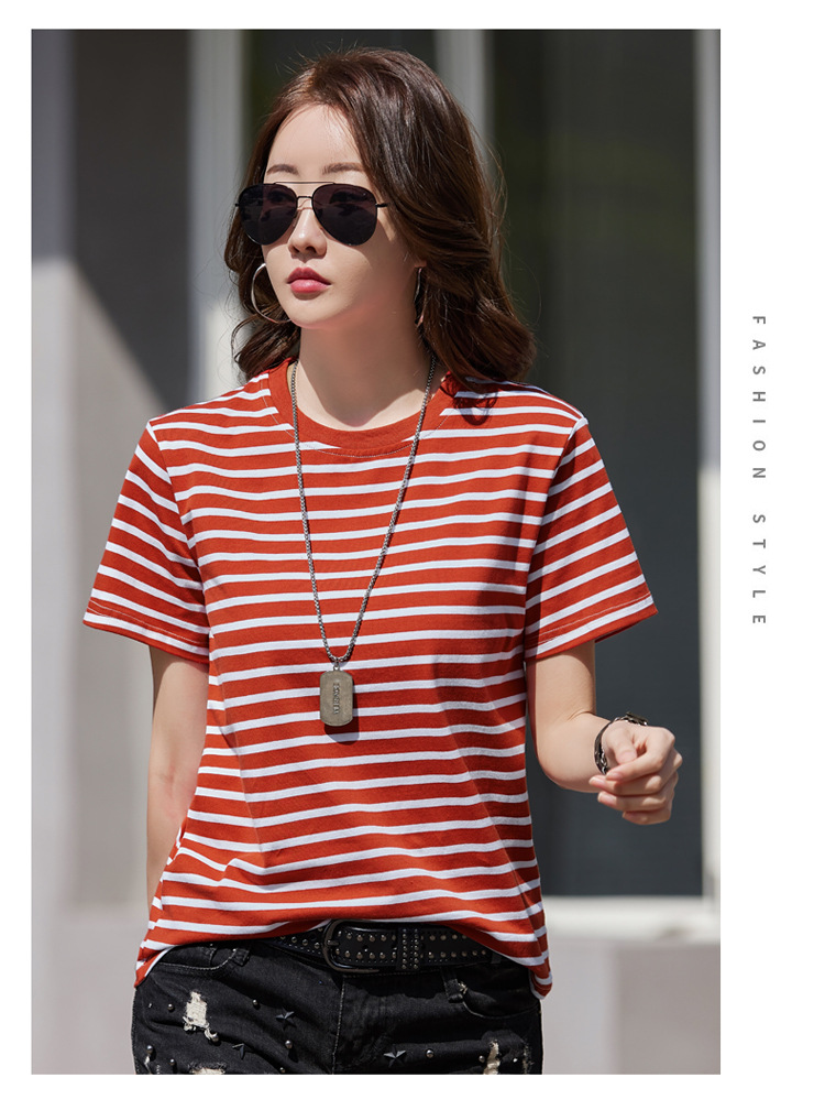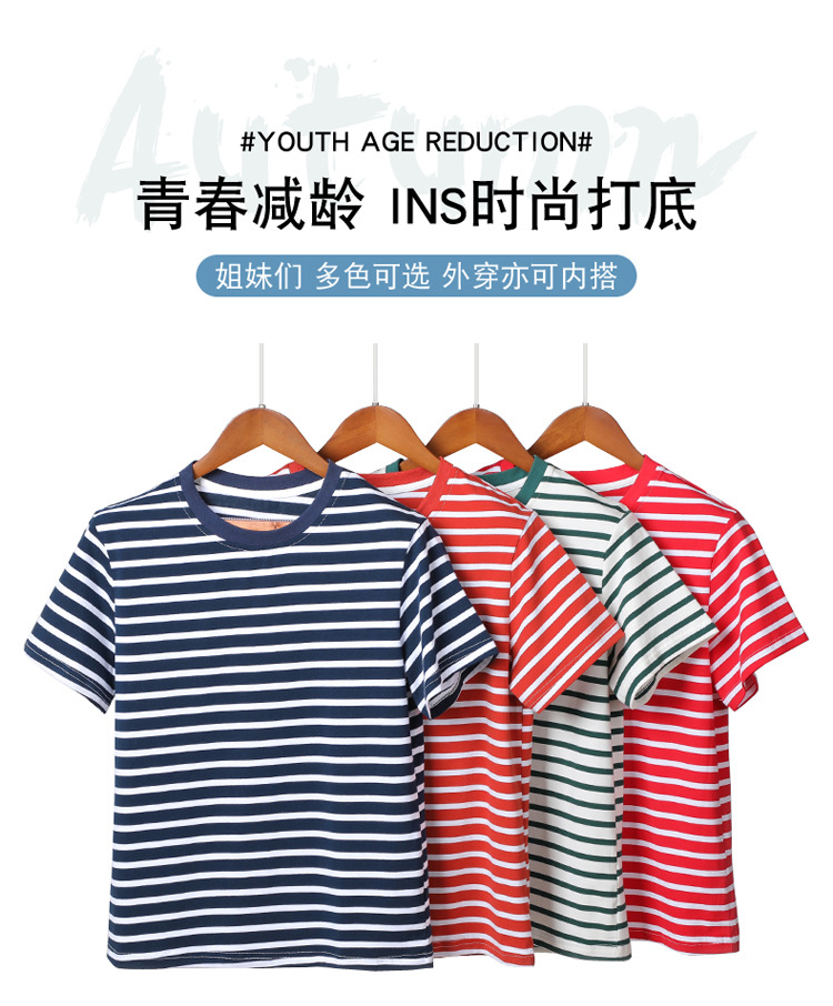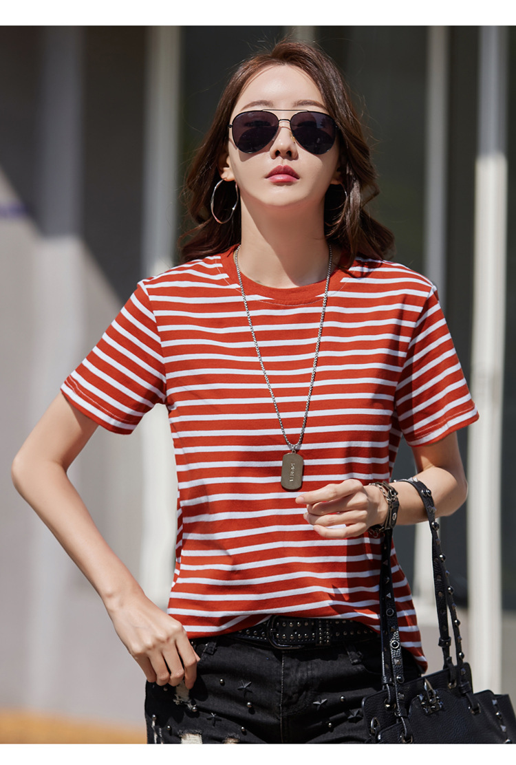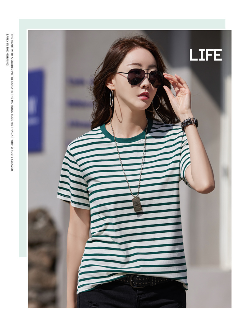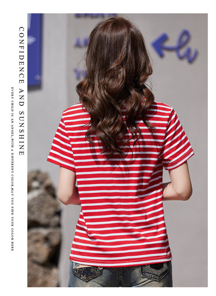 雀说短袖T恤女纯棉夏季韩版宽松大码条纹圆领上衣服AL9847