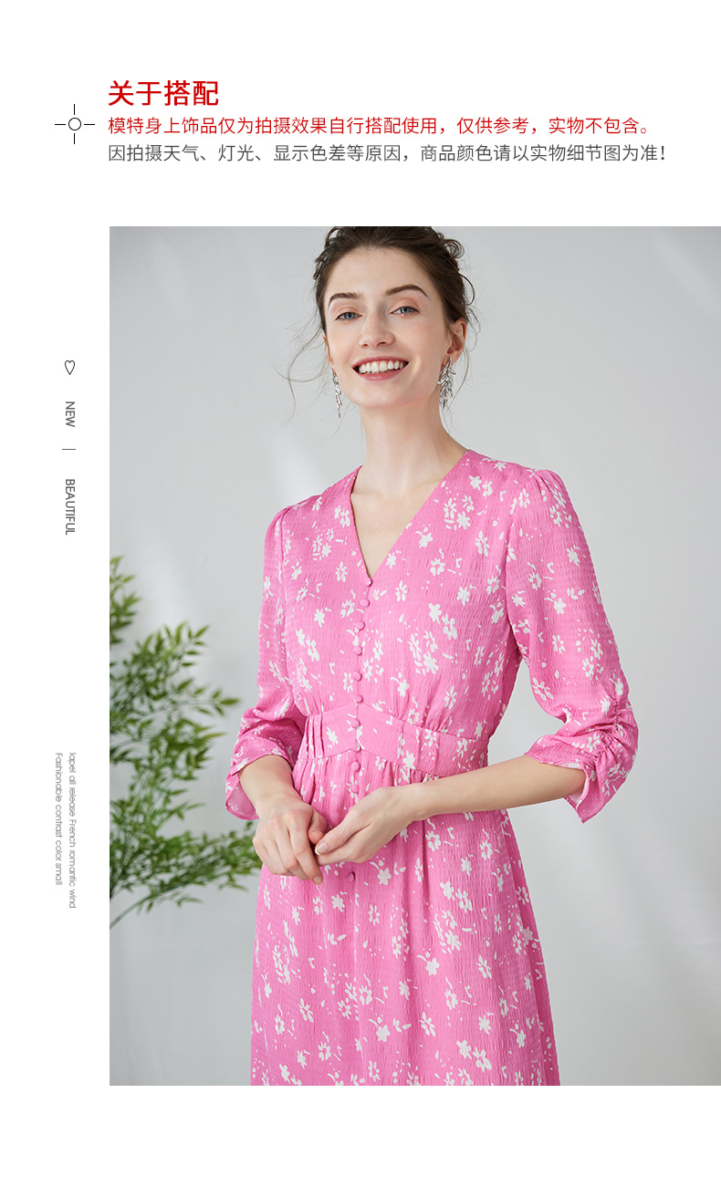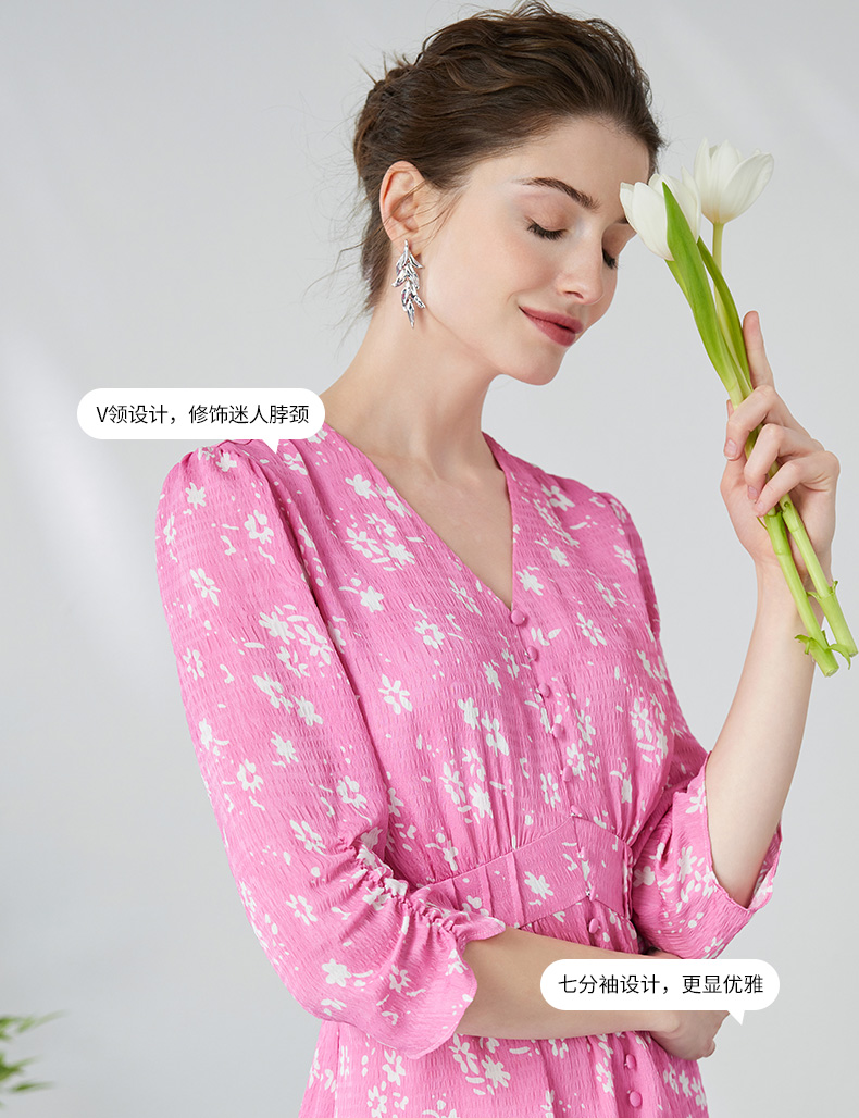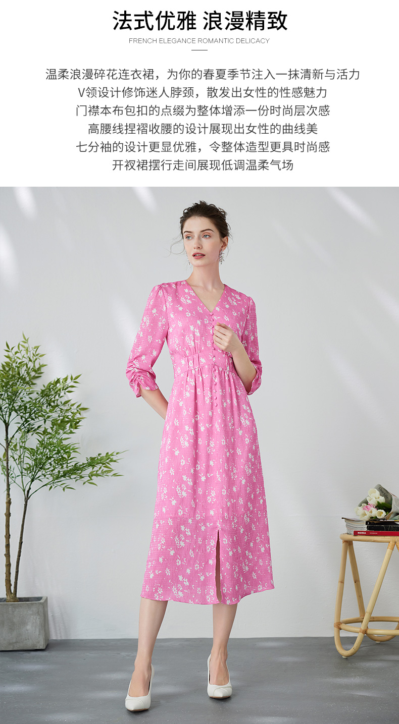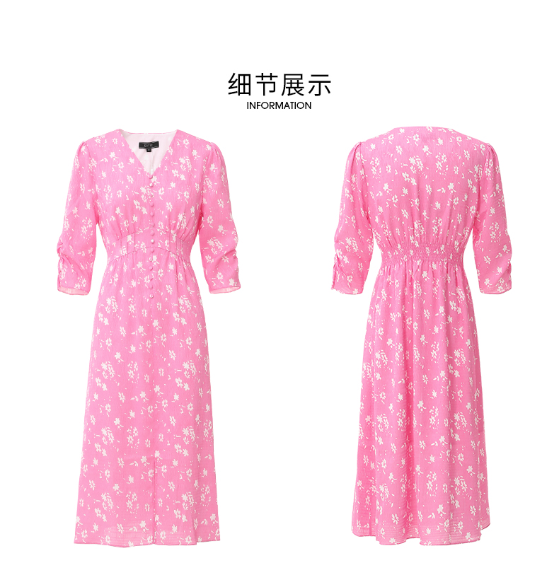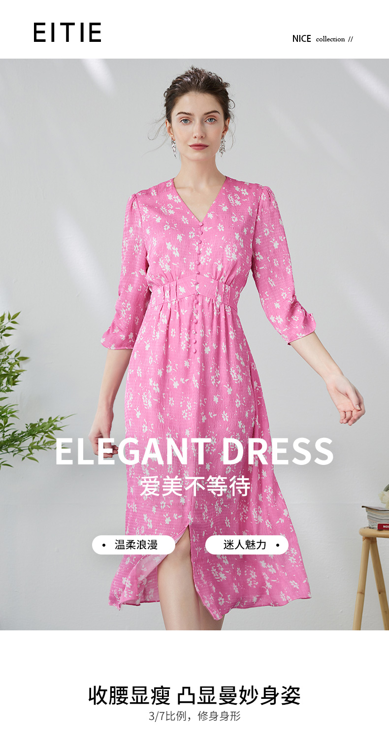 EITIE爱特爱复古V领法式碎花收腰先后桃红色连衣裙春季新款A2407335