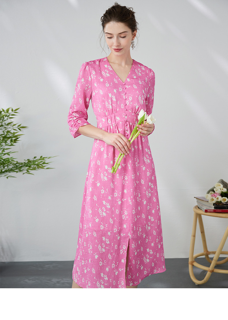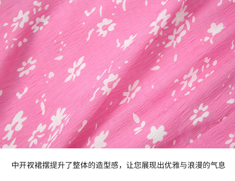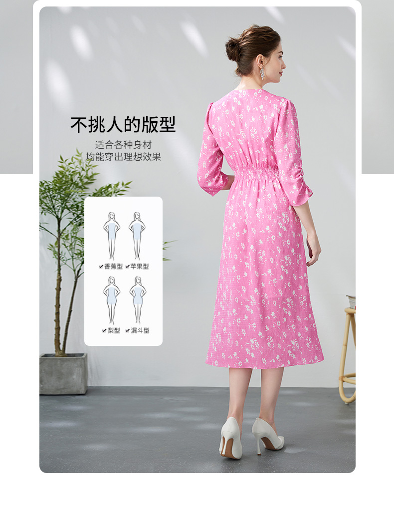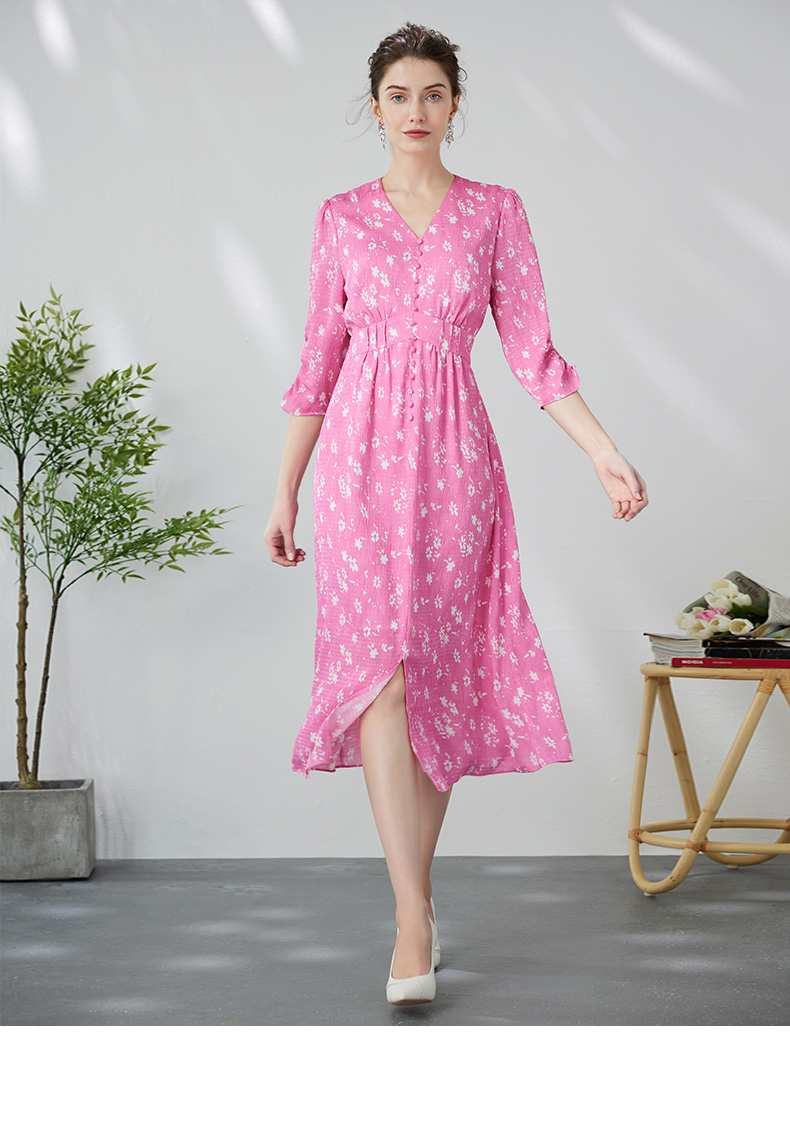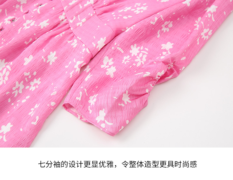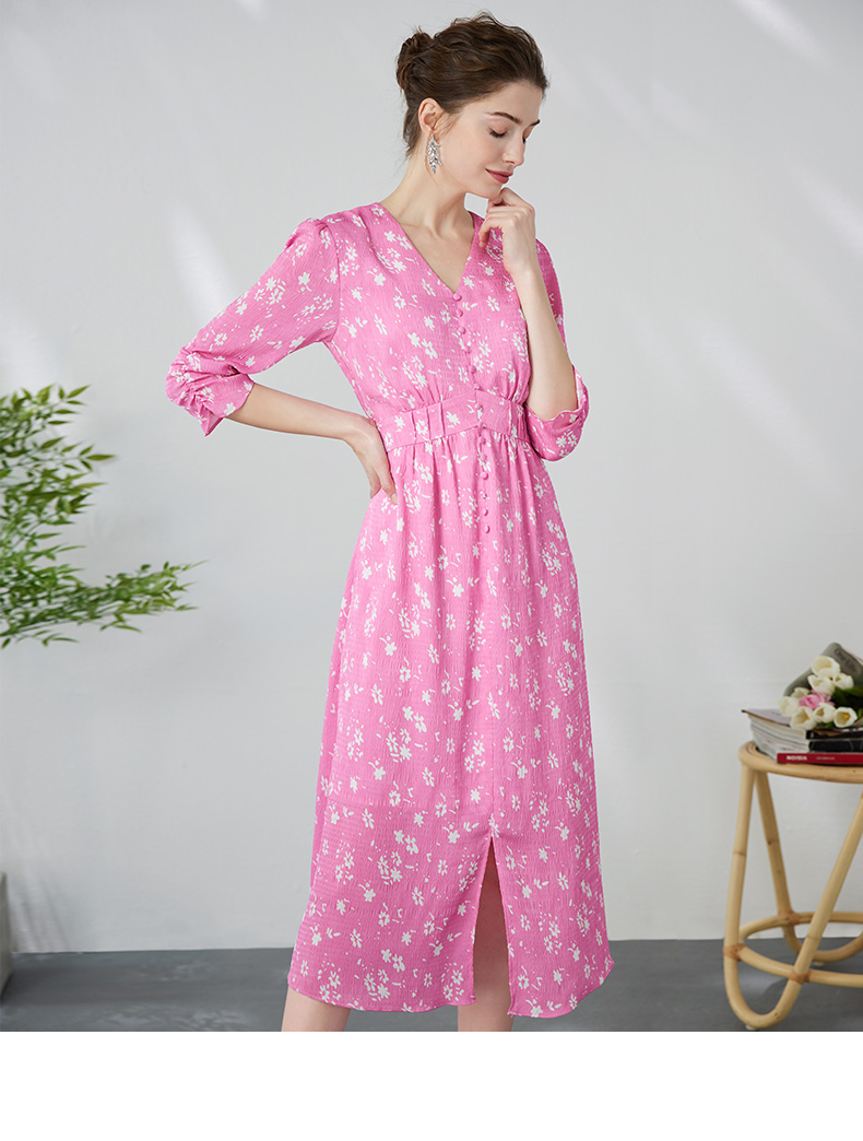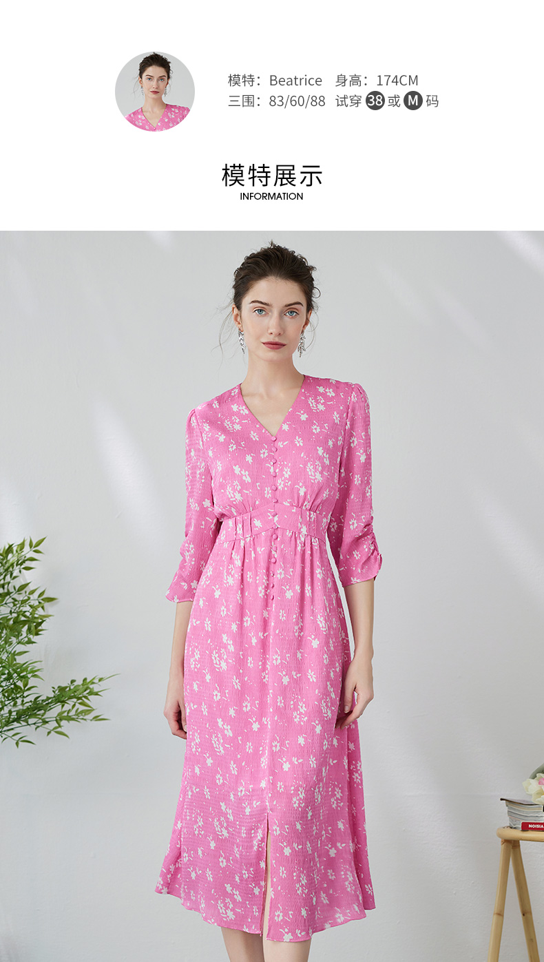 EITIE爱特爱复古V领法式碎花收腰先后桃红色连衣裙春季新款A2407335