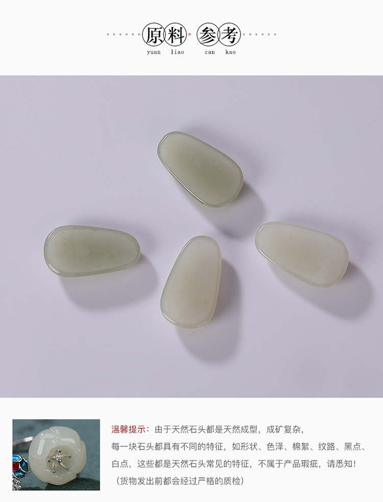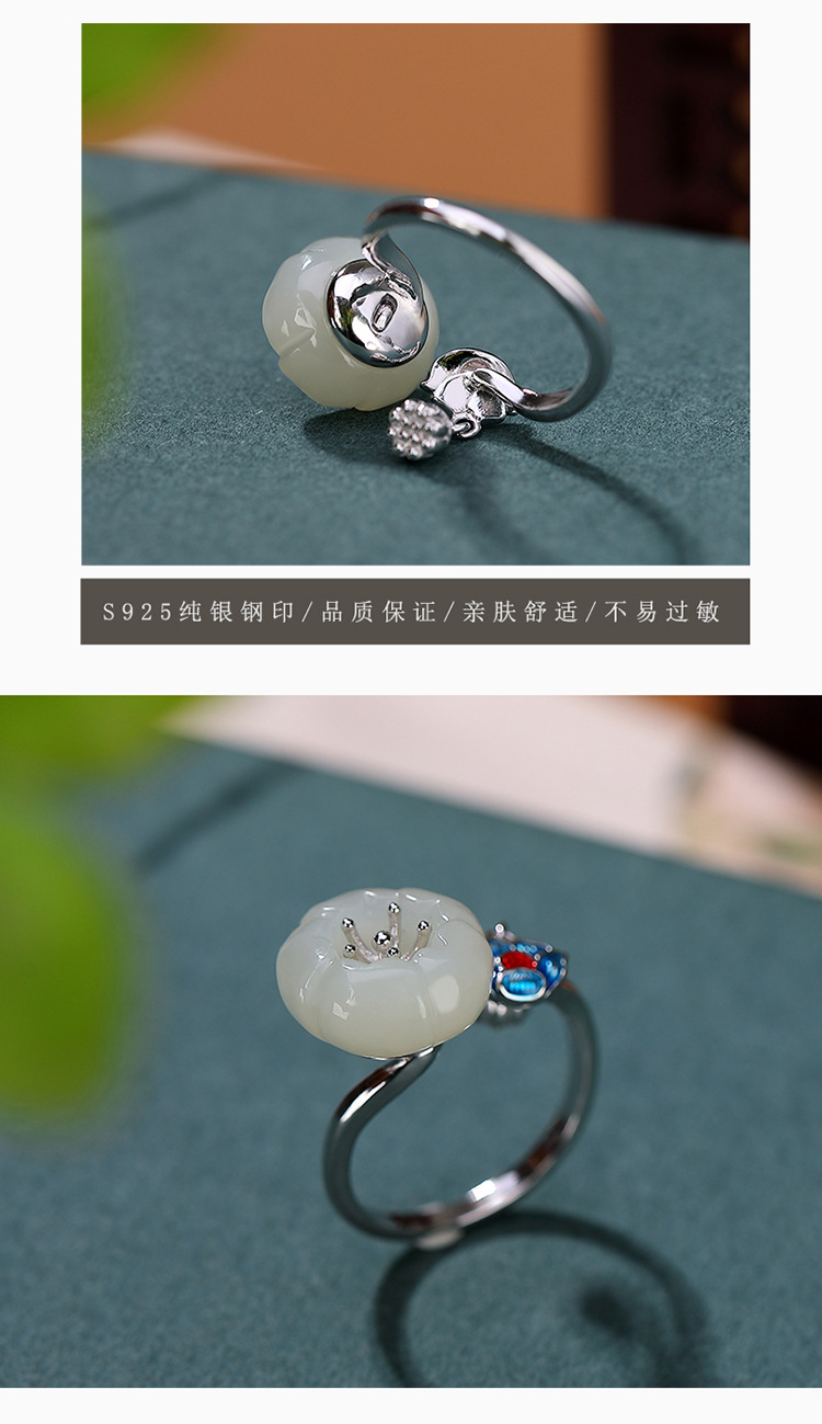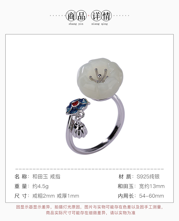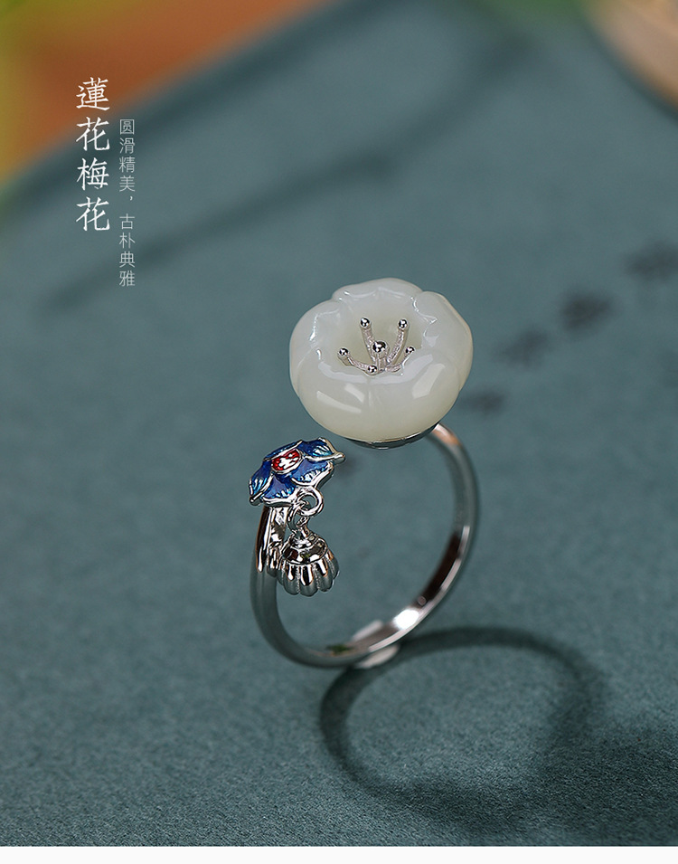 S925纯银景泰蓝和田白玉梅花莲蓬复古开口戒指CW