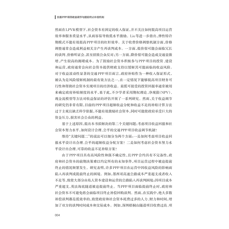 在交通PPP项目运营阶段,由于需求波动、成本超支等不确定性因素导致社会资本获取暴利或收益严重不足的问题。为了维持项目可持续健康运营,如何设计公平合理的收益调节机制成为亟待解决的紧迫问题;进一步的,当受到风险与利益分担不均、公众反对、项目运营困难等因素的影响PPP项目不得不提前终止时,如何建立科学有效的终止补偿机制具有重要理论研究意义和实践价值。本书以交通PPP项目运营中的关键问题为切入点,系统分析PPP合约设计中的收益调节与提前终止补偿机制,共包括九章,内容包括PPP项目收益预测分析、超额收益分配、收益不足的补贴决策、不确定性条件下的收益调节和提前终止补偿机制。