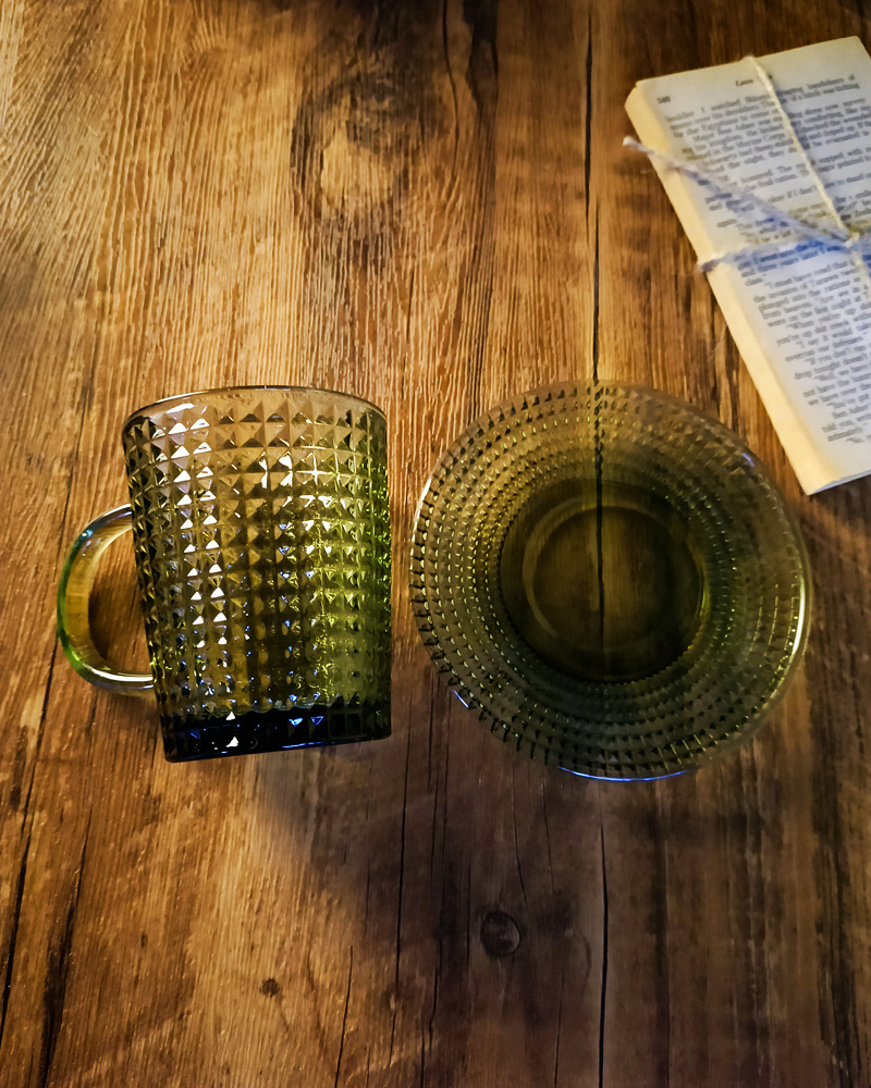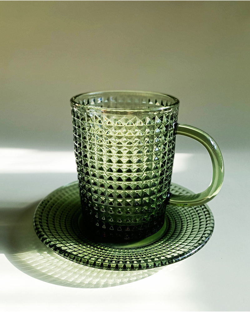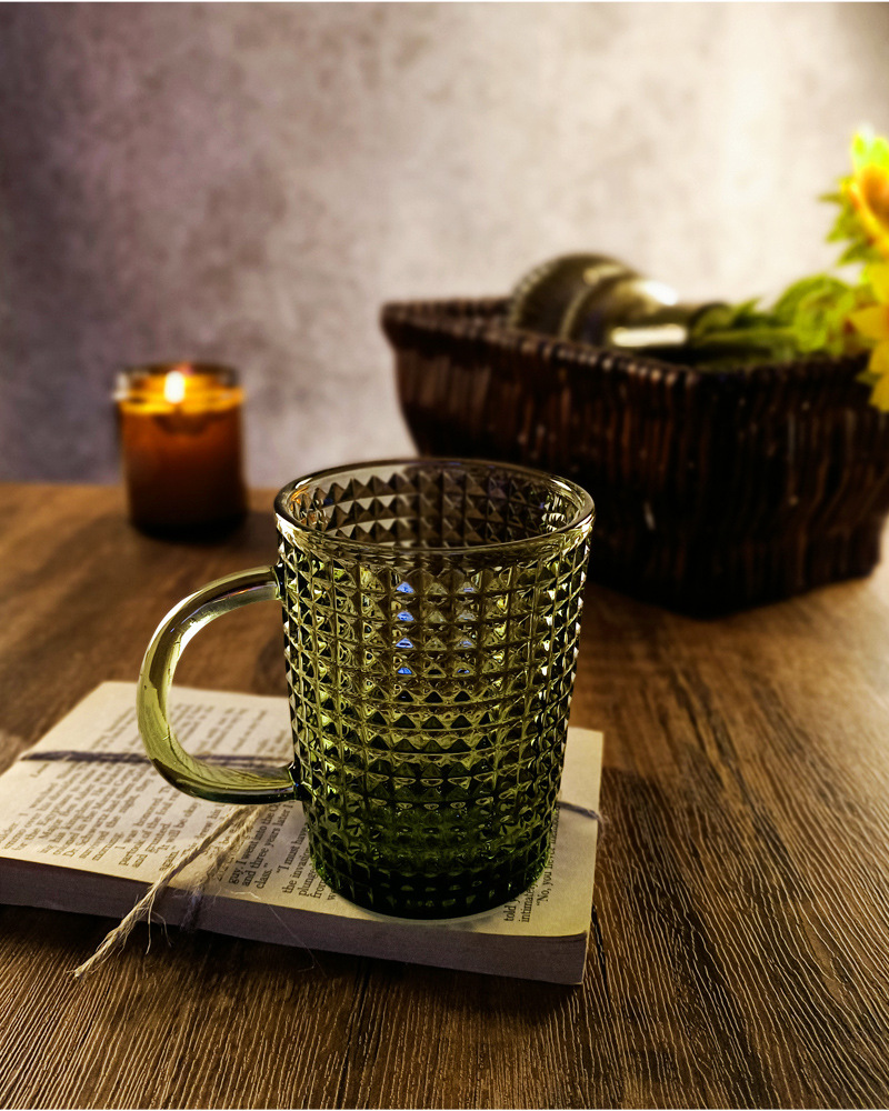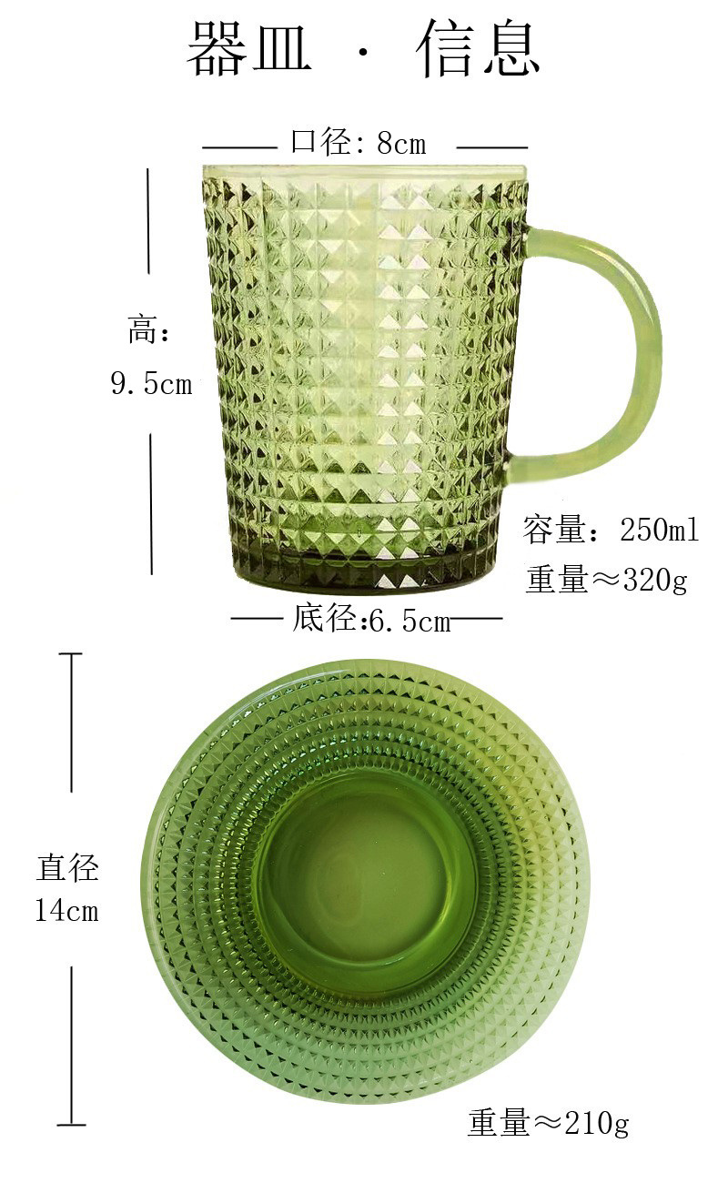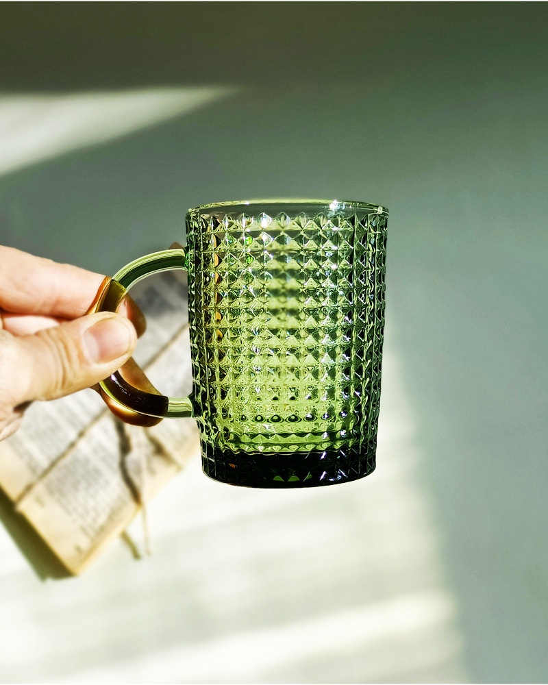 「复古绿色浮雕玻璃杯」咖啡杯 水杯 带把手茶杯 马克杯