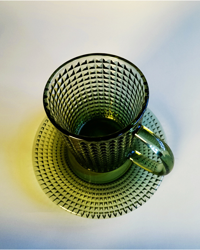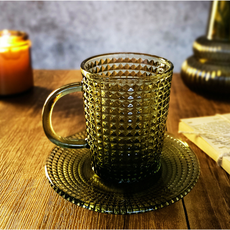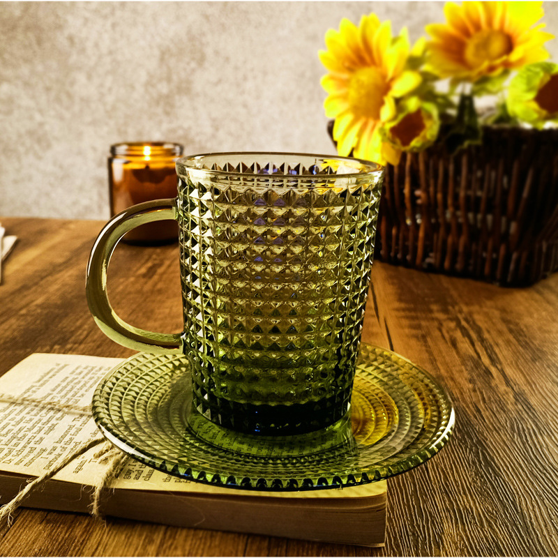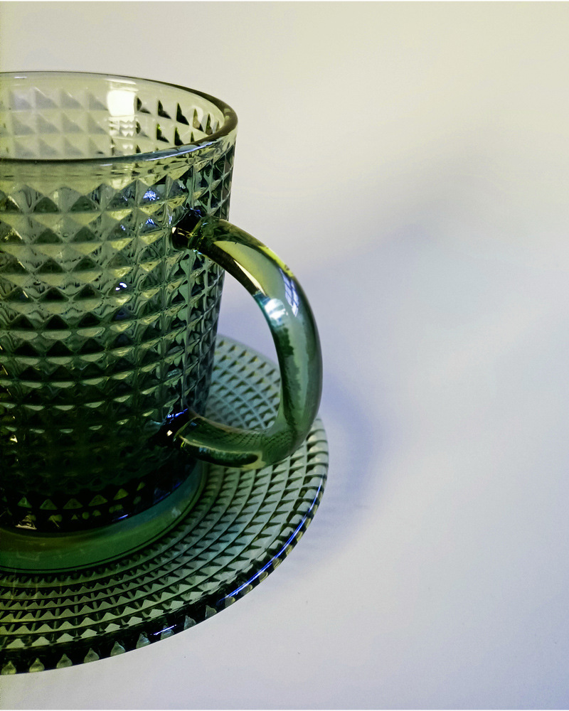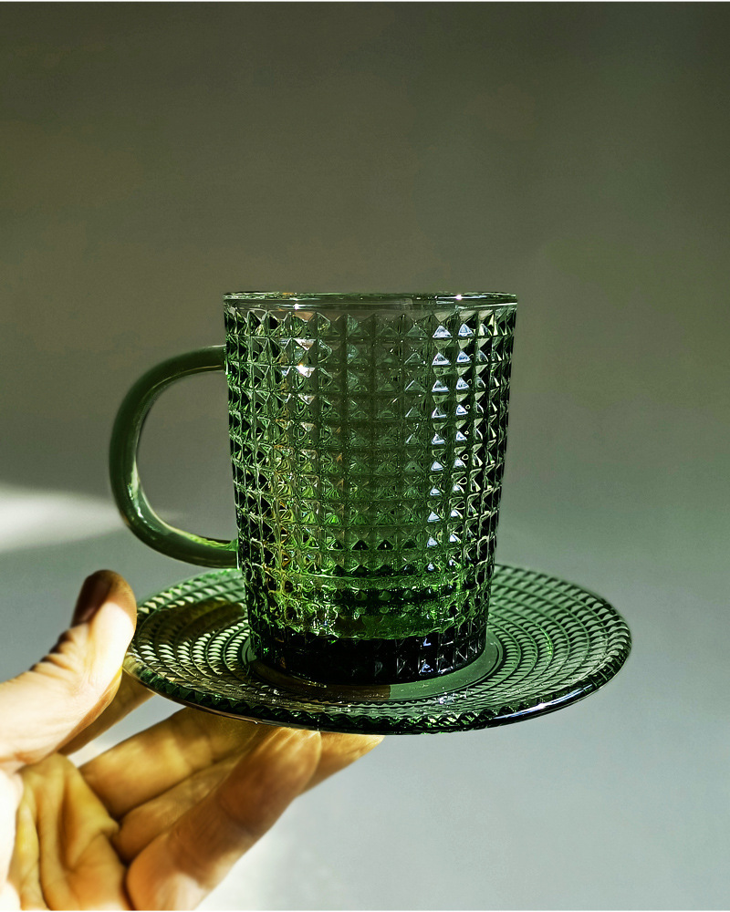 「复古绿色浮雕玻璃杯」咖啡杯 水杯 带把手茶杯 马克杯