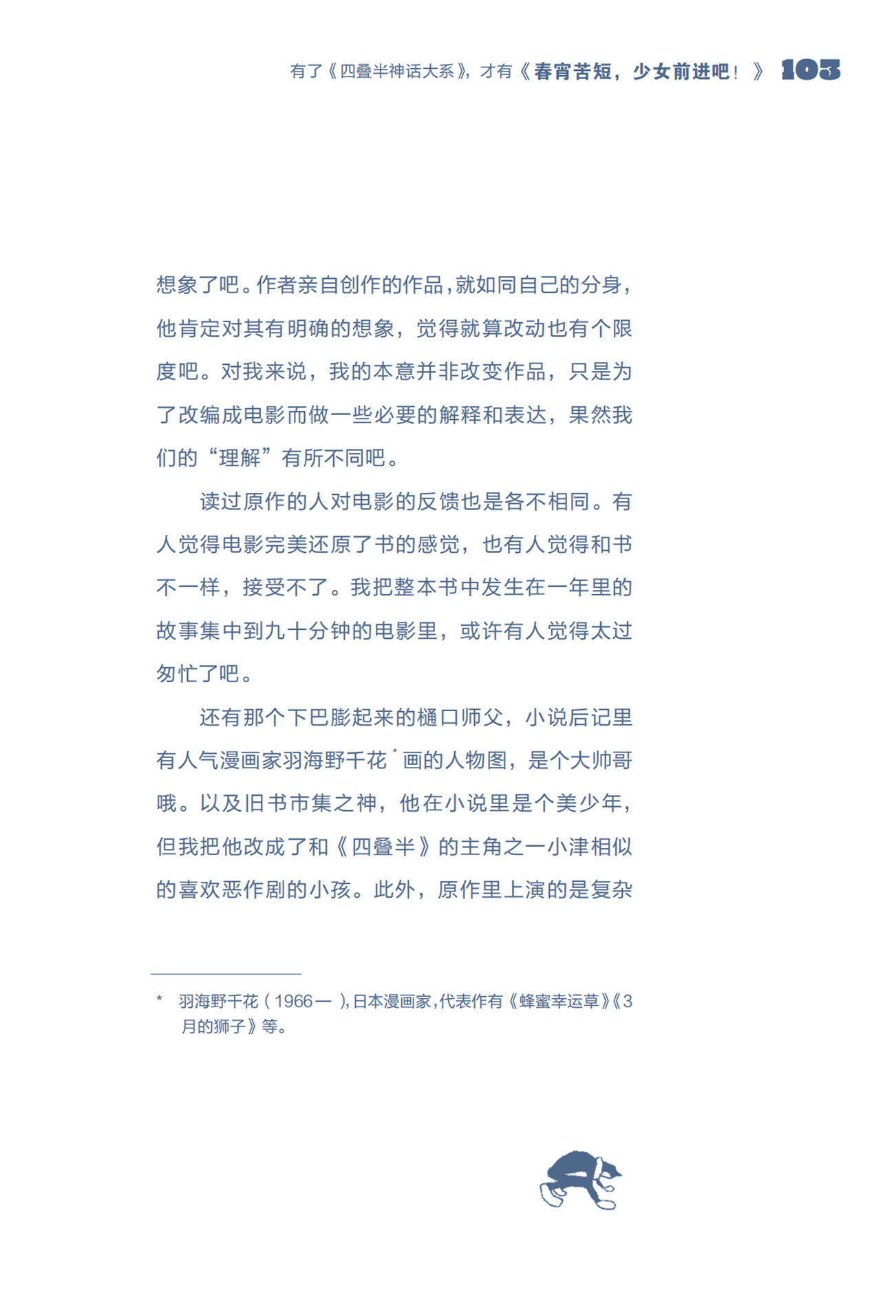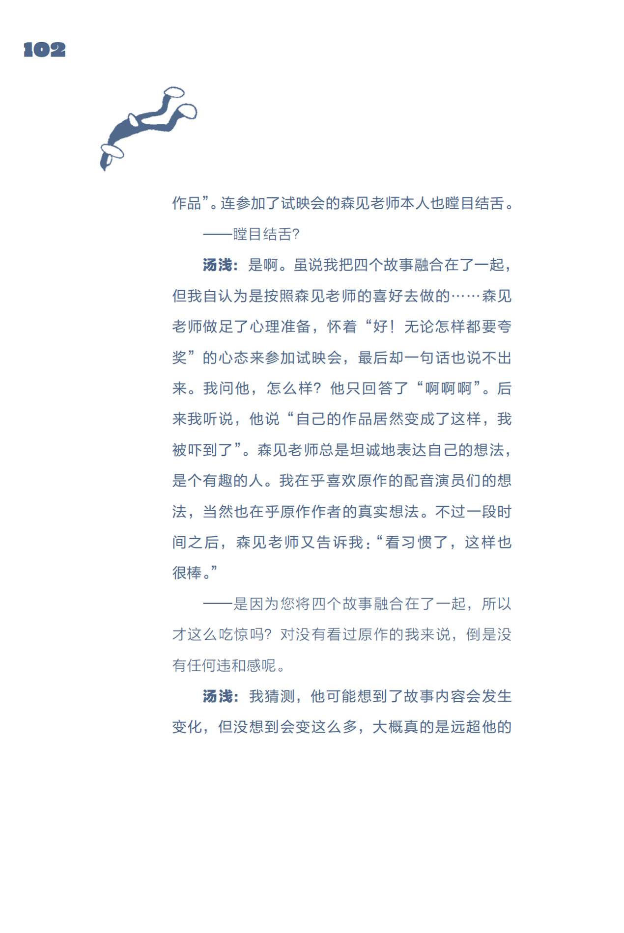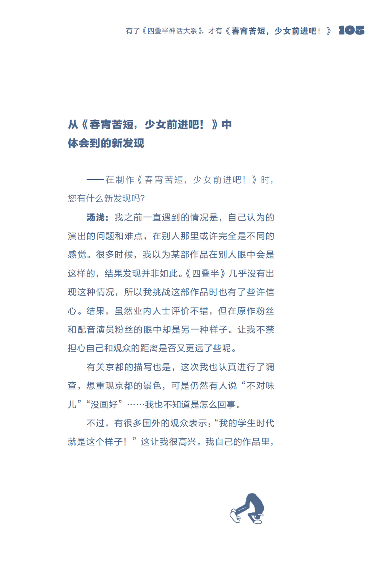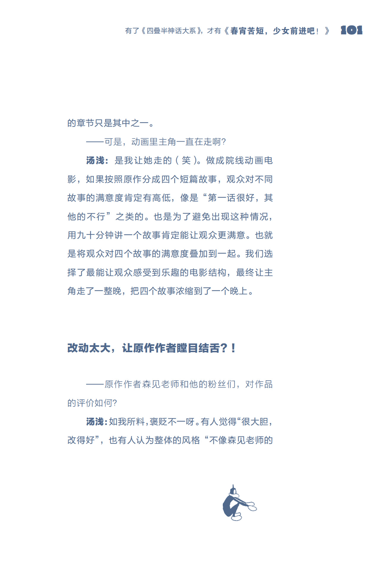 从现实世界寻找设定的灵感,从歌曲中借鉴叙事的结构,将儿时的经历融入故事……在本书中汤浅导演毫无保留地谈及了自己多种多样的灵感来源,并自述以解决新问题为乐,喜欢有挑战性的工作,总能以积极乐观的态度面对困难,读来让人备受启发。他对于创作的纯粹热爱也令人叹服。
