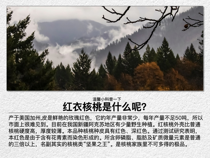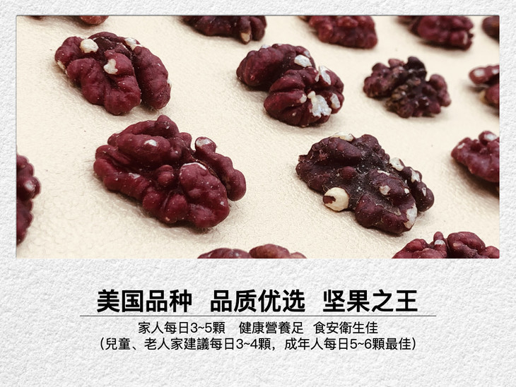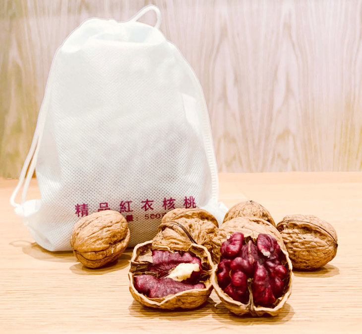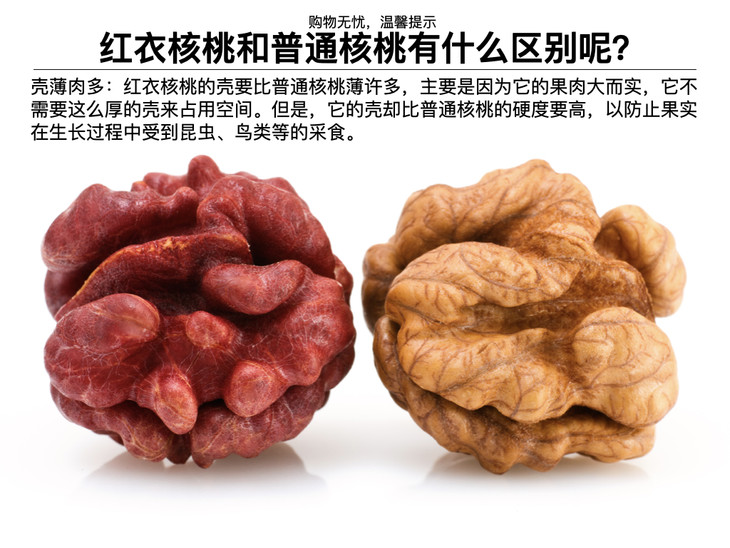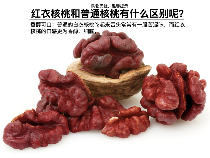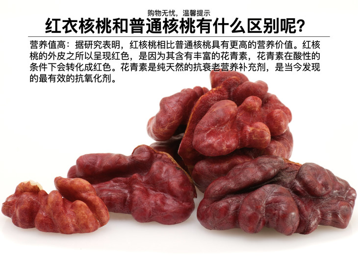 2.红衣核桃天然红色果衣,富含花青素,是核桃家族中不可多得的一款。口感香醇,老少皆宜。