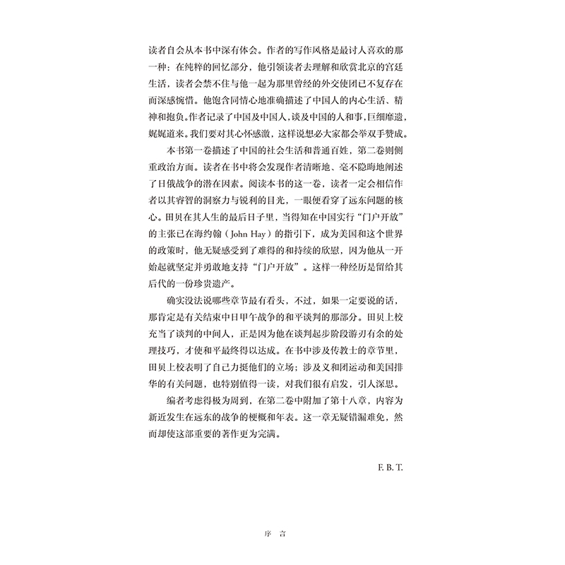 4.列强对华决策内情与心态的揭示:作为美国对华政策的重要参与者,田贝在书中记录了当时复杂的国际关系格局、列强间的竞合博弈以及清政府的处境与民众心态。其著述为理解当时美国制定对华政策的考量依据、决策逻辑与高层心态,提供了来自核心参与者的内部观察视角,是研究近代中外关系史和跨文化认知的重要参考资料。