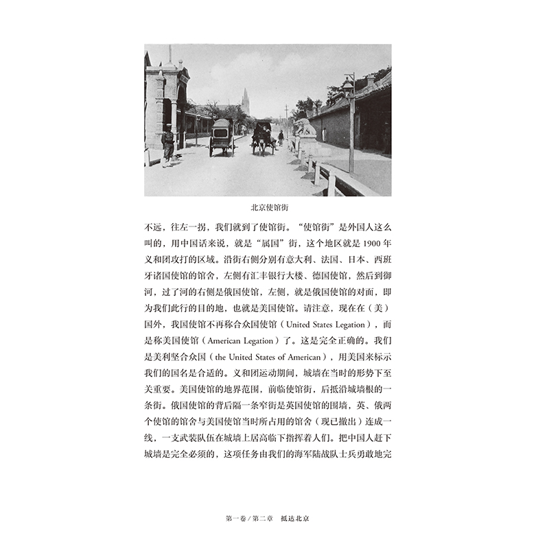 人际关系方面,中国被认为是世界上最讲礼仪的国家。他们的伟大的哲学家孔夫子,在道德方面关于礼仪有大量的阐述,远远多于在宗教方面的阐述。然而他们的习惯却令人作呕。很多城市的街道,特别是北京,街道就是公厕,就是每家每户的垃圾堆积场,房子的墙上画着不堪入目的图画。沿着哈德门大街往前走京的城墙不远,往左一拐,我们就到了使馆街。“使馆街”是外国人这么叫的,用中国话来说,就是“属国”街,这个地区就是 1900 年义和团攻打的区域。沿街右侧分别有意大利、法国、日本、西班牙诸国使馆的馆舍,左侧有汇丰银行大楼、德国使馆,然后到御河,过了河的右侧是俄国使馆,左侧,就是俄国使馆的对面,即为我们此行的目的地,也就是美国使馆。请注意,现在在(美)国外,我国使馆不再称合众国使馆(United States Legation),而是称美国使馆(American Legation)了。这是完全正确的。我们是美利坚合众国(the United States of American),用美国来标示我们的国名是合适的。义和团运动期间,城墙在当时的形势下至关重要。美国使馆的地界范围,前临使馆街,后抵沿城墙根的一条街。俄国使馆的背后隔一条窄街是英国使馆的围墙,英、俄两个使馆的馆舍与美国使馆当时所占用的馆舍(现已撤出)连成一线,一支武装队伍在城墙上居高临下指挥着人们。把中国人赶下城墙是完全必须的,这项任务由我们的海军陆战队士兵勇敢地完成了,当时士兵们在迈耶斯(Meyers)上尉的指挥下奋勇抗击,并得到英国士兵和一些中国皈依者的协助。再往东,德国人占据着靠近哈德门的那部分城墙,因而敌人不能占领那里,在那部分城墙上可以俯视、指挥使馆区的绝大部分地区。意大利使馆、奥地利使馆和附近的赫德(Robert Hart)( 赫德,英国人,时任中国海关总税务司。——译者)的好房子、好楼房都被摧毁了,但其他的使馆建筑完好无损,不过法国使馆的房屋有些受损。荷兰使馆的建筑也被毁了,它位于前门和美国使馆之间,前门是北京最主要的大门。