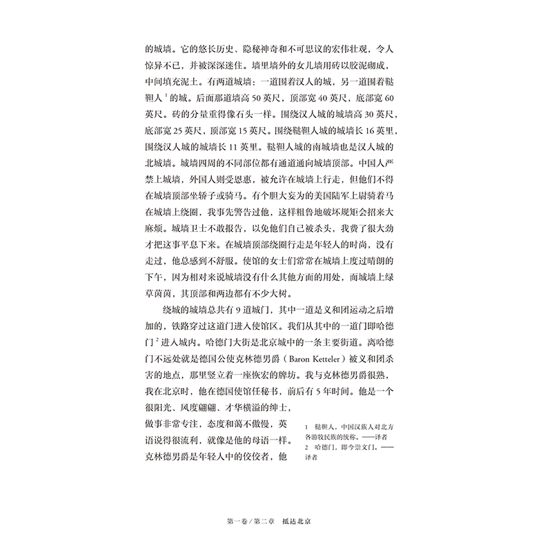 这样的一本书应当既趣味盎然,又珍贵无比。对此,我相信读者自会从本书中深有体会。作者的写作风格是最讨人喜欢的那一种:在纯粹的回忆部分,他引领读者去理解和欣赏北京的宫廷生活,读者会禁不住与他一起为那里曾经的外交使团已不复存在而深感惋惜。他饱含同情心地准确描述了中国人的内心生活、精神和抱负。作者记录了中国及中国人,谈及中国的人和事,巨细靡遗,娓娓道来。我们要对其心怀感激,这样说想必大家都会举双手赞成。