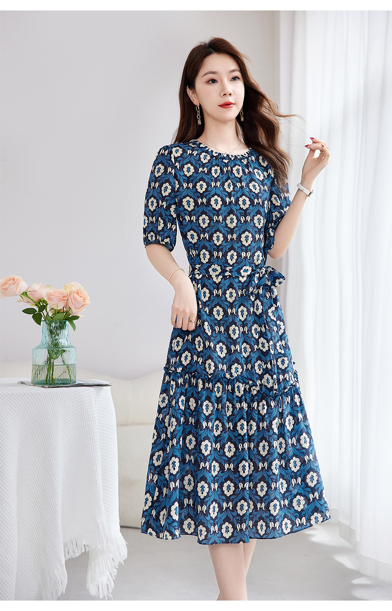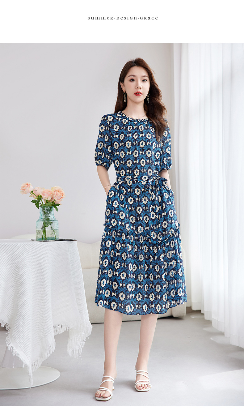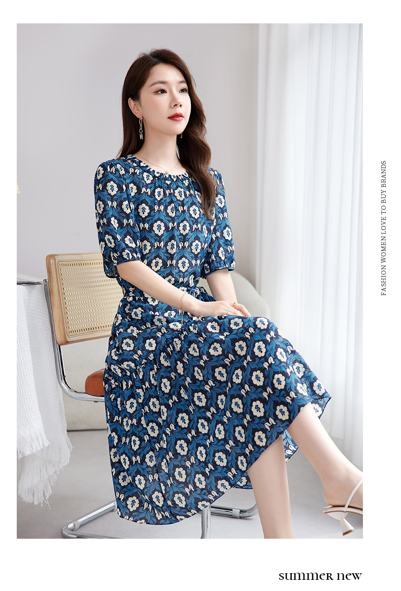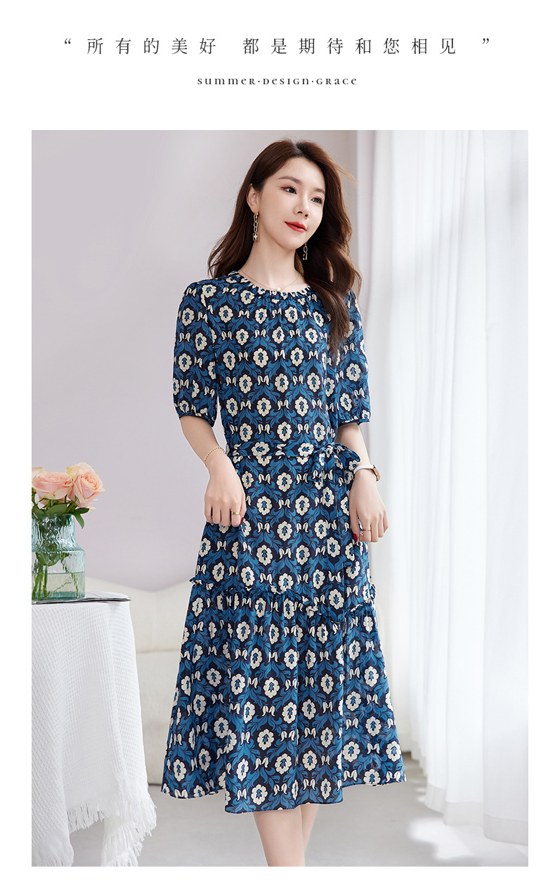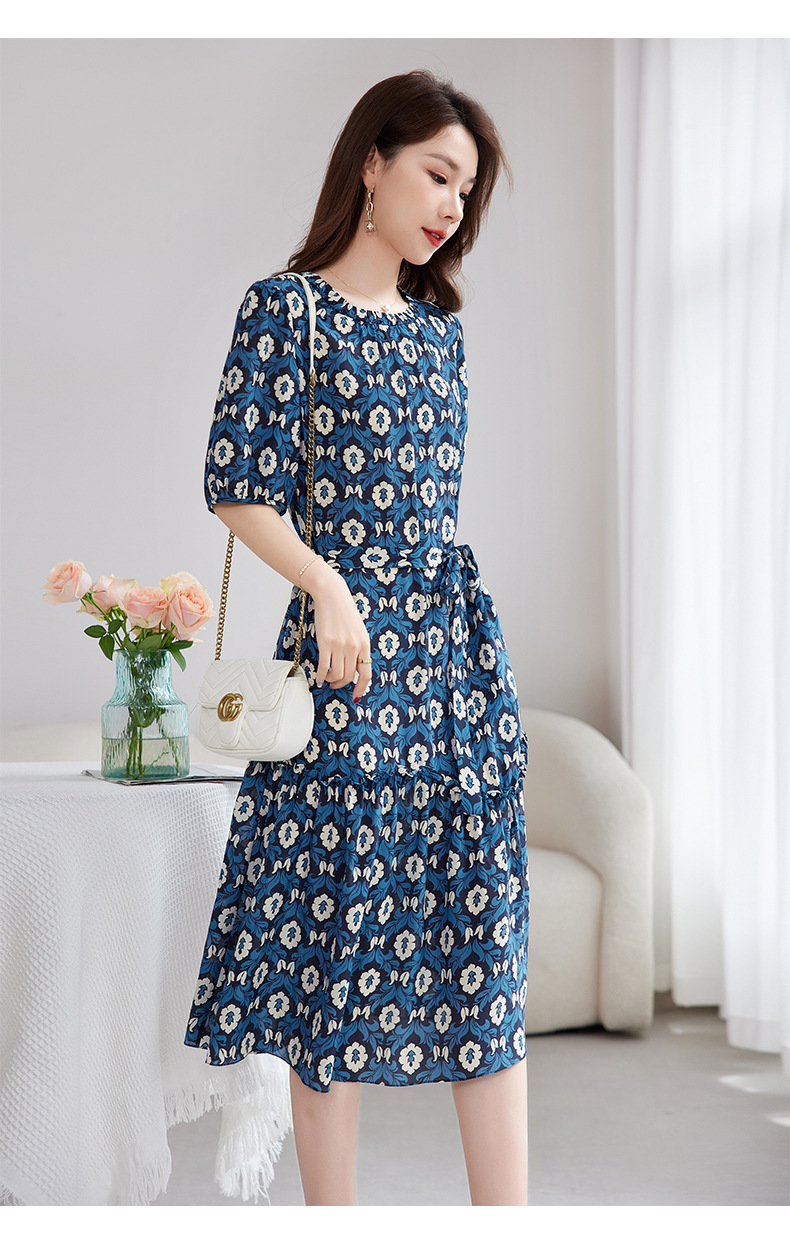 QS-82501101中大淑女装5A桑蚕丝连衣裙夏季圆领100%真丝印花连衣裙女1101