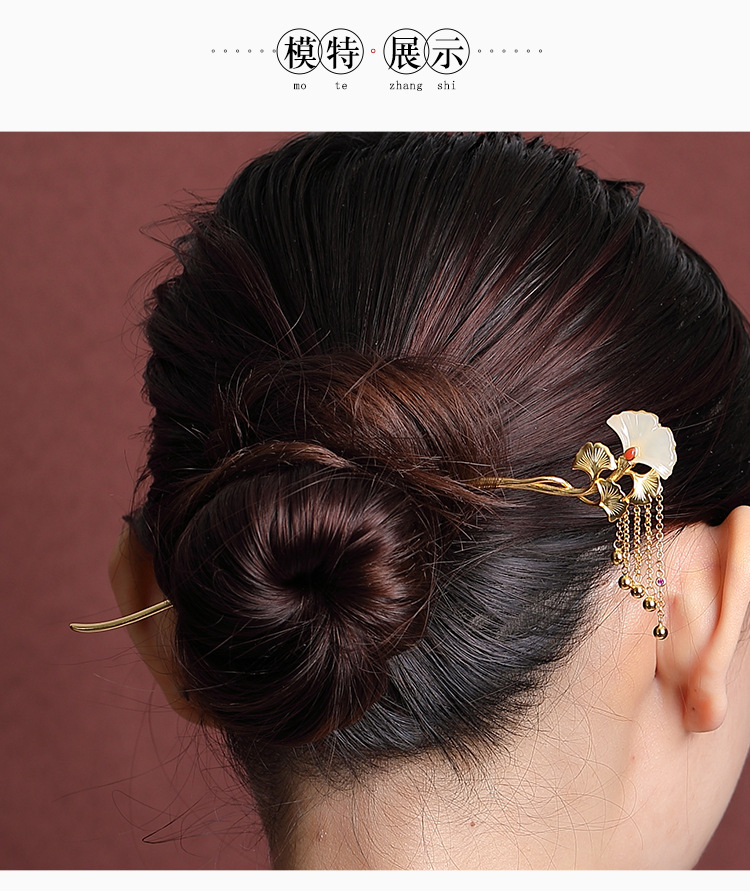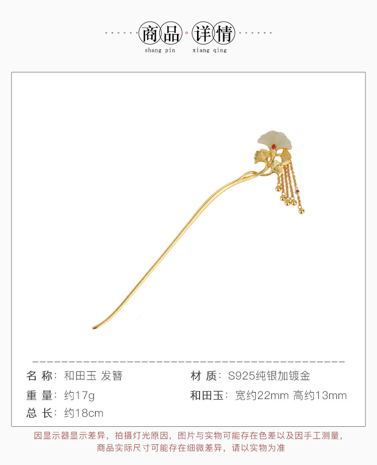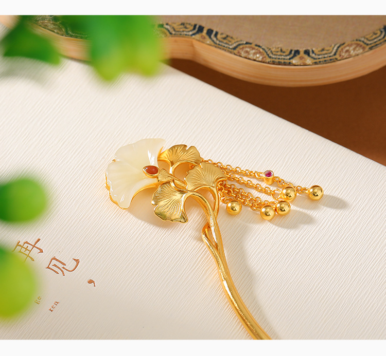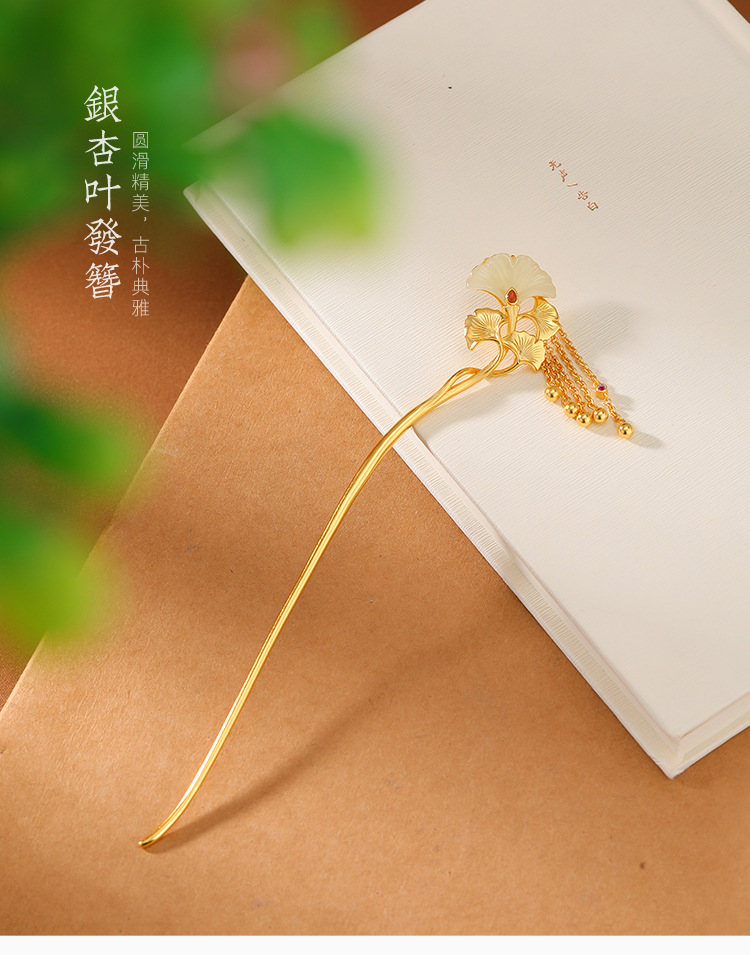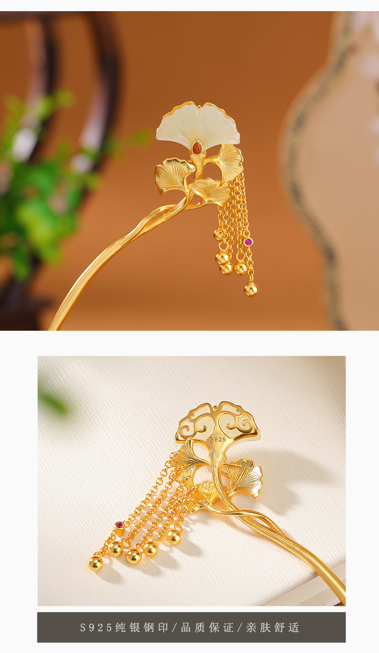 S925纯银镀金和田玉南红气质银杏叶流苏发簪古风银簪CW