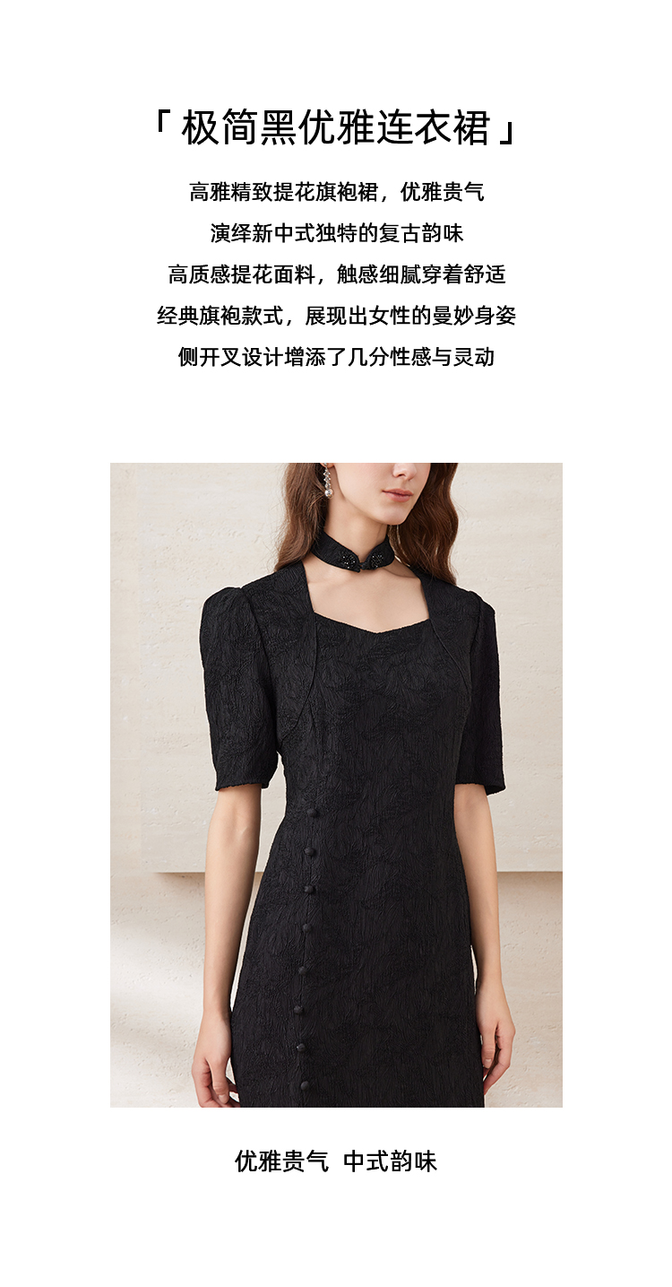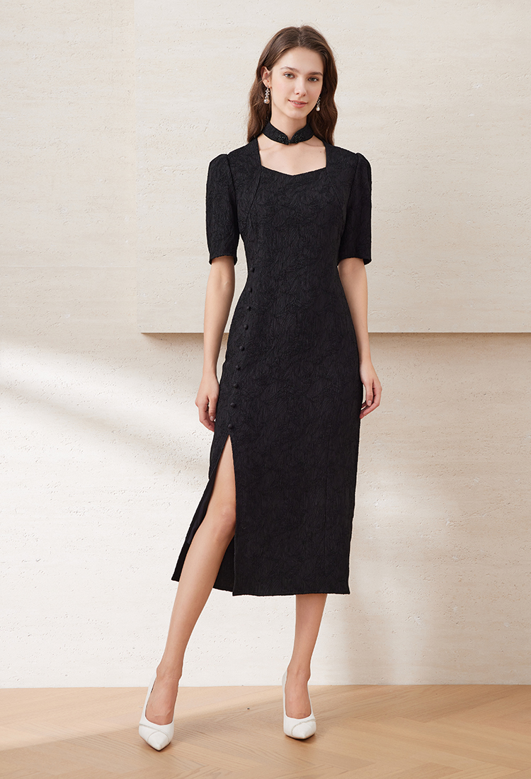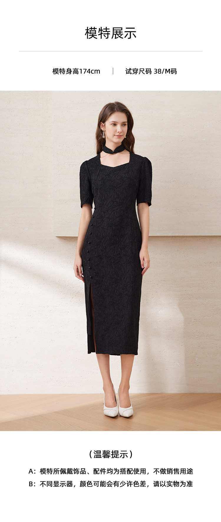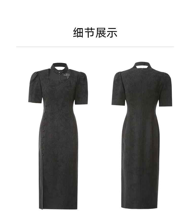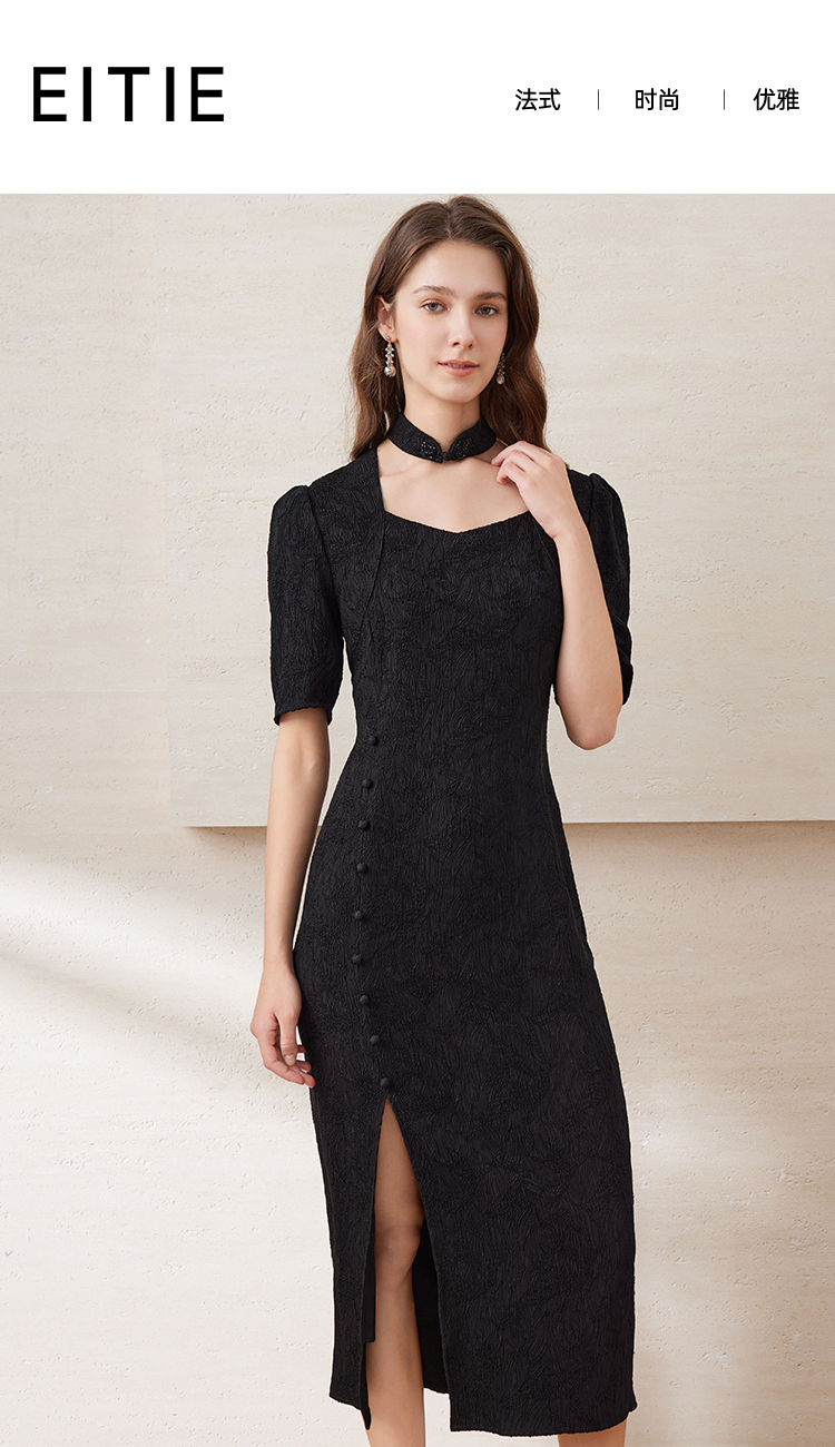 EITIE爱特爱春季新款时尚通勤改良旗袍开叉显瘦纯色连衣裙7707403