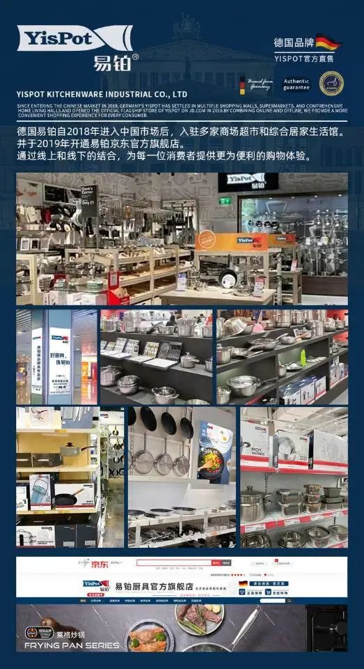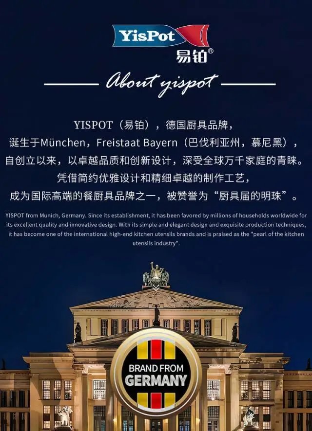 YISPOT(易铂),德国厨具品牌,诞生于München,Freistaat Bayern(巴伐利亚州,慕尼黑),自创立以来,以卓越品质和创新设计,深受全球万千家庭的青睐。凭借简约优雅设计和精细卓越的制作工艺,成为国际高端的餐厨具品牌之一,被赞誉为“厨具届的明珠”。