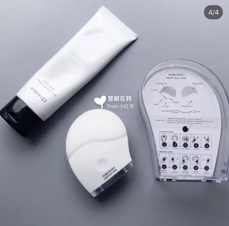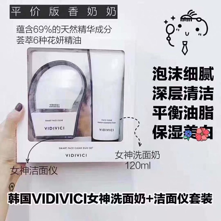 Vidivici女神洗面奶+洁面按摩器👍洗面奶120ml一支,在韩国号称小香奈儿,敏感肌肤适合,孕妇也可用哦!蕴含69%天然精华🌿成分和玻尿酸,温和保湿💧、不刺激,泡沫细腻丰富,创造透亮肤质💫。加入了天然草本🌱成分,洁面后肌肤清爽而不紧崩,有股淡淡的清香味🍃~洁面仪也hin好用哦,可以调节速度,这个组合perfect❤~