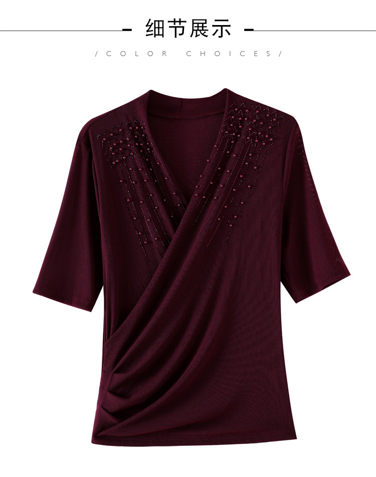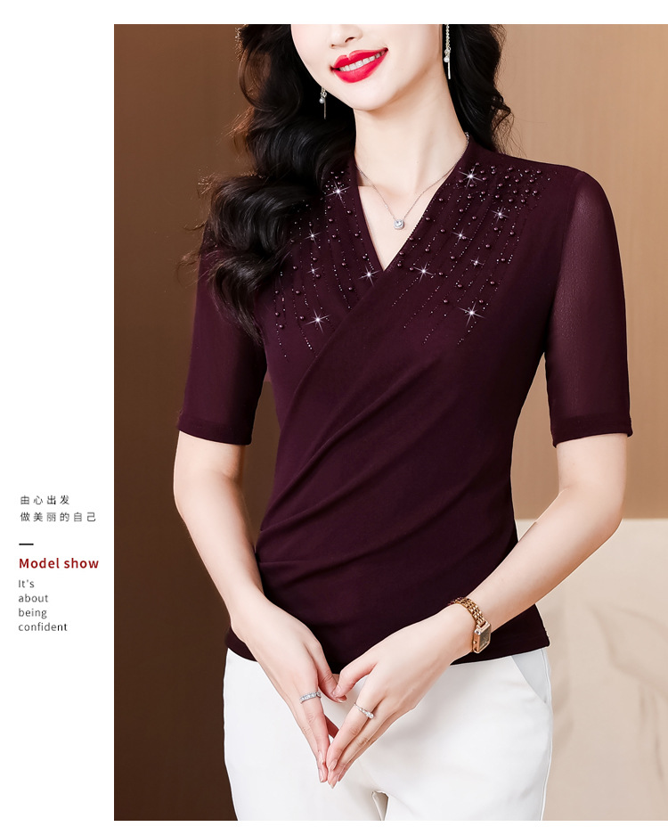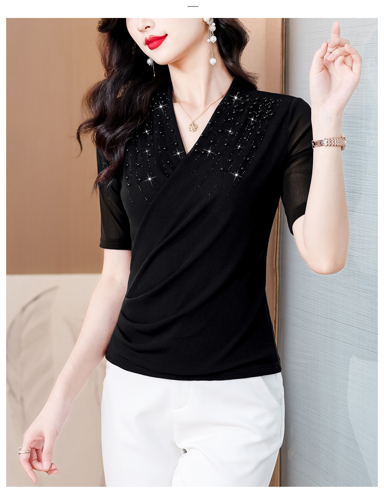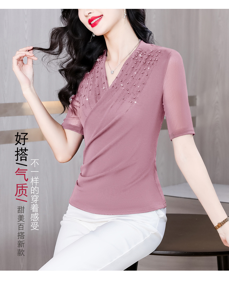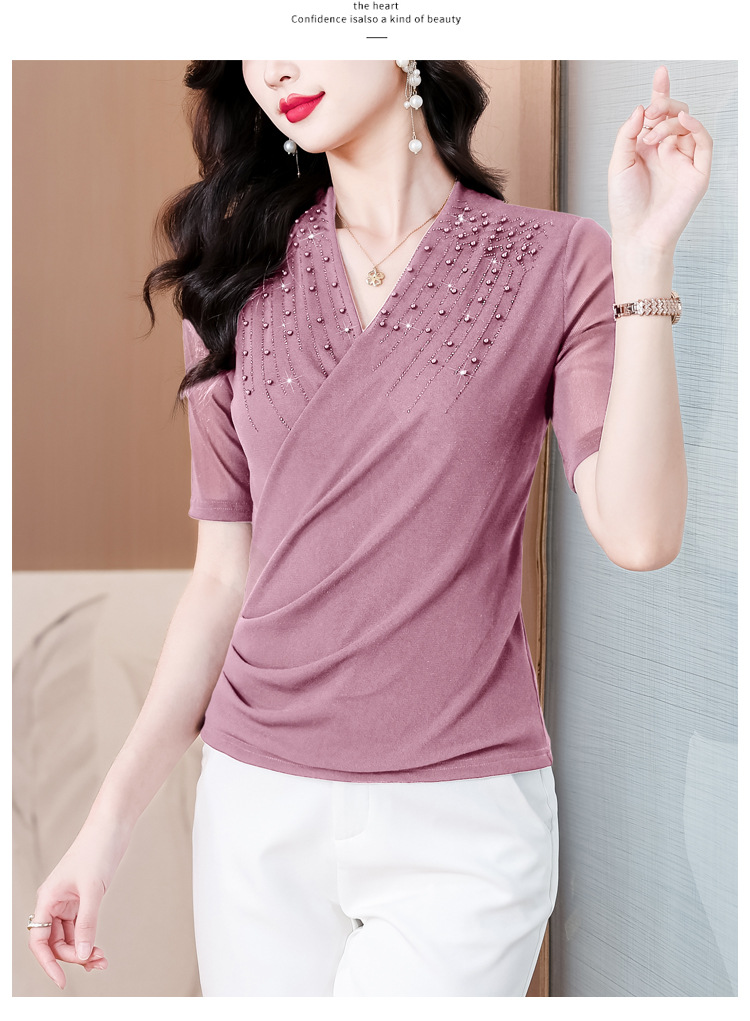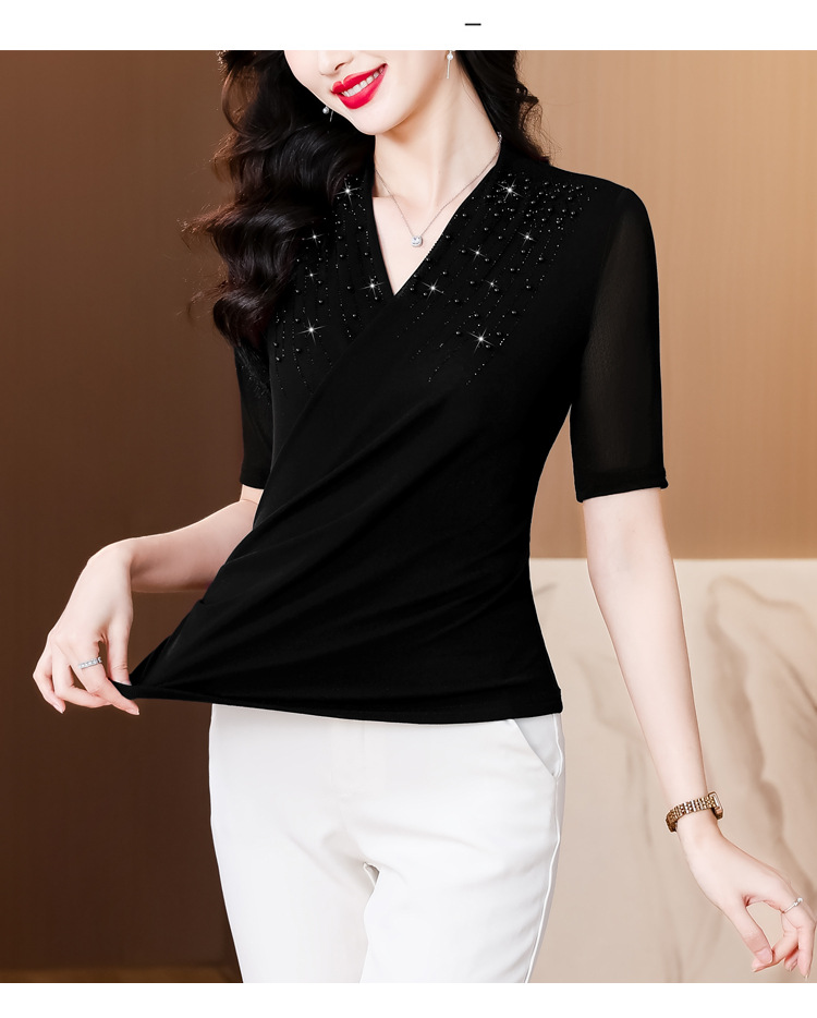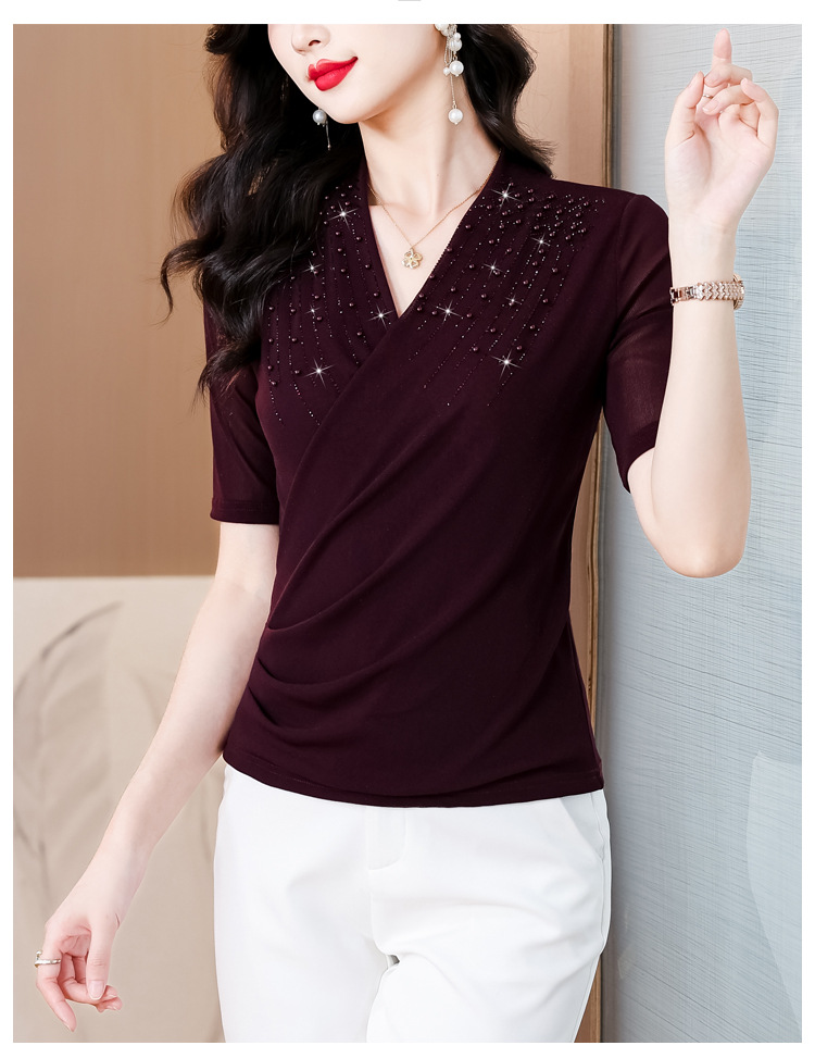 时尚气质交叉领钉珠设计上衣,百搭洋气显瘦小衫KQL-B12N2801