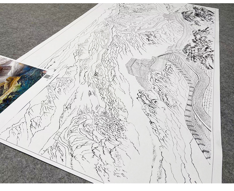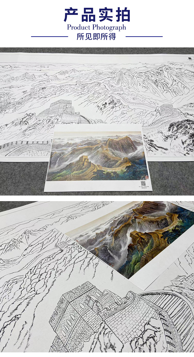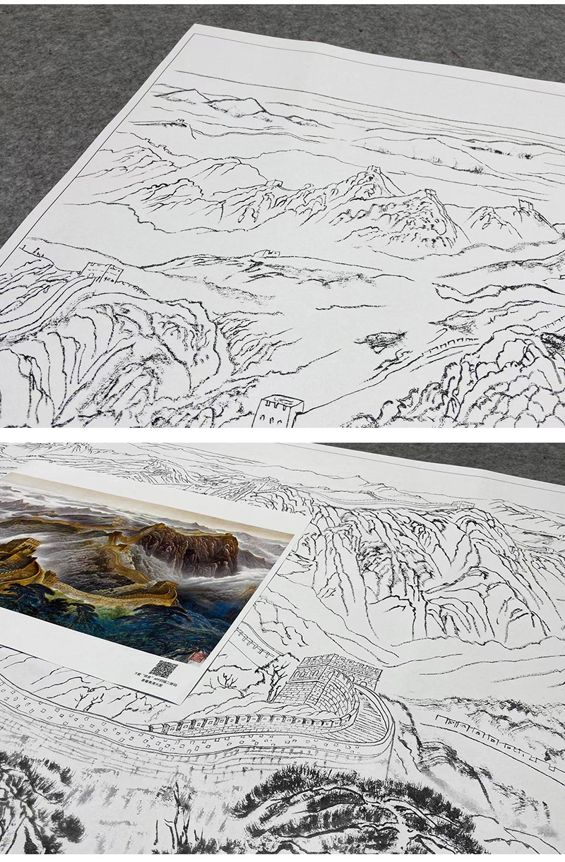 【大彩图】邹利玉横幅工笔画白描底稿《万里长城》临摹勾线山水线稿FS17