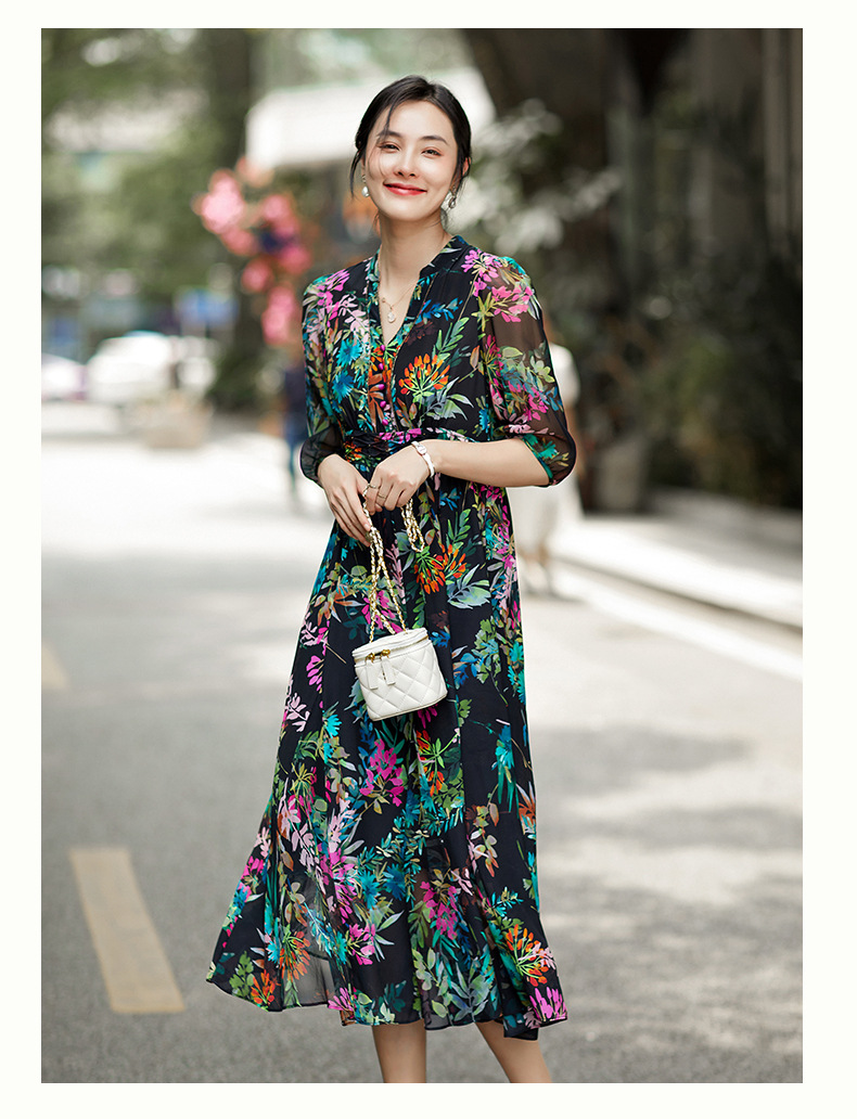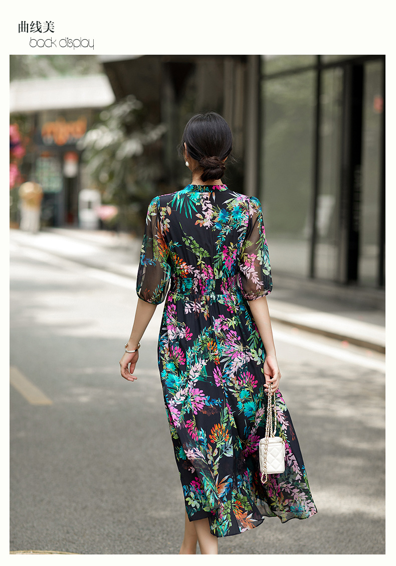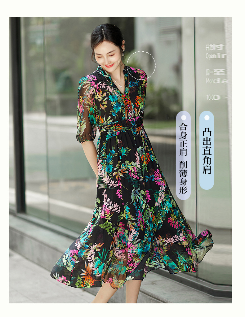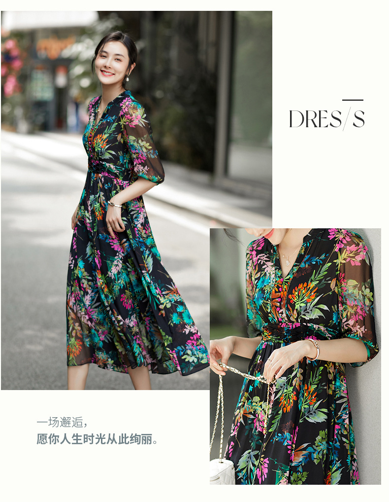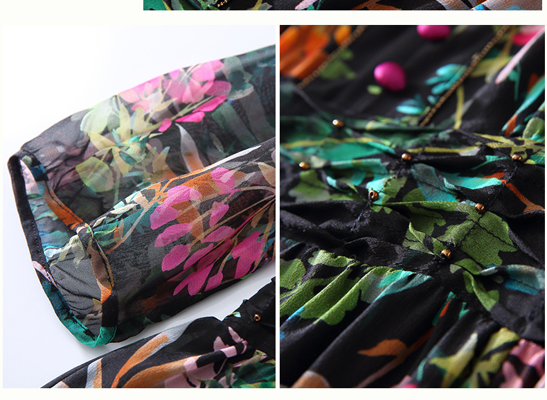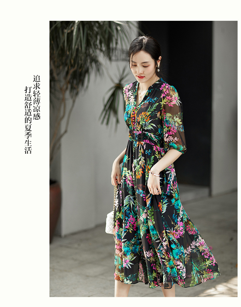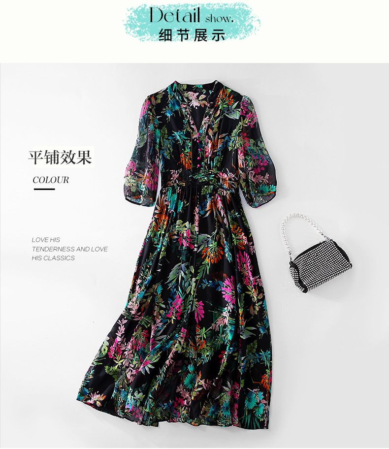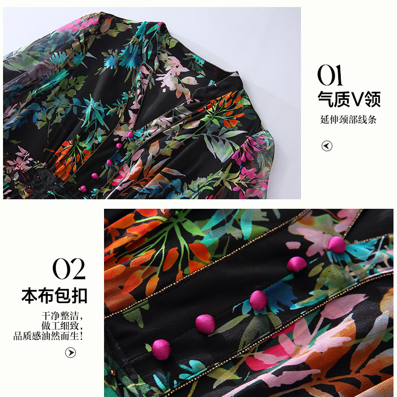 丁摩 法式真丝植物印花串珠连衣裙90415
