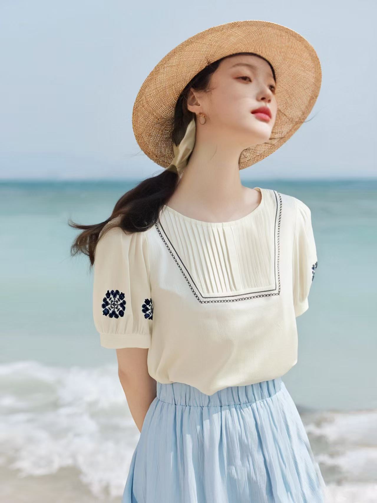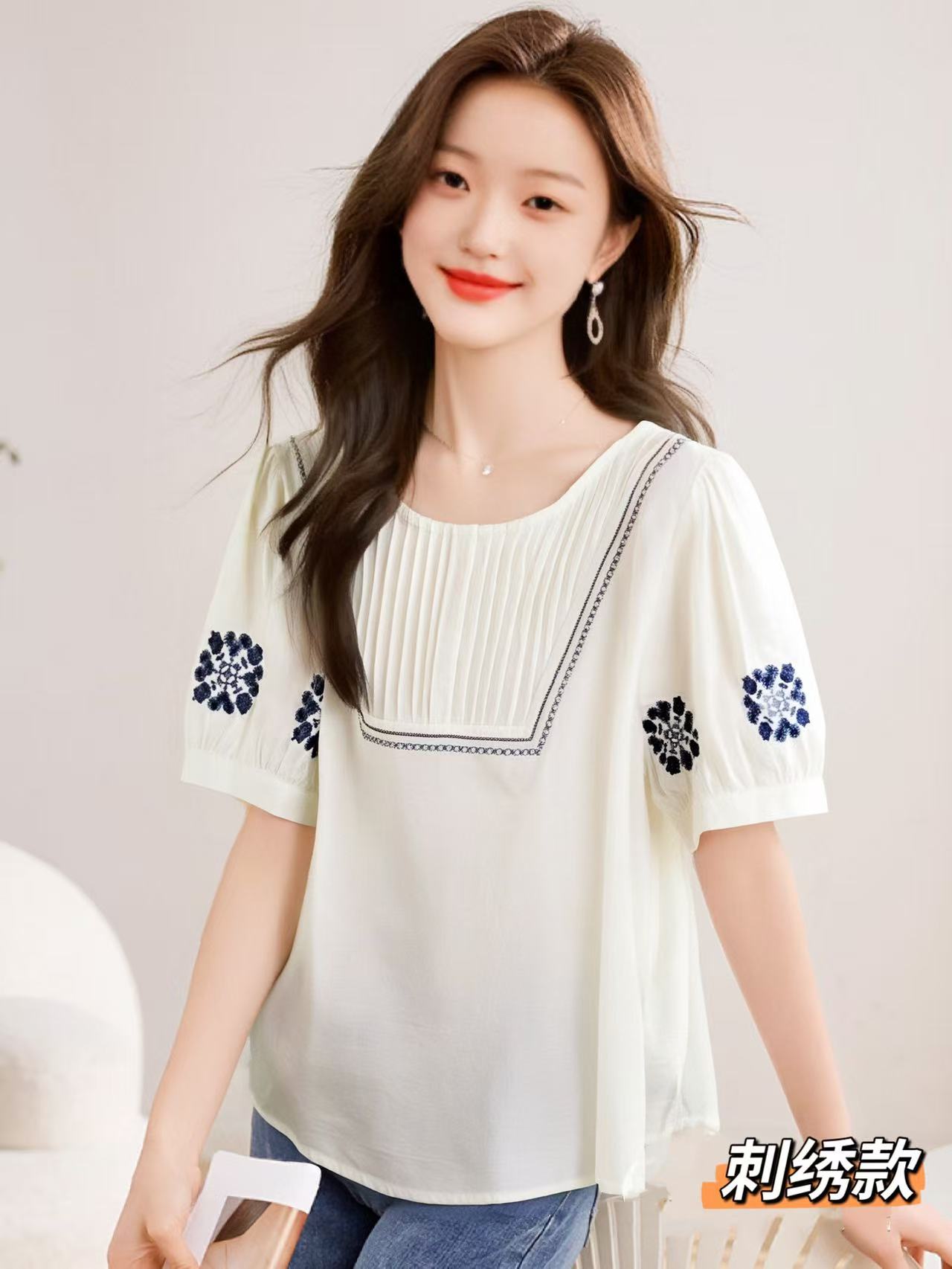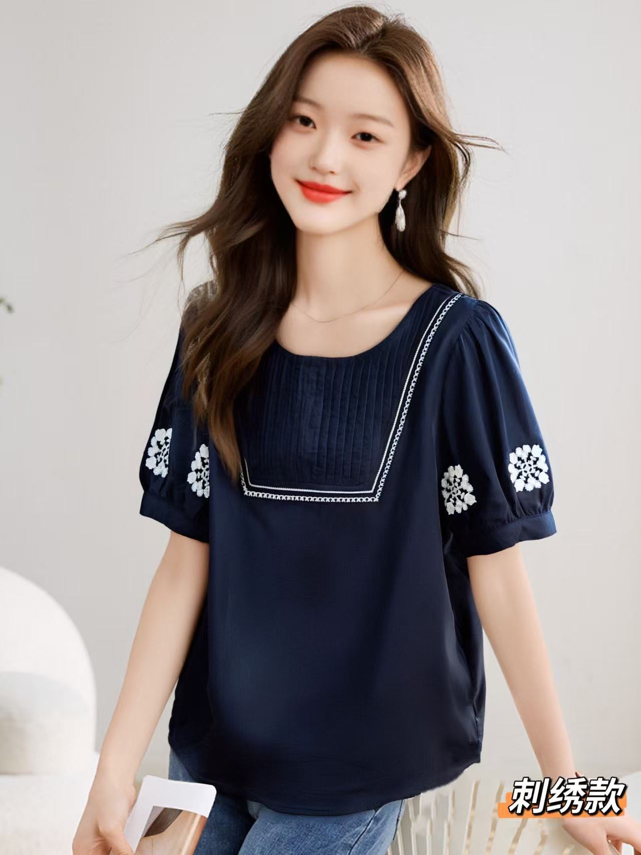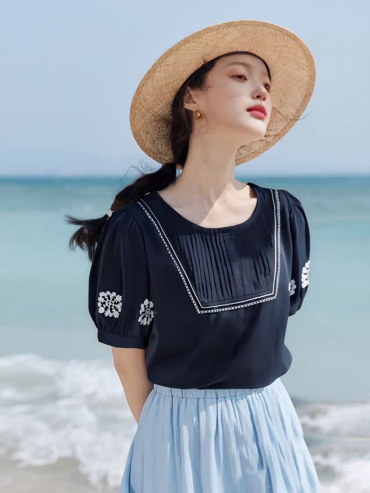 七夕福利-NO退~超美上衣~绣花波西米亚风刺绣复古压褶小衫-喜出