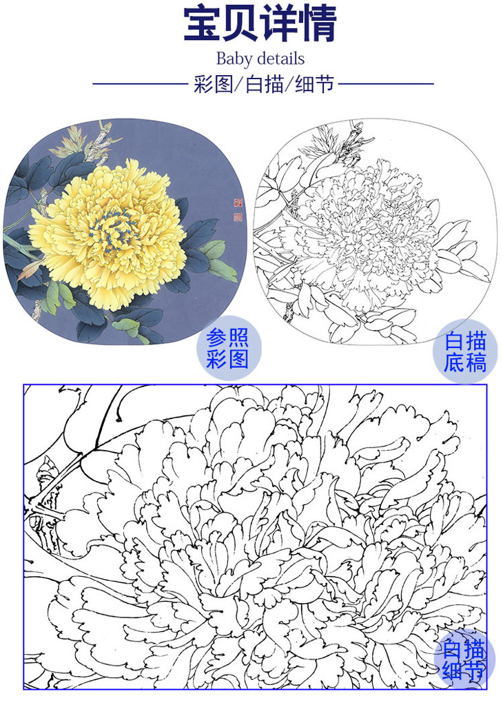 李晓明工笔花鸟白描底稿-牡丹团扇四小品之四-多种白描尺寸可选-K023