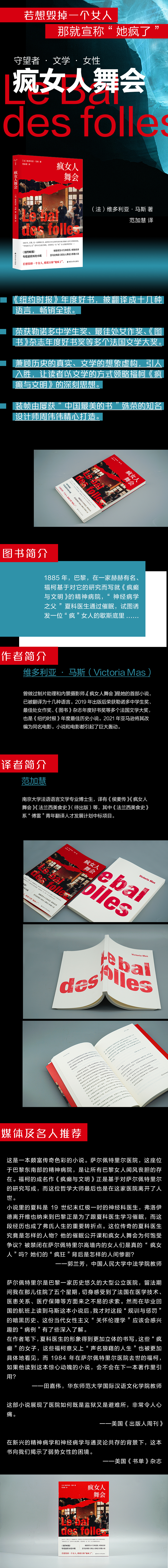 维多利亚·马斯(Victoria Mas),曾做过制片助理和内景摄影师。《疯女人舞会》是她的首部小说,已被翻译为十几种语言。2019年出版后荣获勒诺多中学生奖、最佳处女作奖、《图书》杂志年度好书奖等多个法国文学大奖,也是《纽约时报》年度最佳历史小说。2021年亚马逊将其改编为同名电影。小说和电影都引起了巨大轰动。