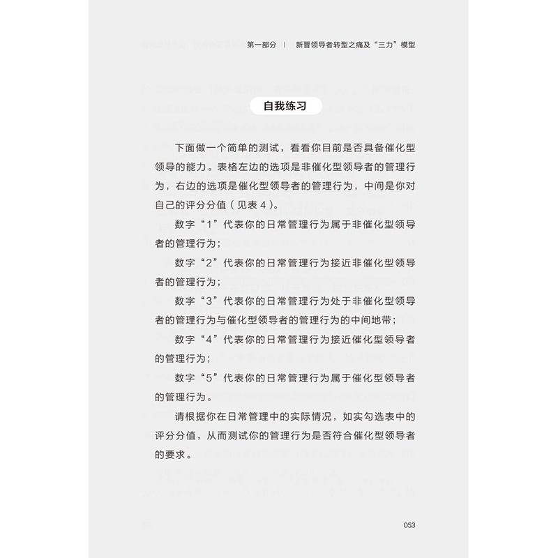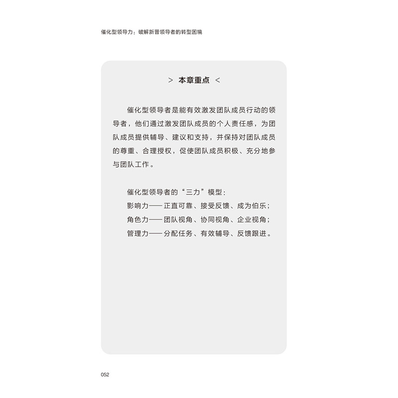 本书作者根据自身20余年的工作经历和实践,以及培训几千位成功转型的新晋领导者的深厚经验,提出新晋领导者要想顺利解决转型困境,首先要成为一种新型的领导者——催化型领导者,同时要具备“影响力、角色力和管理力”,即催化型领导者的“三力”模型。“三力”模型提供了3大管理维度和12个领导技能,可以贯穿新晋领导者的整个领导生涯,并能够帮助新晋领导者掌握必备的思维与技能,在任何时候都能激发整个团队,轻松管人、管事。