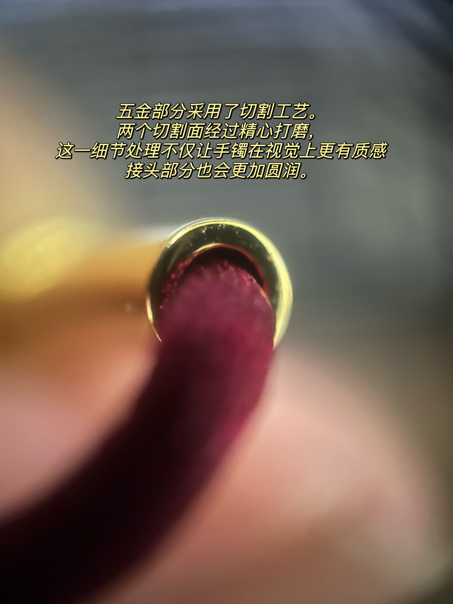 五金部分采用了切割工艺。两个切割面经过精心打磨,这一细节处理不仅让手镯在视觉上更有质感,接头部分也会更加圆润。