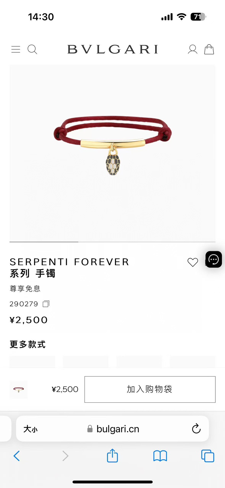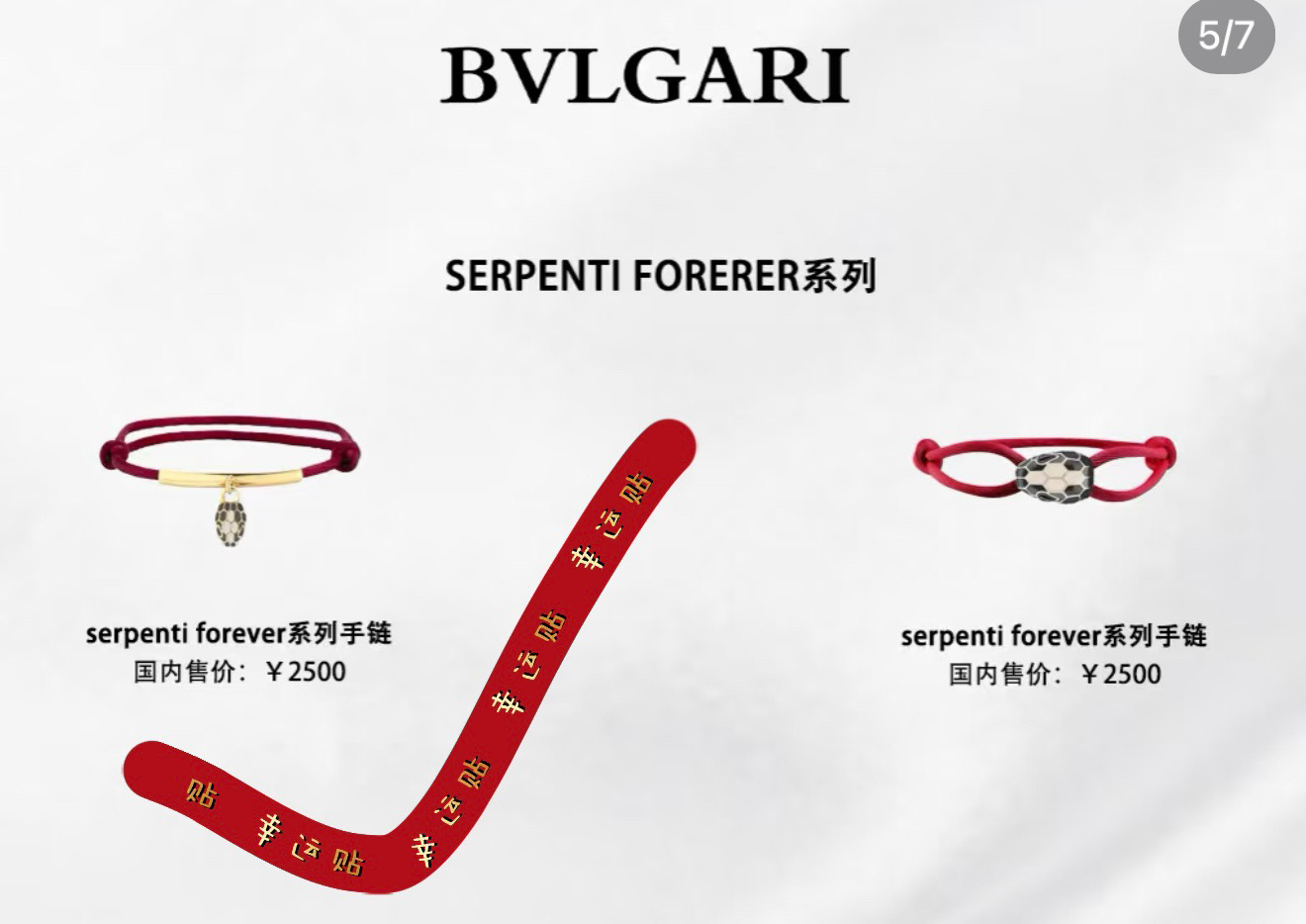 宝格丽蛇年新年红手绳小配饰款,购买记录2500¥;生肖款🔥目前各大专柜基本已经断货。很难买到了!~一直都很风靡的红绳手绳大家是不是都很心动,红色代表着吉祥、好运和幸福等等,所以选择一条适合你的红绳真的会好运连连~尤其本命年的闭入啊~独家订制特种纸全套包装盒!自用、送人都不错!~