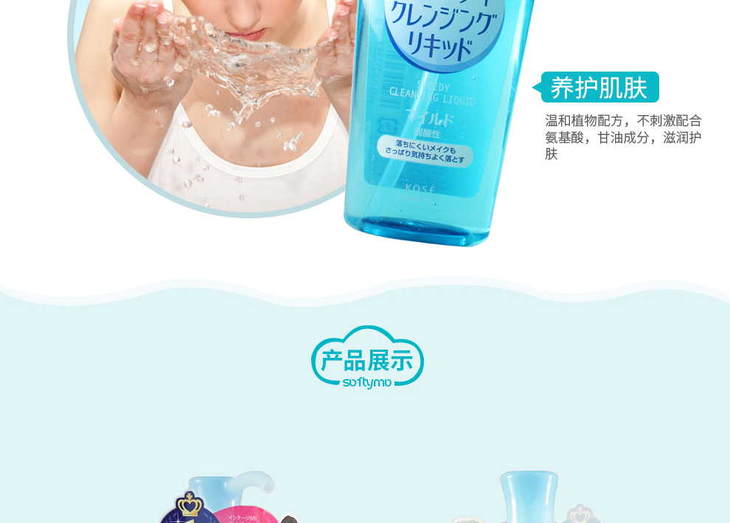 【产品优点】不含矿物油成分,能有效卸除面部及眼部彩妆,它可以深入肌肤细微深处,轻易将囤积在毛孔内的彩妆、污垢及脸部老旧角质去除,让你的脸清清爽爽不紧绷,甩掉壹日的负担。添加天然融油去黑头,卸妆同时清除并有效预纺黑头的生成使肌肤透明细滑。卸妆同时养护肌肤,帮助肌肤维持稳定及健康状态,增强肌肤抵抗力。用后肌肤清爽柔软,不油腻、成份温和,不会刺激您细嫩脆弱的肌肤,适合任何肤质使用。