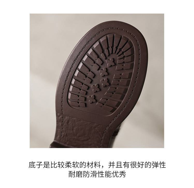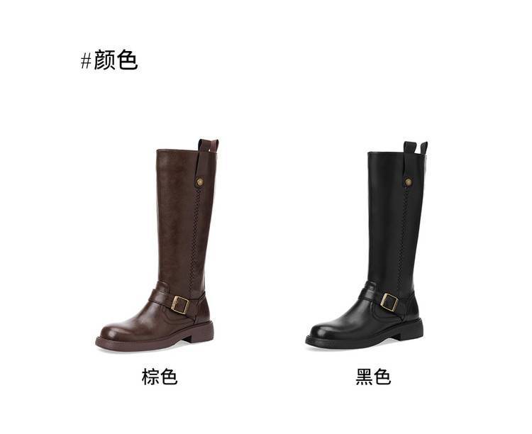 3.5cm~美拉德风真皮高筒靴,皮带扣骑士靴不过膝长靴粗跟棕色编织OLD-w1-22