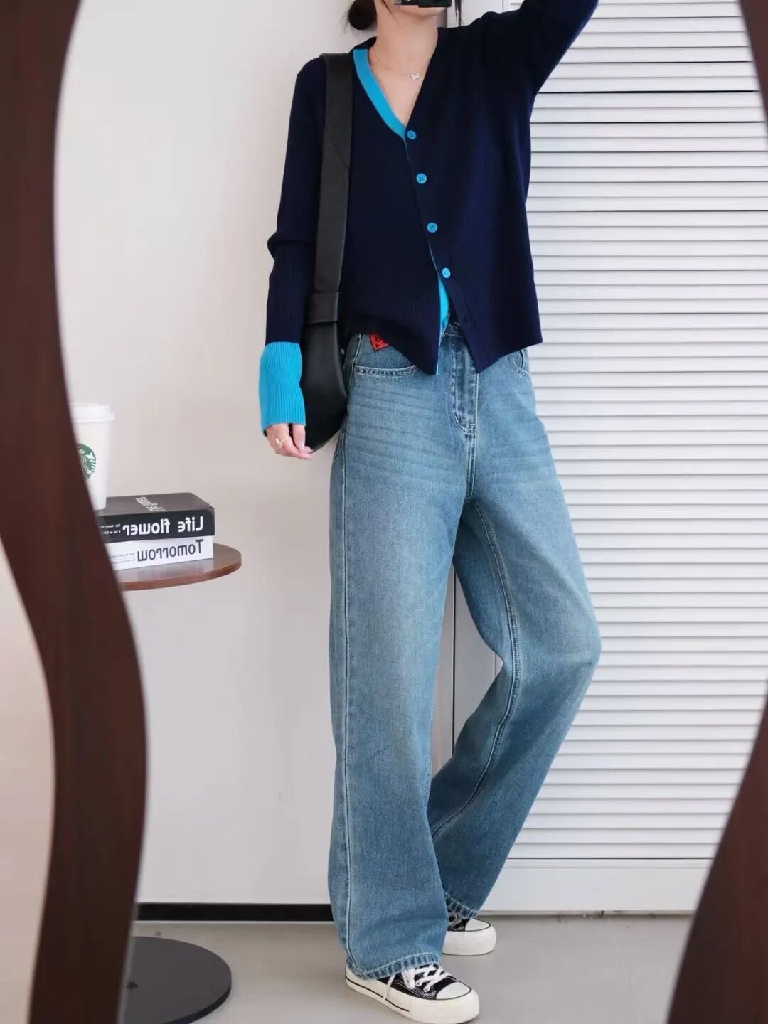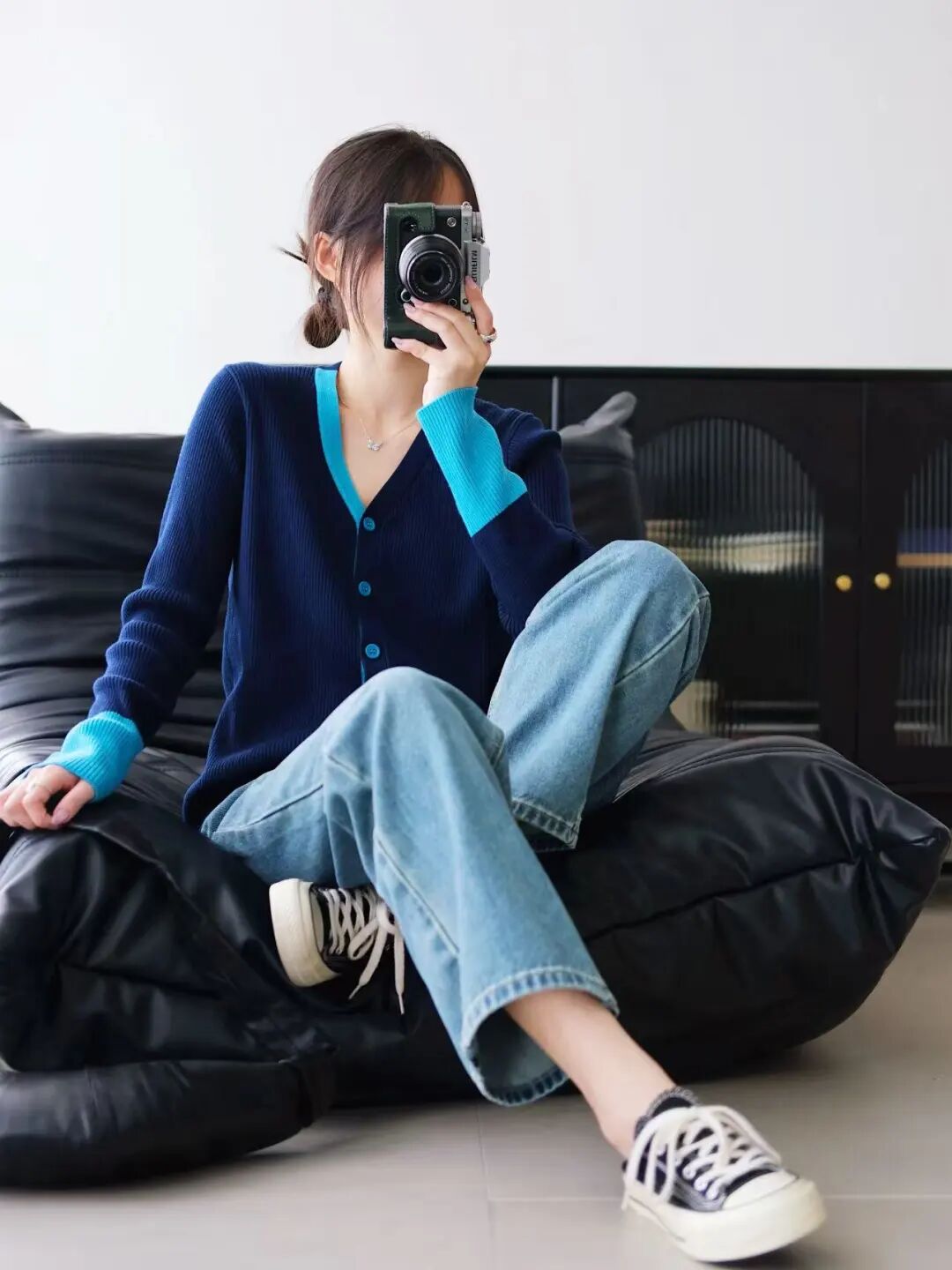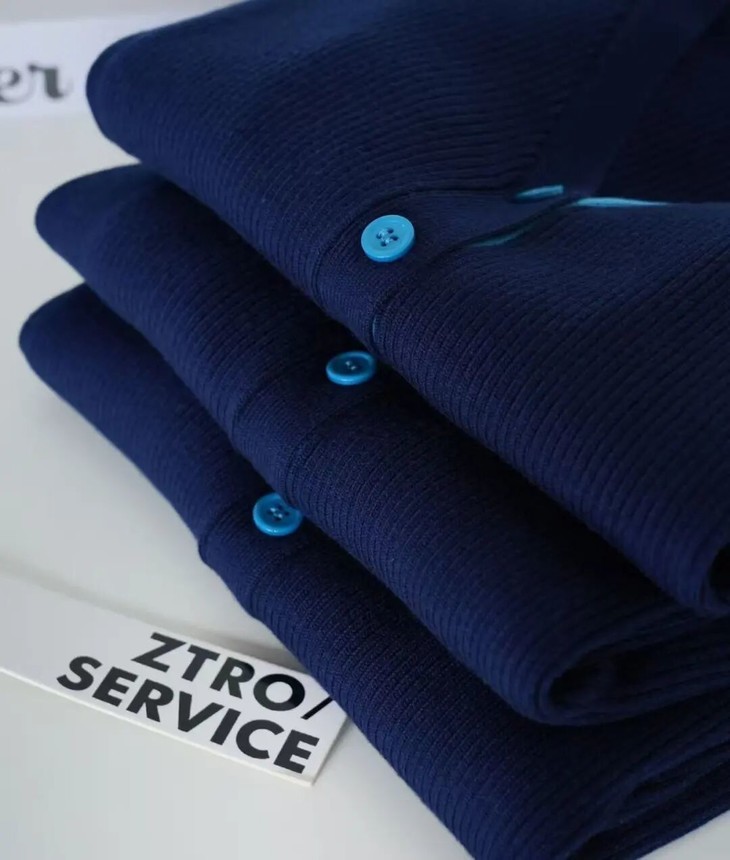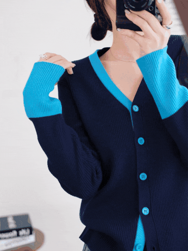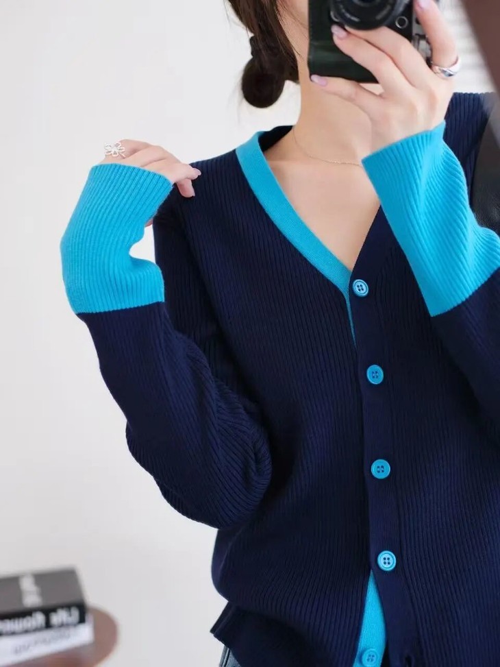 简洁的V领收腰线条,化解整体素雅的感觉。领口➕袖口➕门襟纽扣撞色设计🧶一方面丰富视觉美感 ,纵向延伸身体线条
