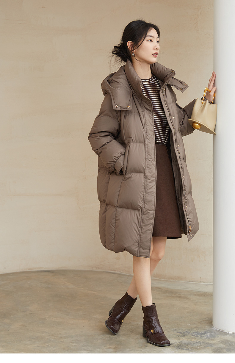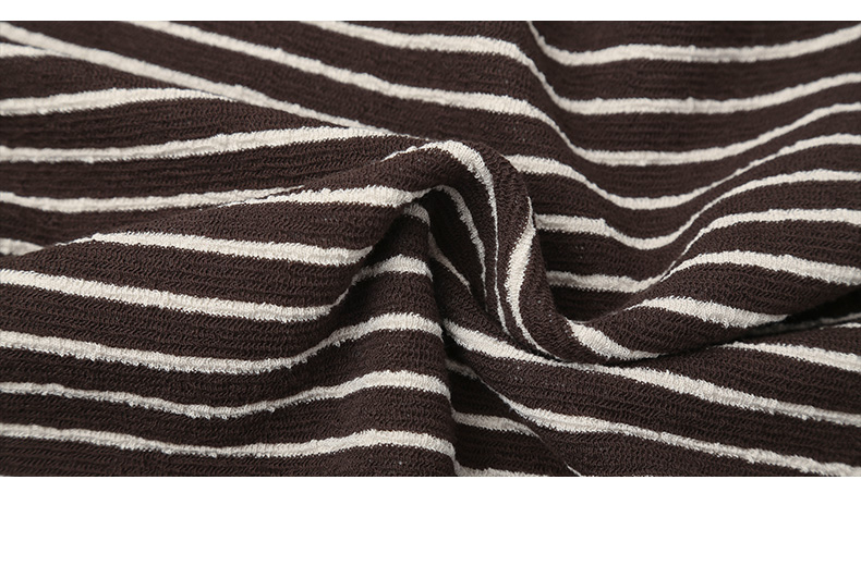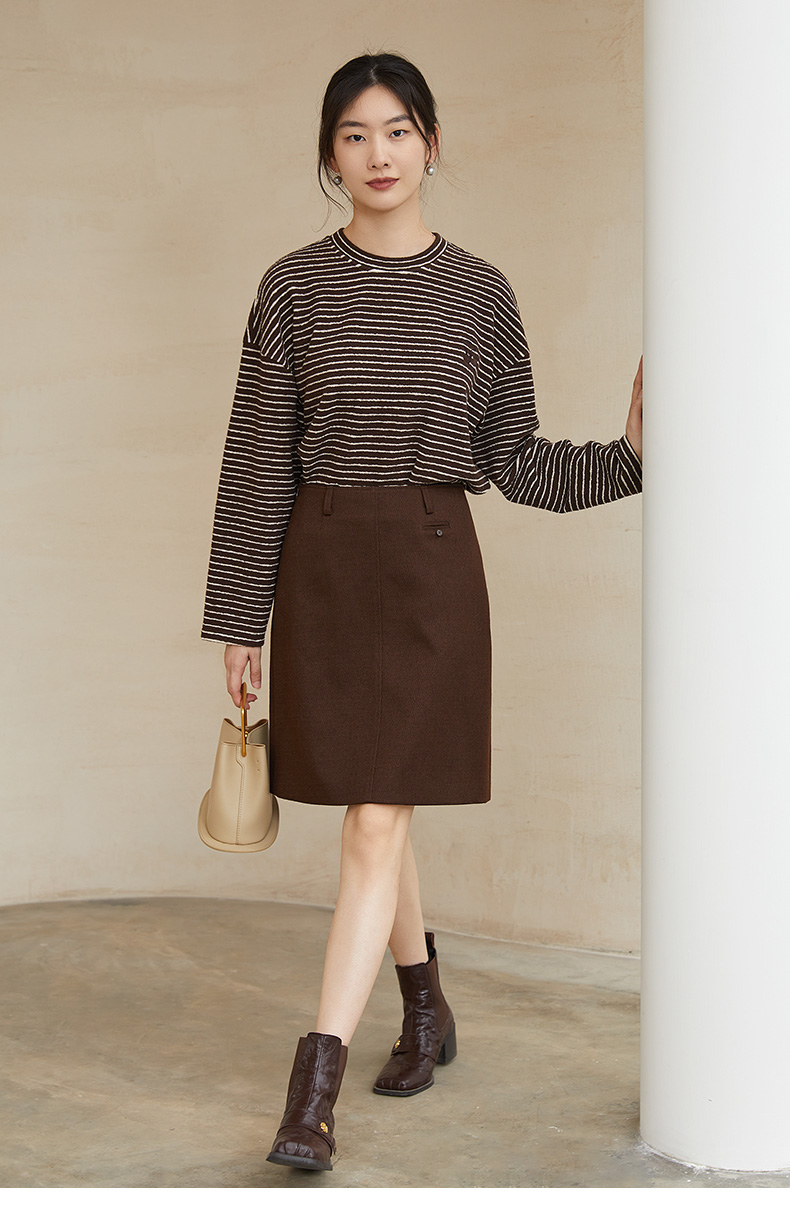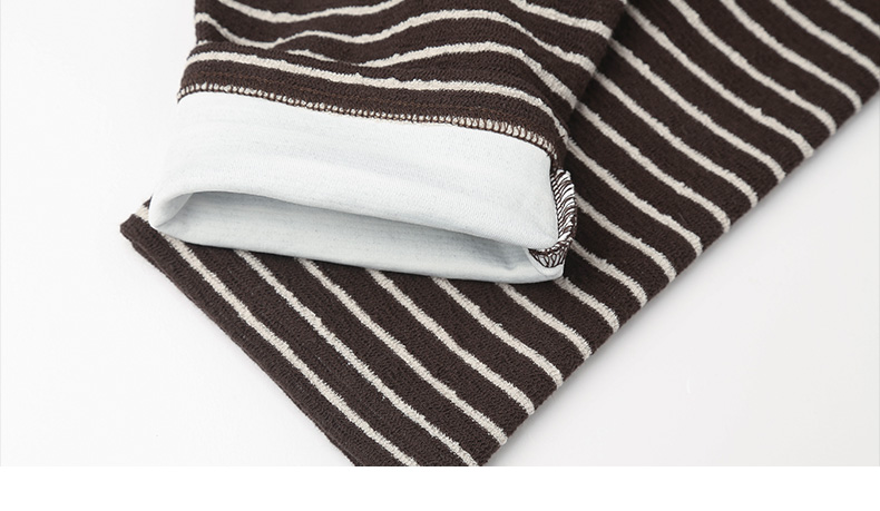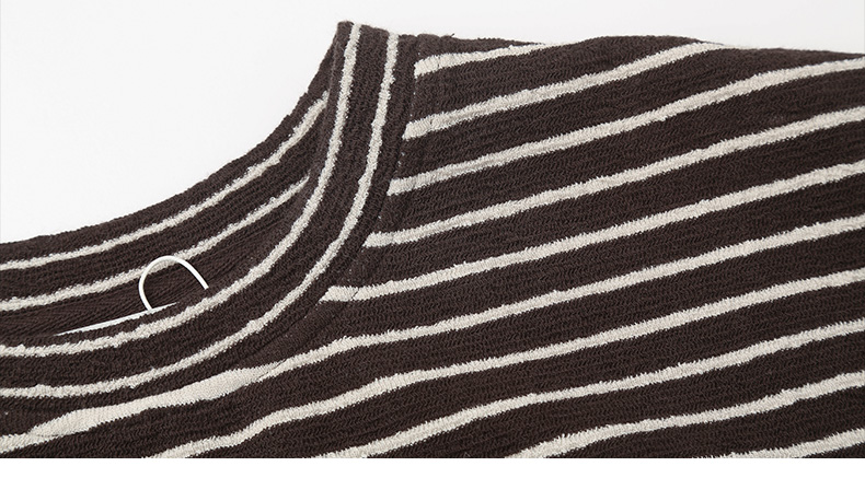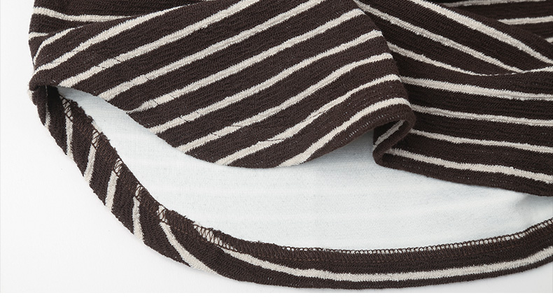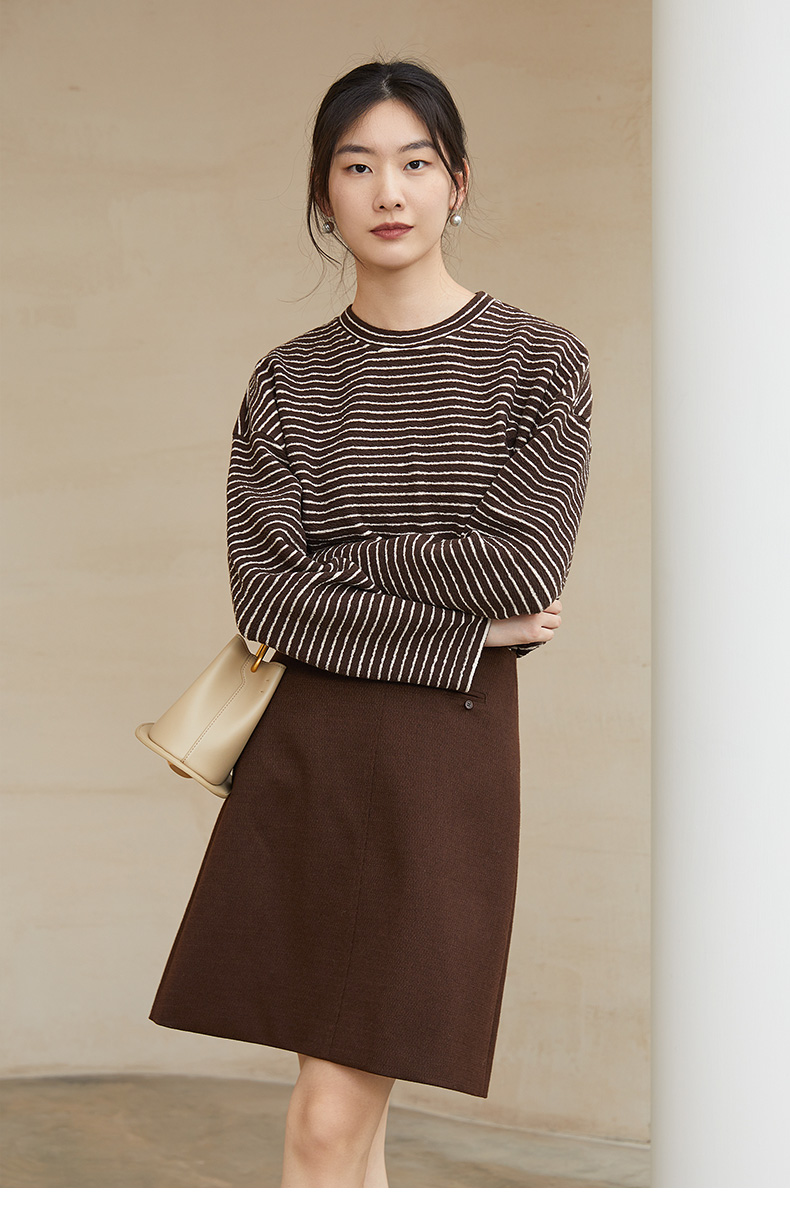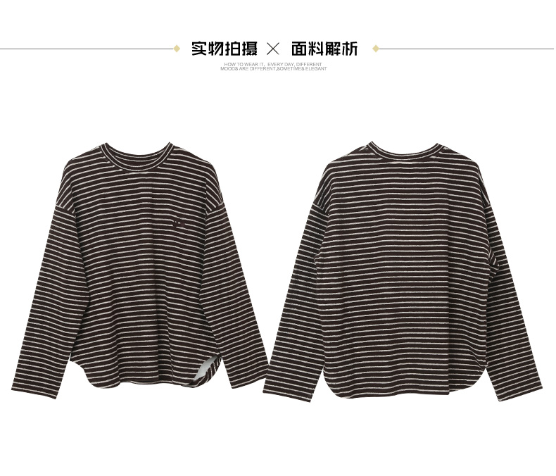 深棕米白细条纹宽松长袖针织衫 圆领小标装饰侧开叉显瘦休闲秋冬通勤慵懒风打底上衣
