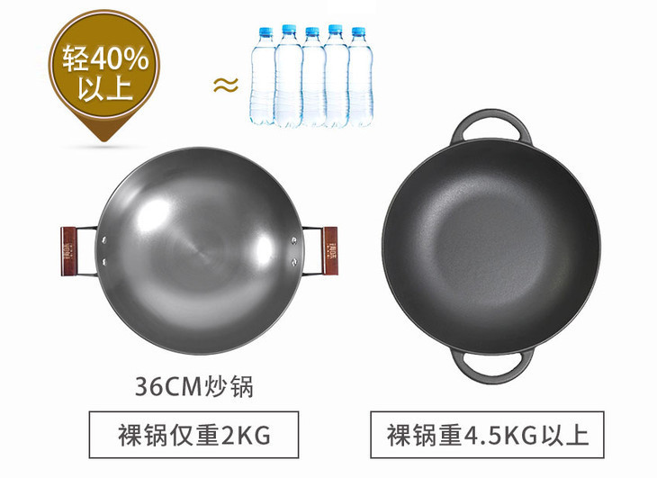 锅壁做得非常薄,所以锅身轻,裸锅只有2kg,比同尺寸的铁锅轻40%。