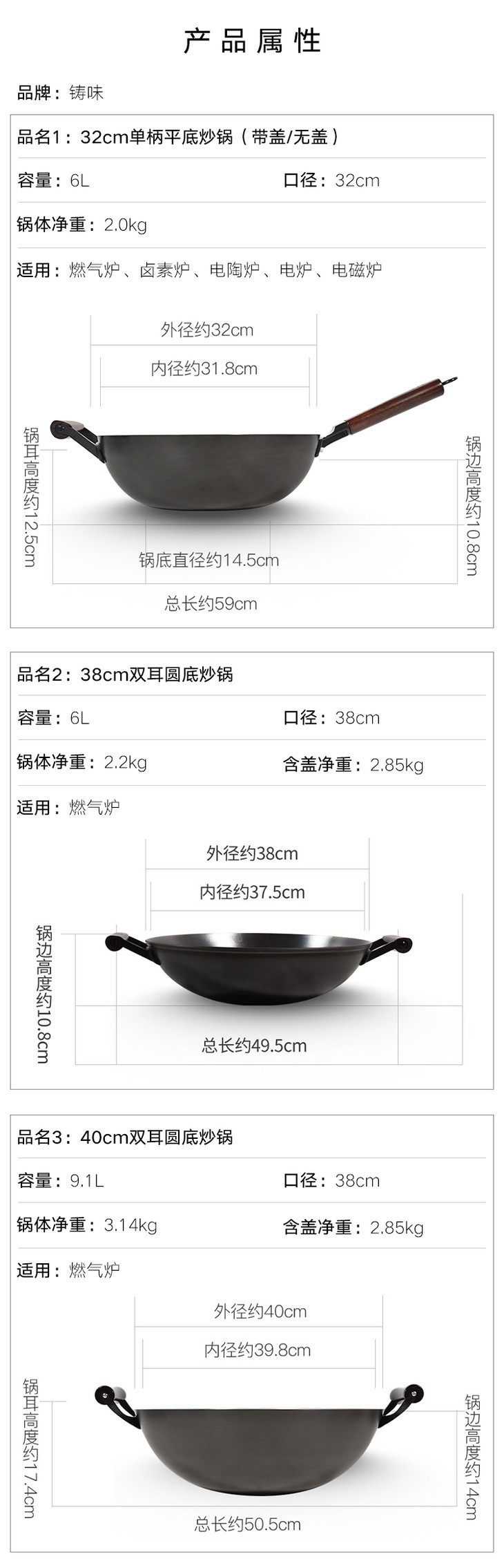 双耳锅:口径有38cm和40cm可选,锅深10.9cm,圆底,带盖。