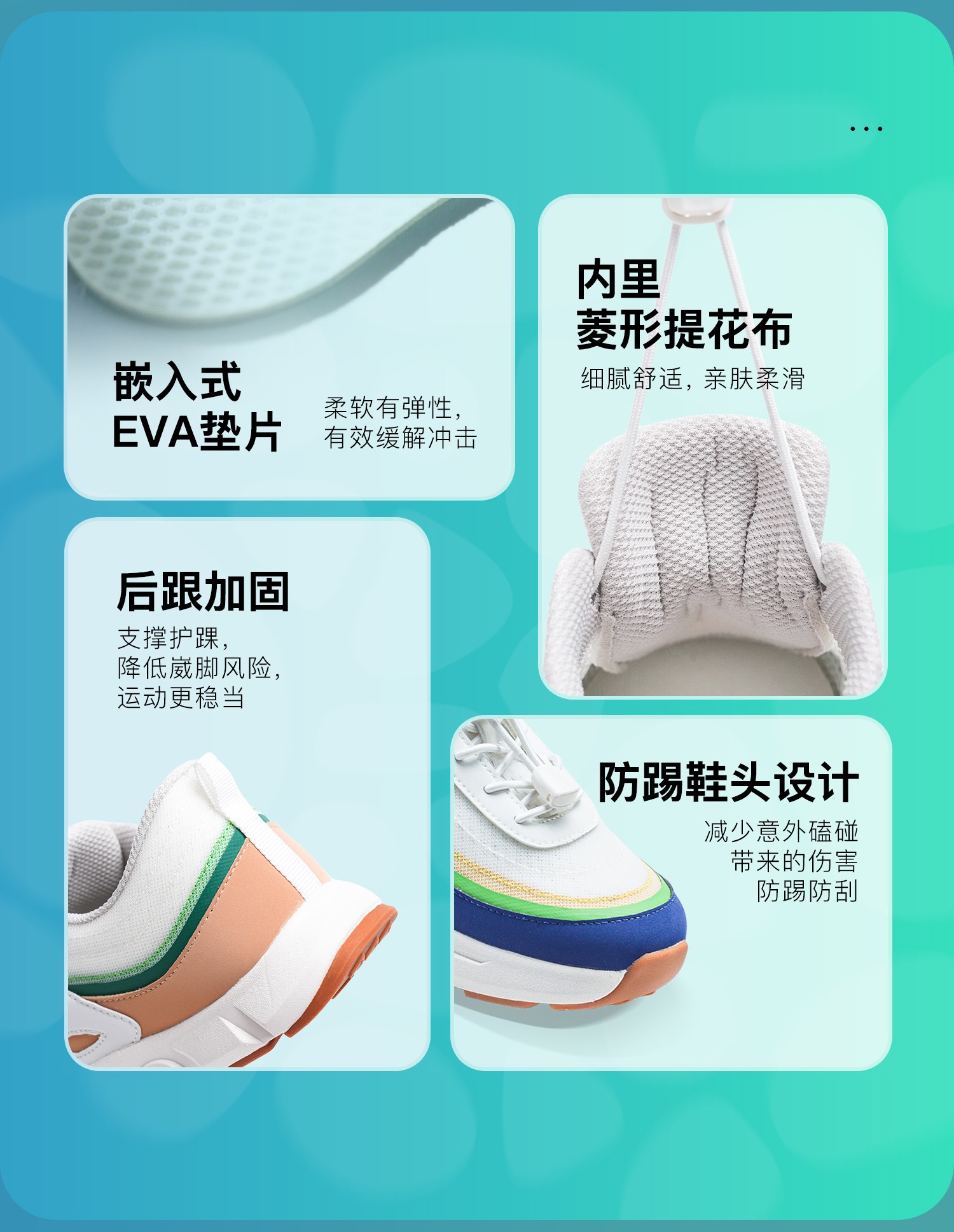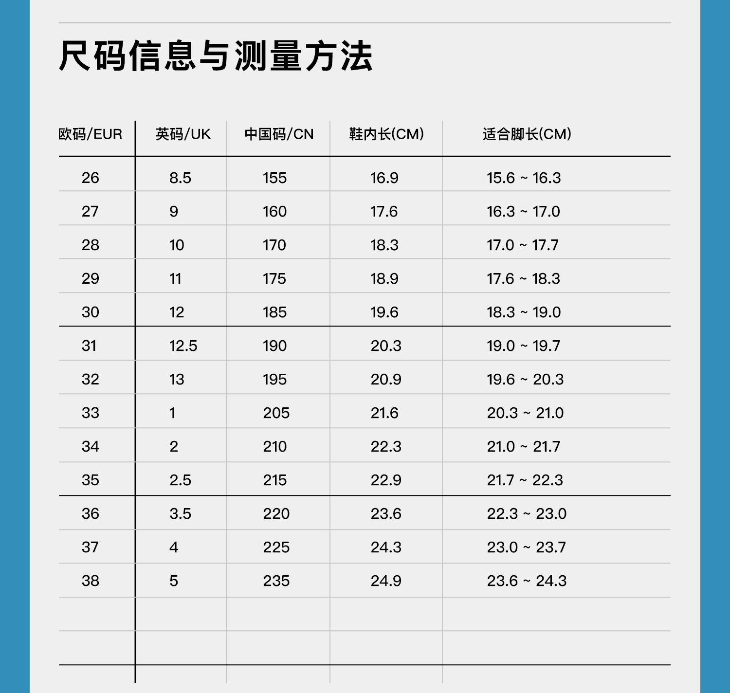 2、鞋内标签:UK对应尺码表的英码,EUR对应尺码表的欧码,CN为中国尺码,因宝宝脚丫胖瘦高矮不一,不建议参考中国尺码选择,且CN不在尺码表呈现。(可参考尺码表适合脚长的范围进行选择)