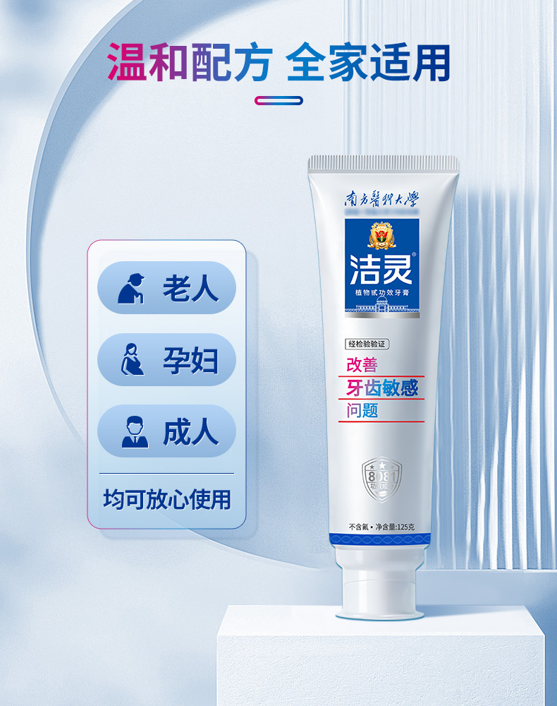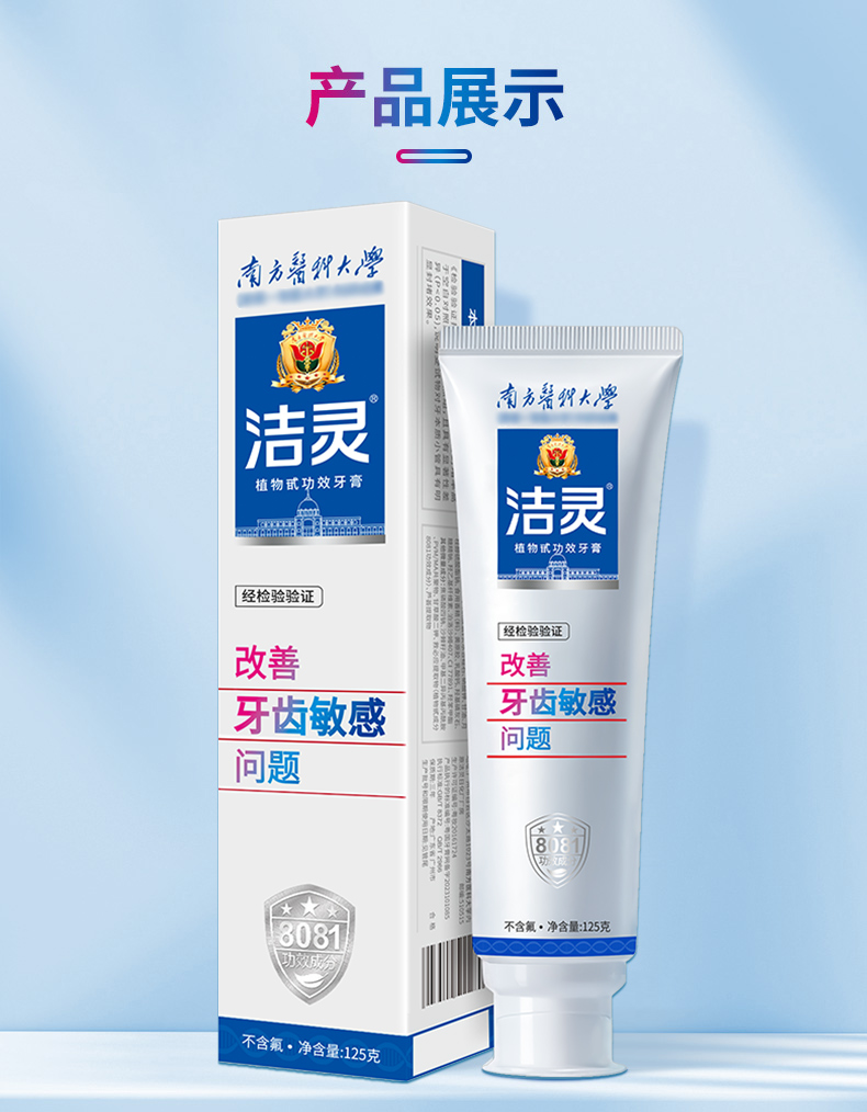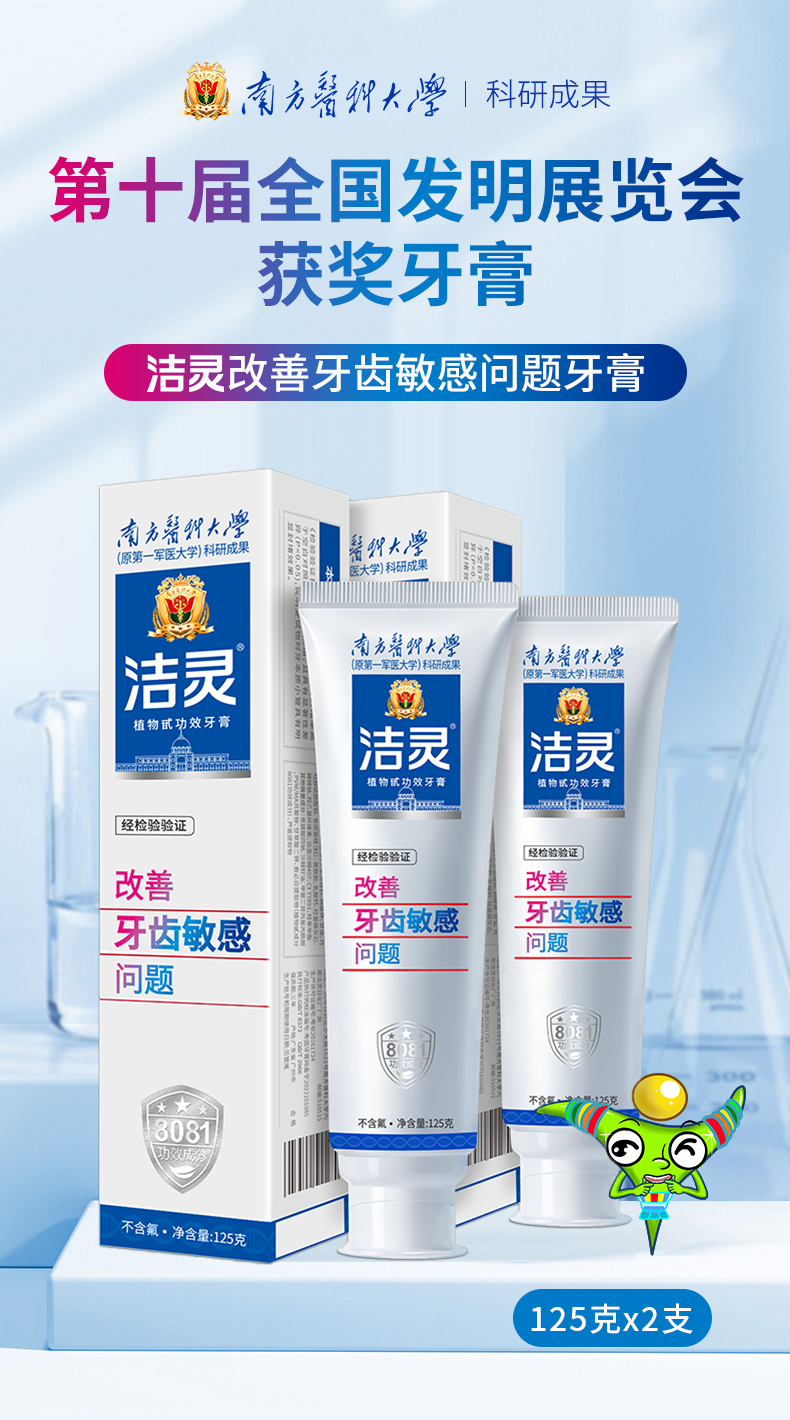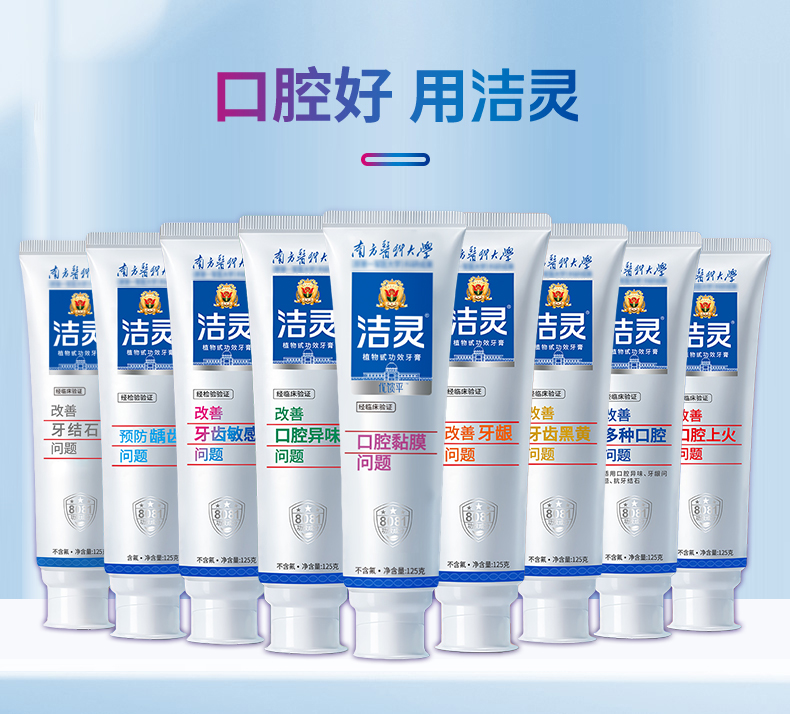 - 洁灵牙膏,由南方医科大学研制,牙膏的核心8081功效成分效果出众,在第十届全国发明展览会成为获奖牙膏。
