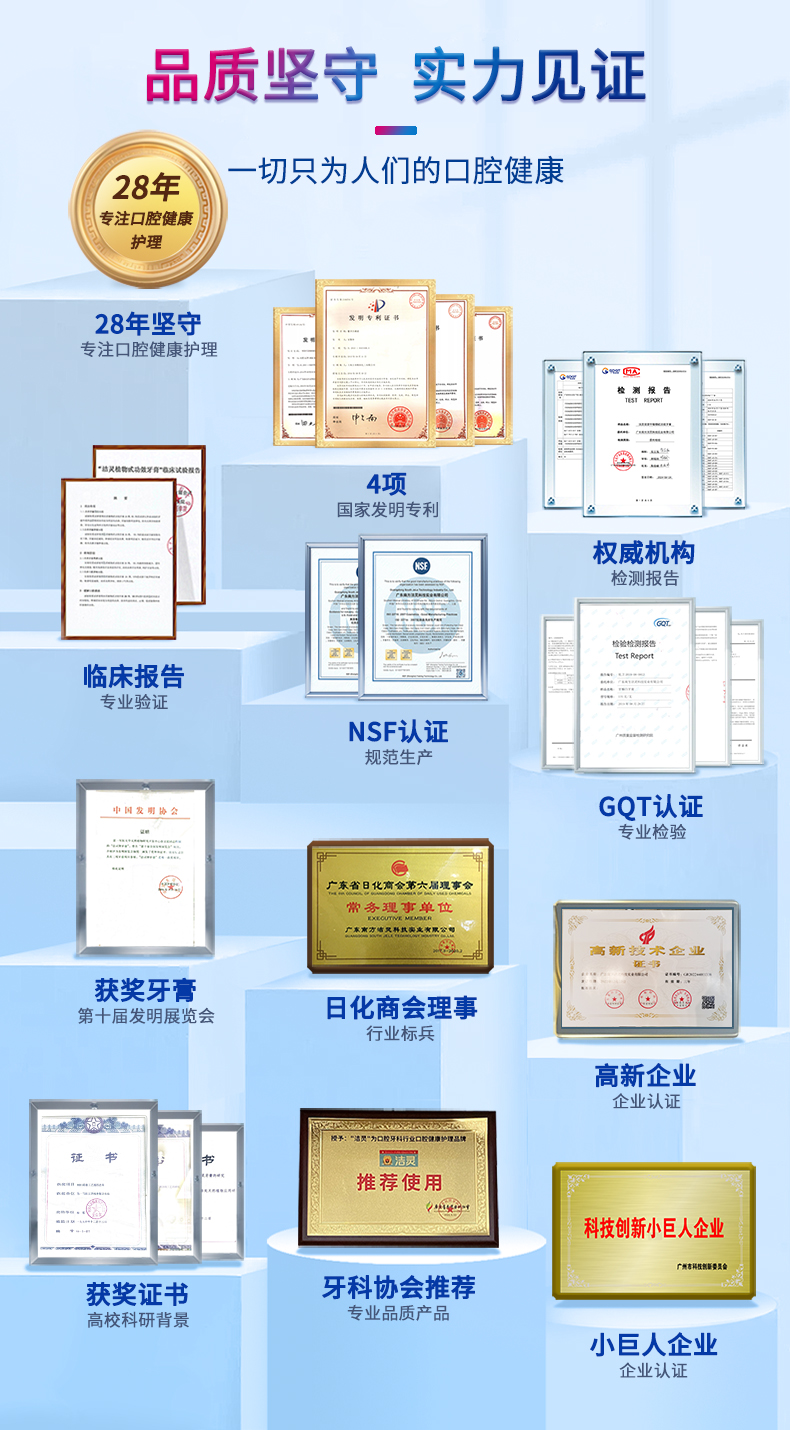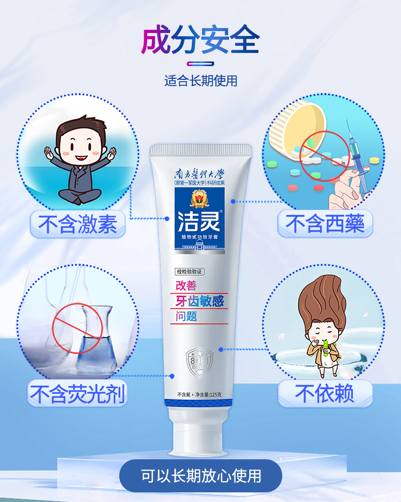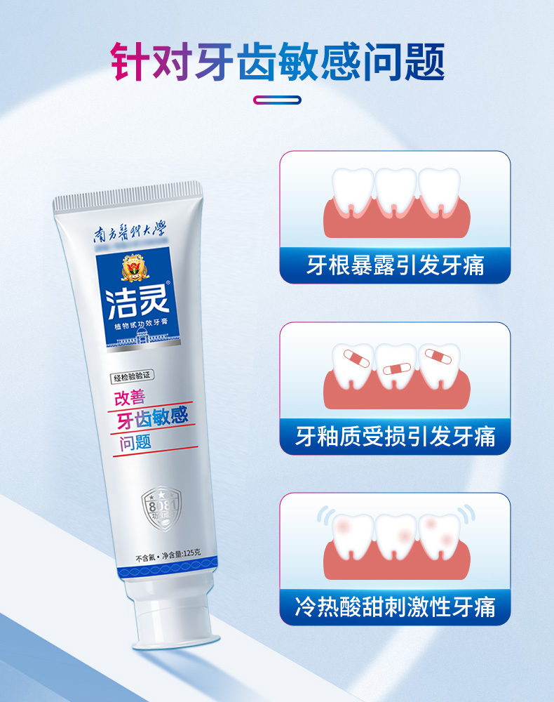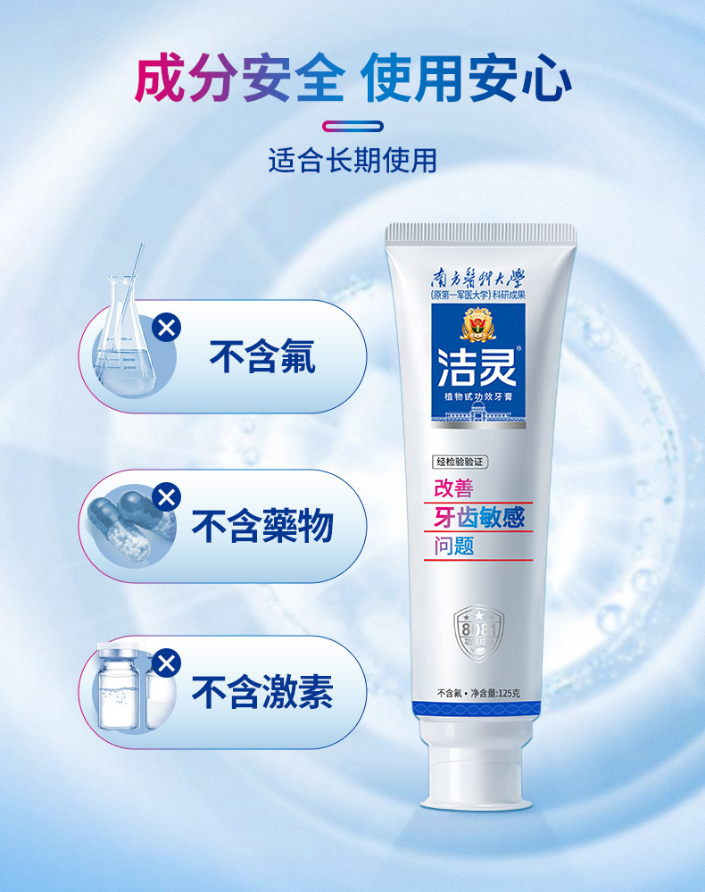 - 洁灵牙膏,由南方医科大学研制,牙膏的核心8081功效成分效果出众,在第十届全国发明展览会成为获奖牙膏。