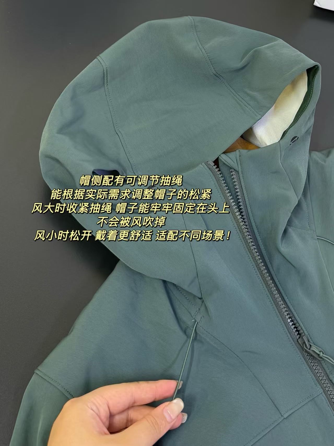 下摆配有可调节抽绳 能根据天气和活动状态调整下摆松紧 收紧时可增强防风效果 松开时能增加透气性 灵活应对不同情况!
