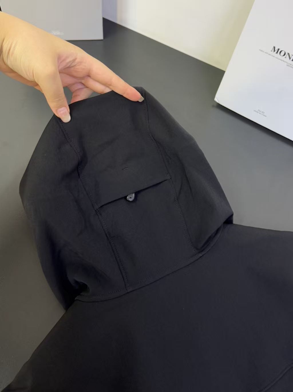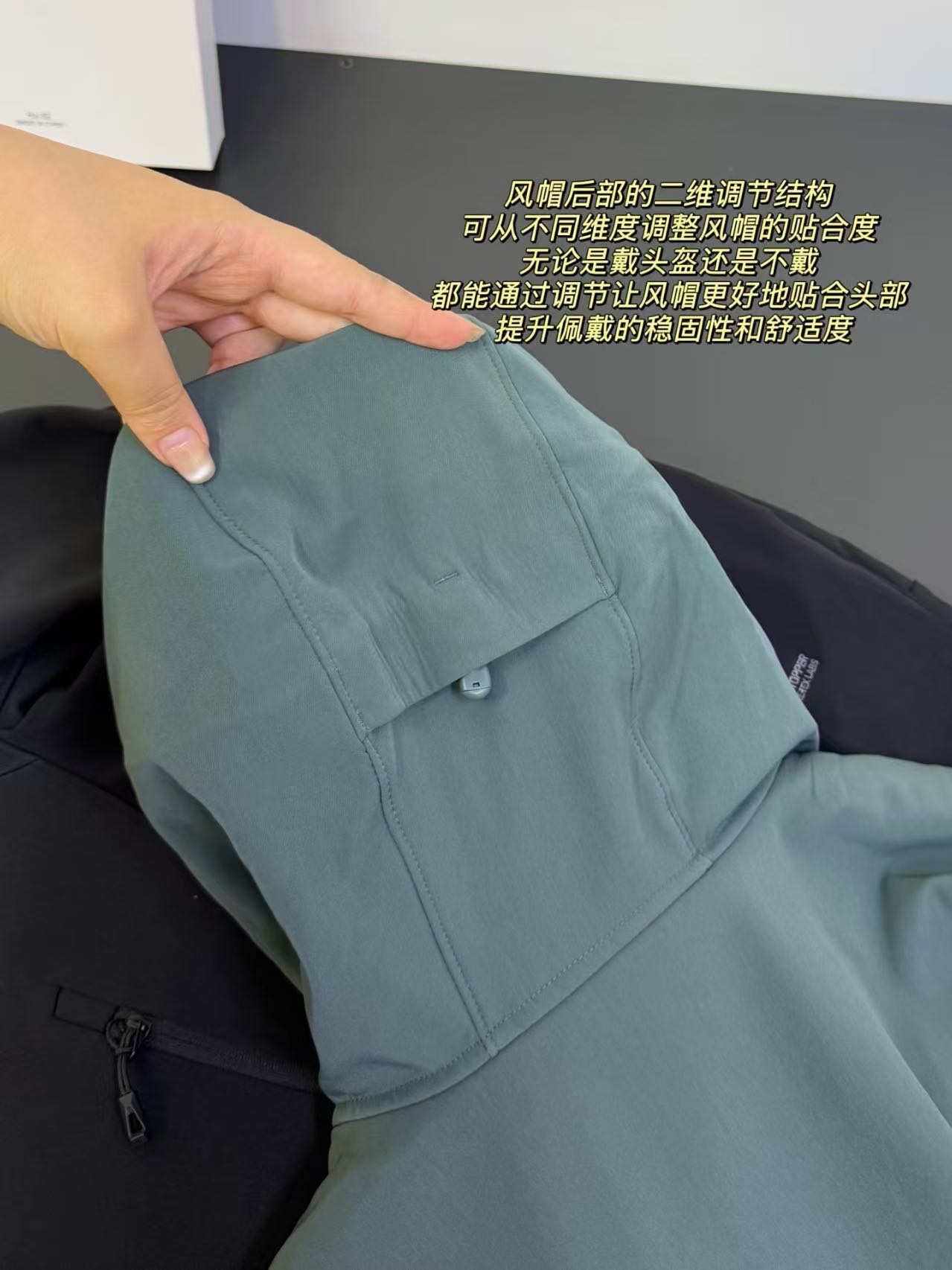 风帽后部的二维调节结构 可从不同维度调整风帽的贴合度 无论是戴头盔还是不戴 都能通过调节让风帽更好地贴合头部 提升佩戴的稳固性和舒适度