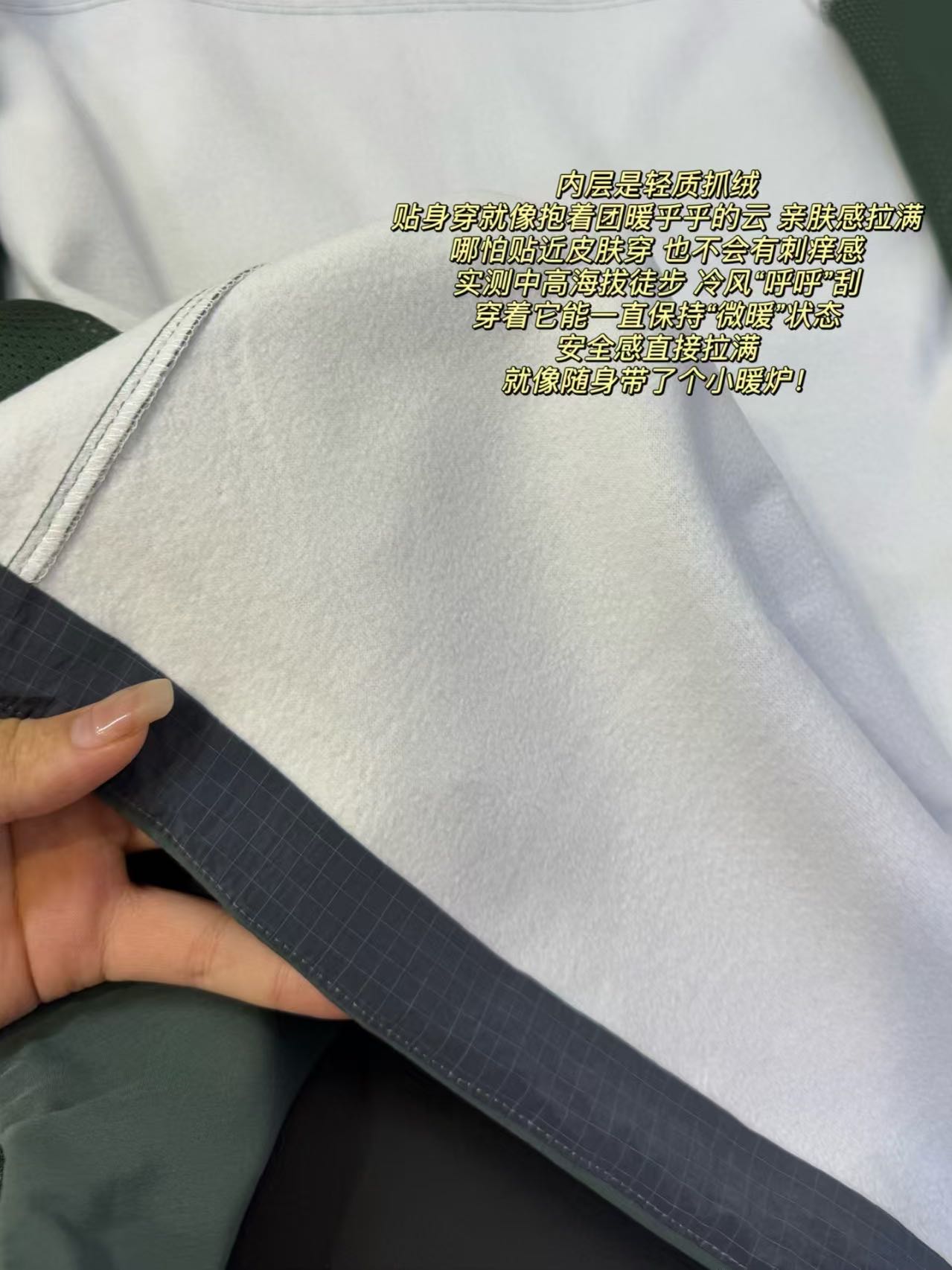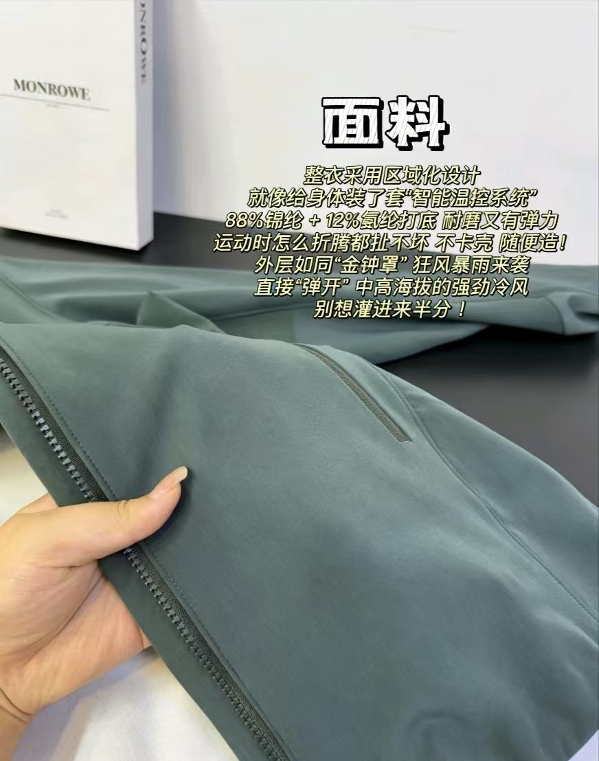 外层如同“金钟罩” 狂风暴雨来袭 直接“弹开” 中高海拔的强劲冷风 别想灌进来半分 !内层是轻质抓绒 贴身穿就像抱着团暖乎乎的云 亲肤感拉满 哪怕贴近皮肤穿 也不会有刺痒感 实测中高海拔徒步 冷风“呼呼”刮 穿着它能一直保持“微暖”状态~