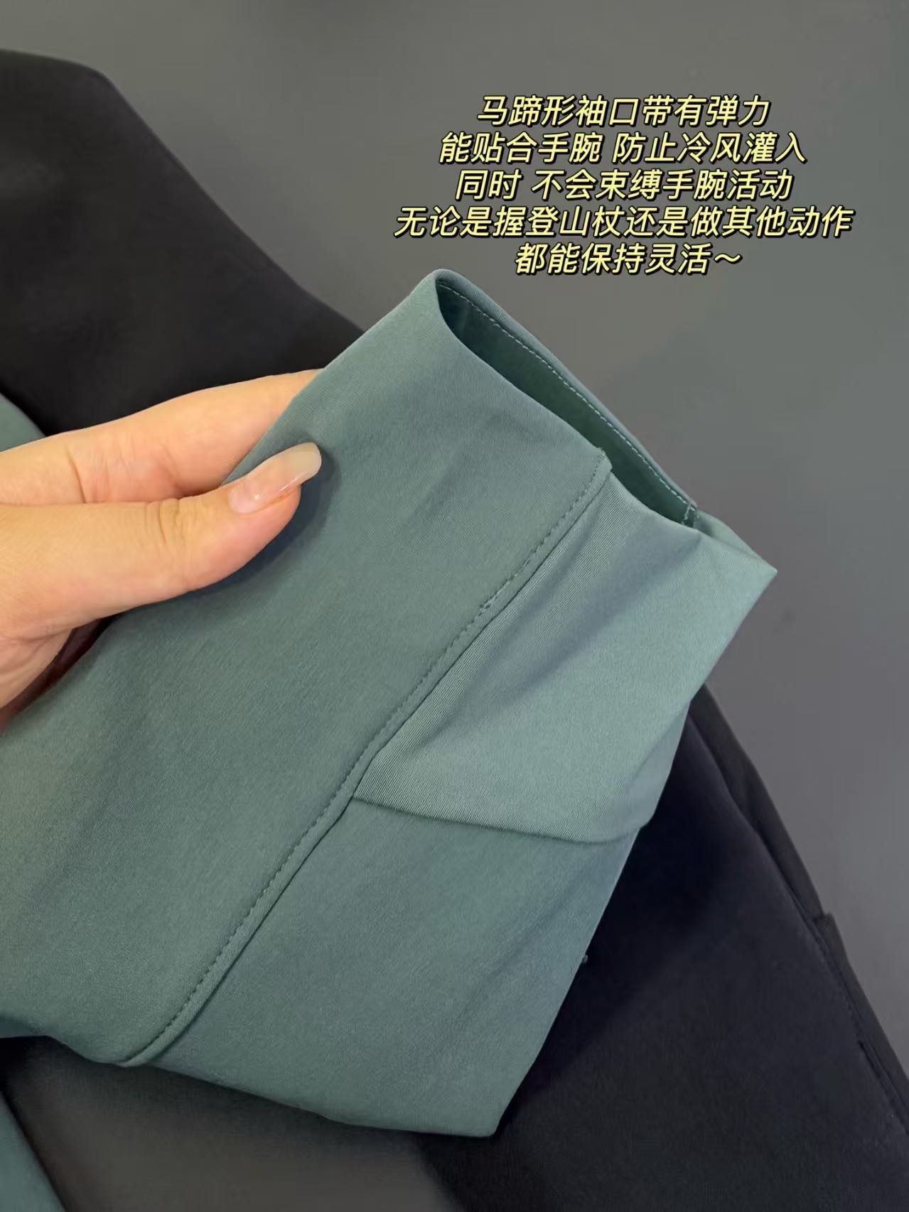马蹄形袖口带有弹力 能贴合手腕 防止冷风灌入 同时 不会束缚手腕活动 无论是握登山杖还是做其他动作 都能保持灵活~