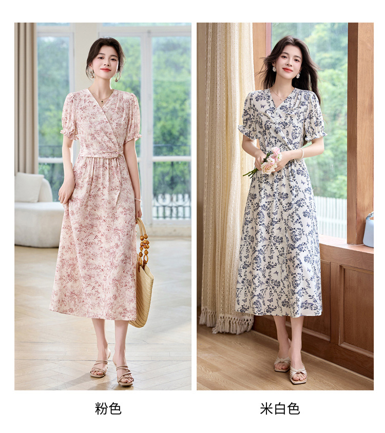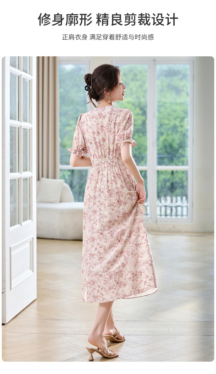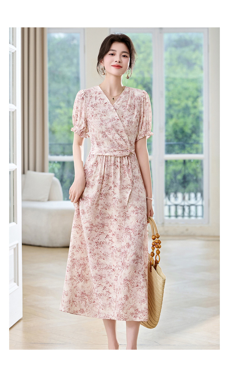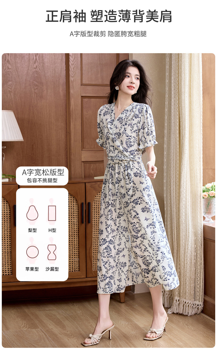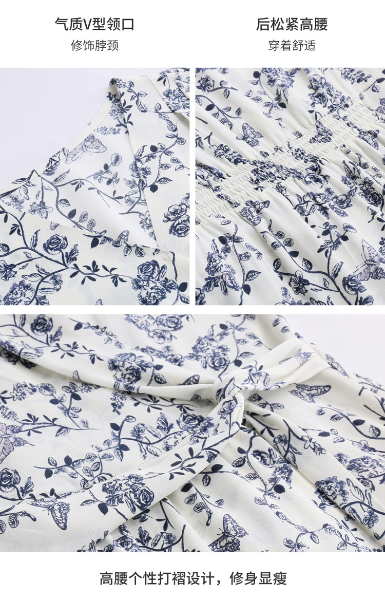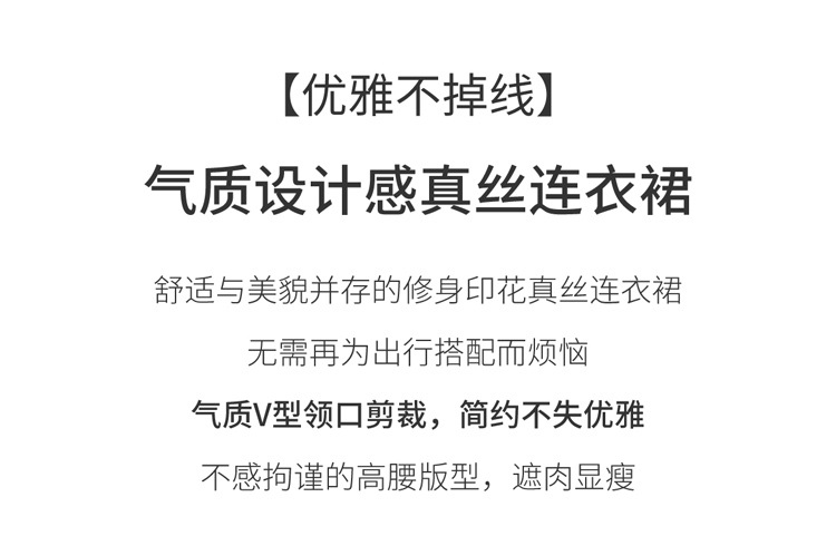ASE夏季新款V领褶皱收腰印花桑蚕丝连衣裙小清新甜美时尚女士裙