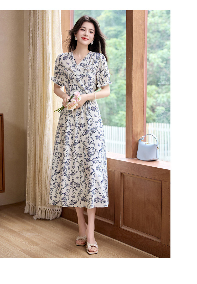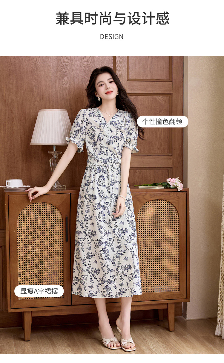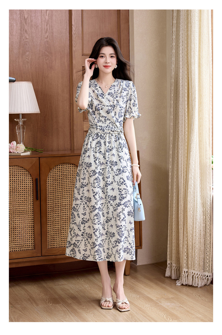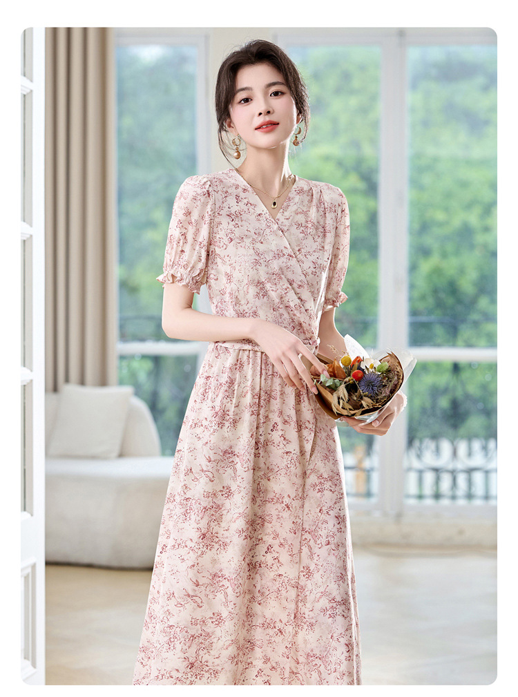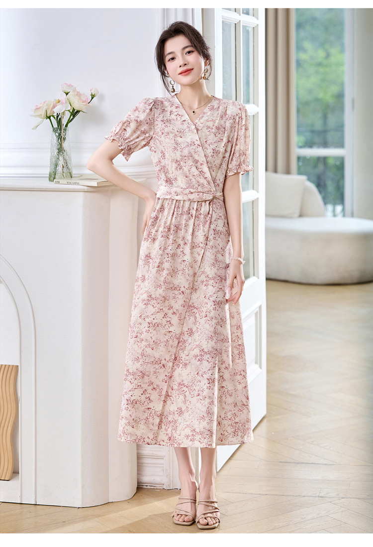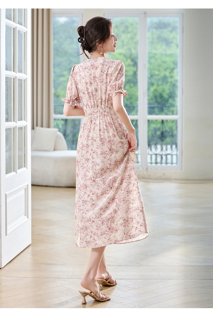 ASE夏季新款V领褶皱收腰印花桑蚕丝连衣裙小清新甜美时尚女士裙